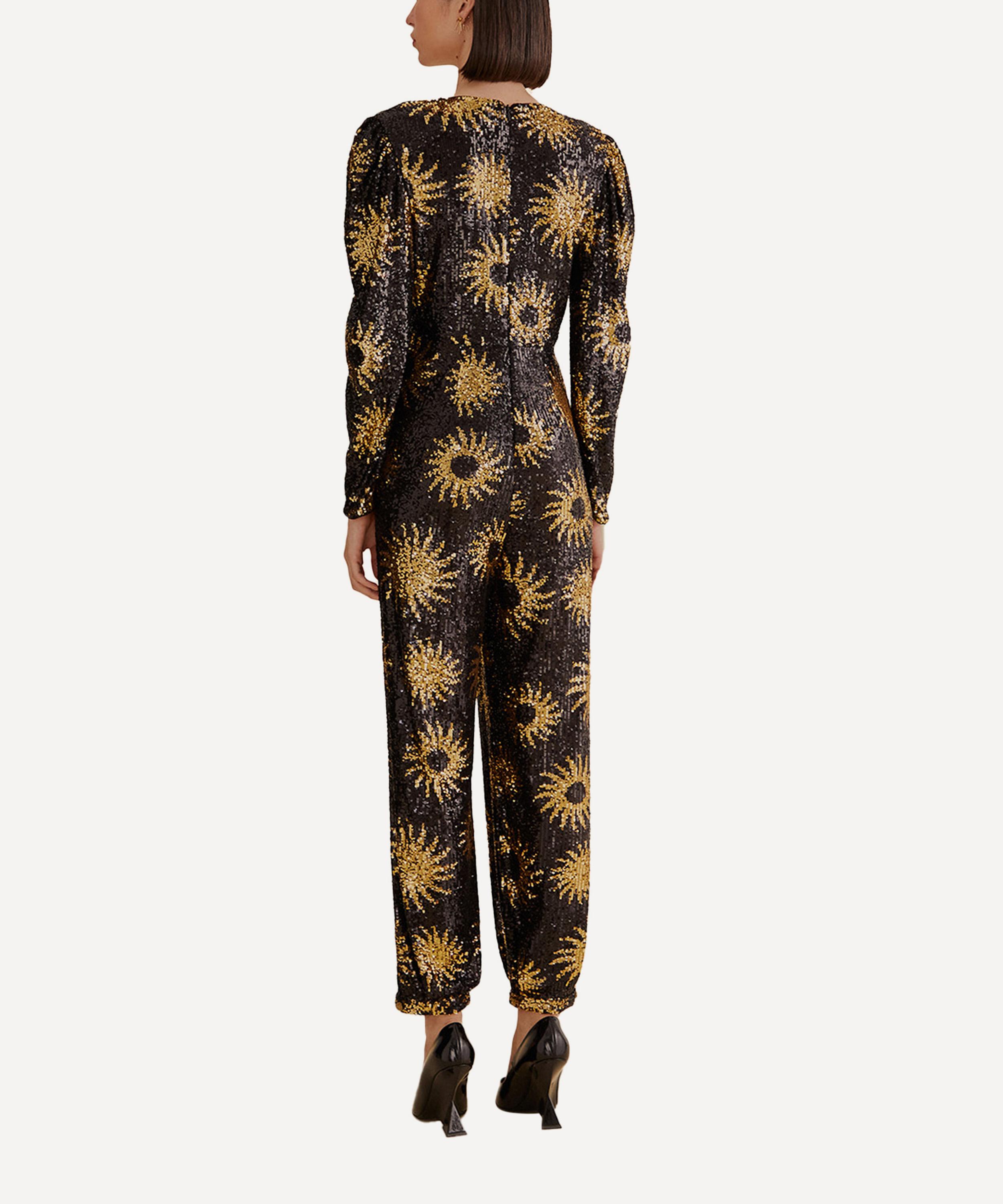 Intricately detailed all-over with shimmering black and gold sequins presenting a sparkling sun pattern, this jumpsuit is a true statement piece with its plunging V-neckline.