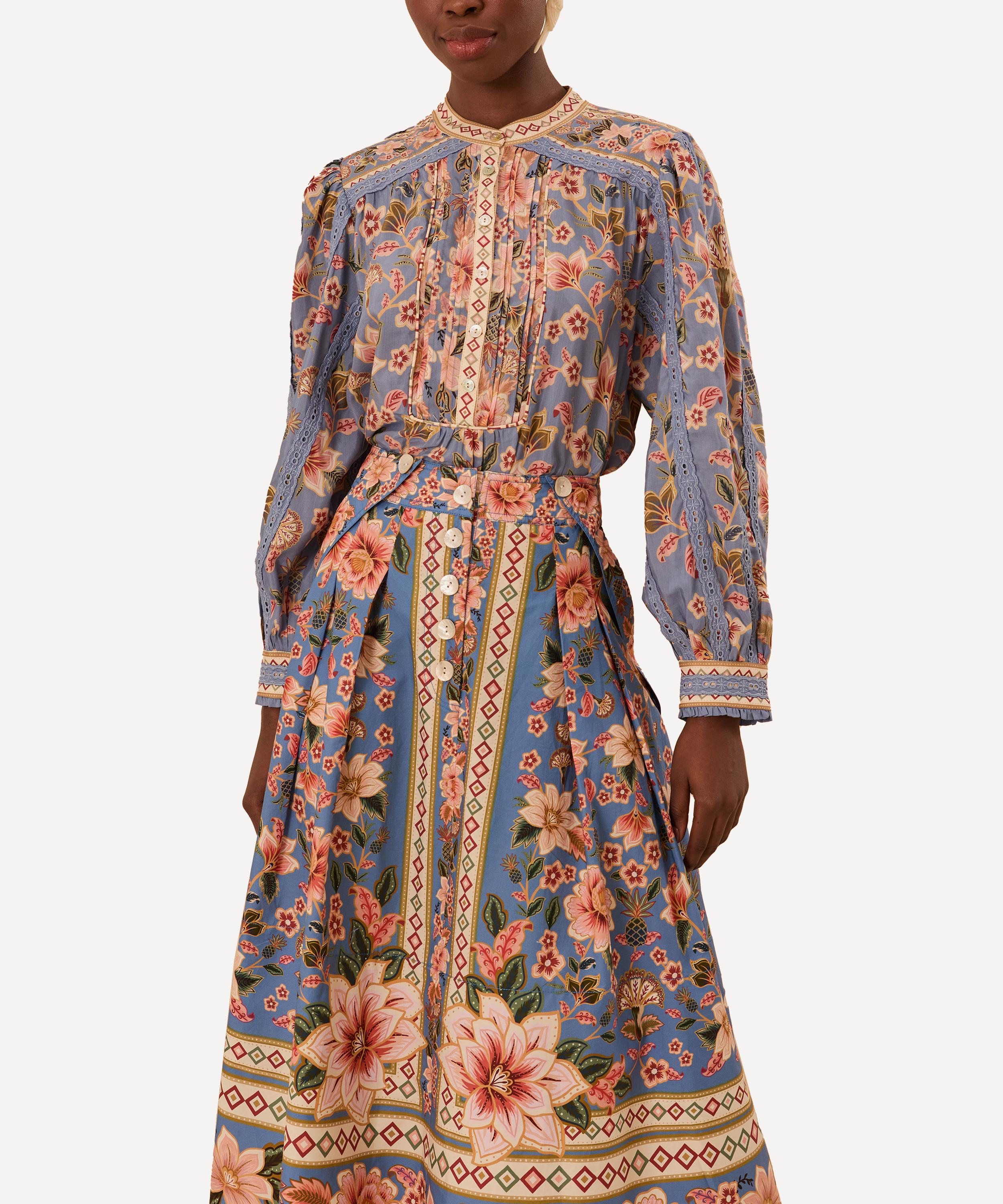 Imbued with a touch of warmth and whimsy, this charming skirt has been cut from ultra-soft cotton with vibrant floral and abstract patterns blossoming against a serene blue backdrop. Finished with button details through the front and a floaty hem that hits at the ankle, it is set to infuse a touch of romance into any look.