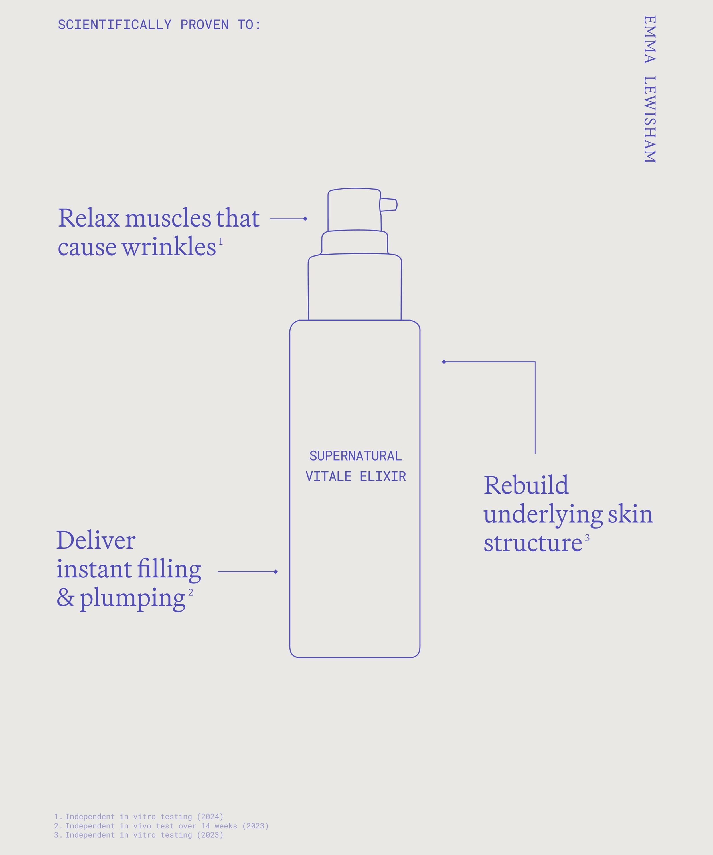 Transform your complexion with Emma Lewisham's Supernatural Vitale Elixir, a next-generation anti-ageing treatment, infused with a cosmeceutical-grade facial muscle relaxant.