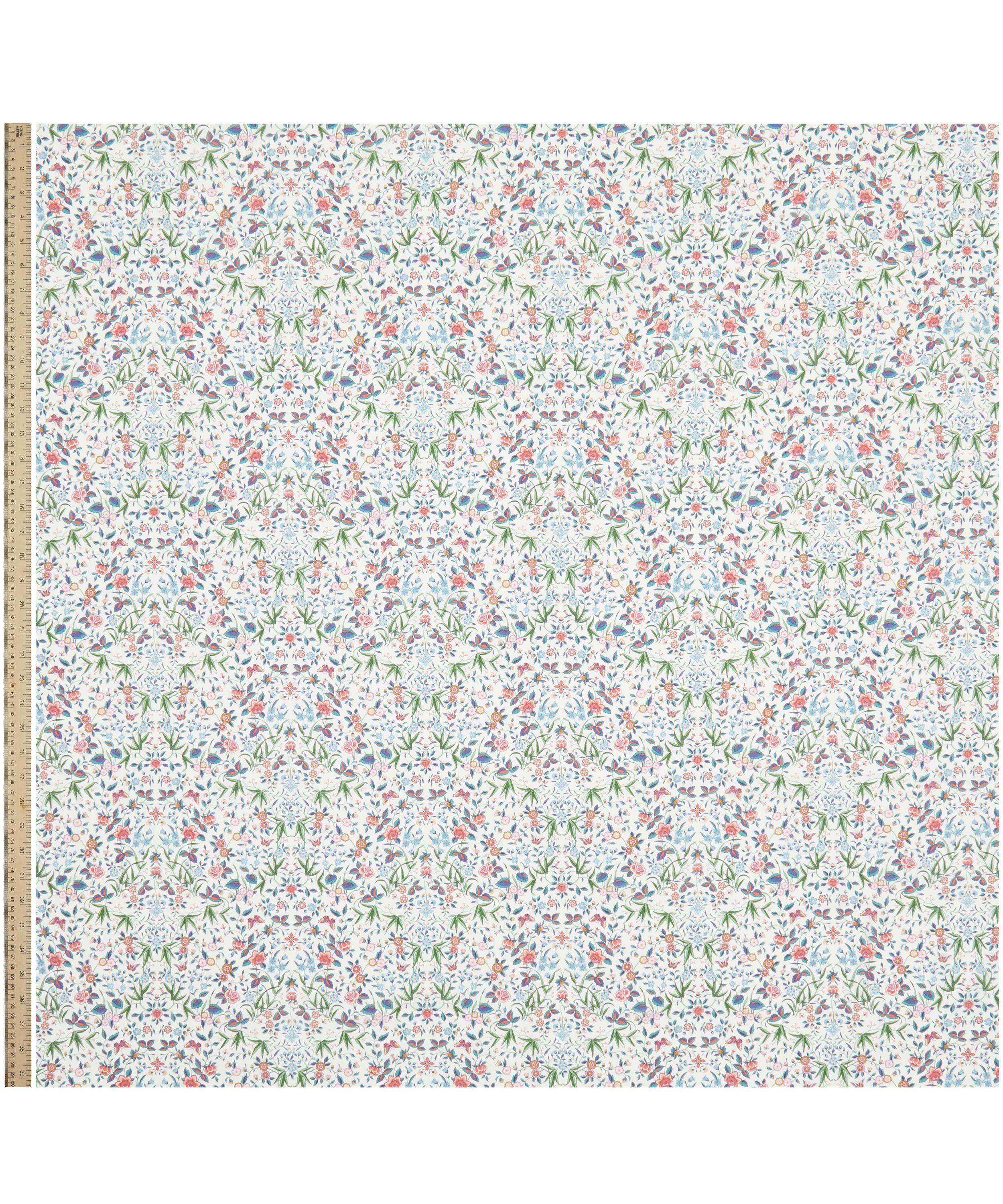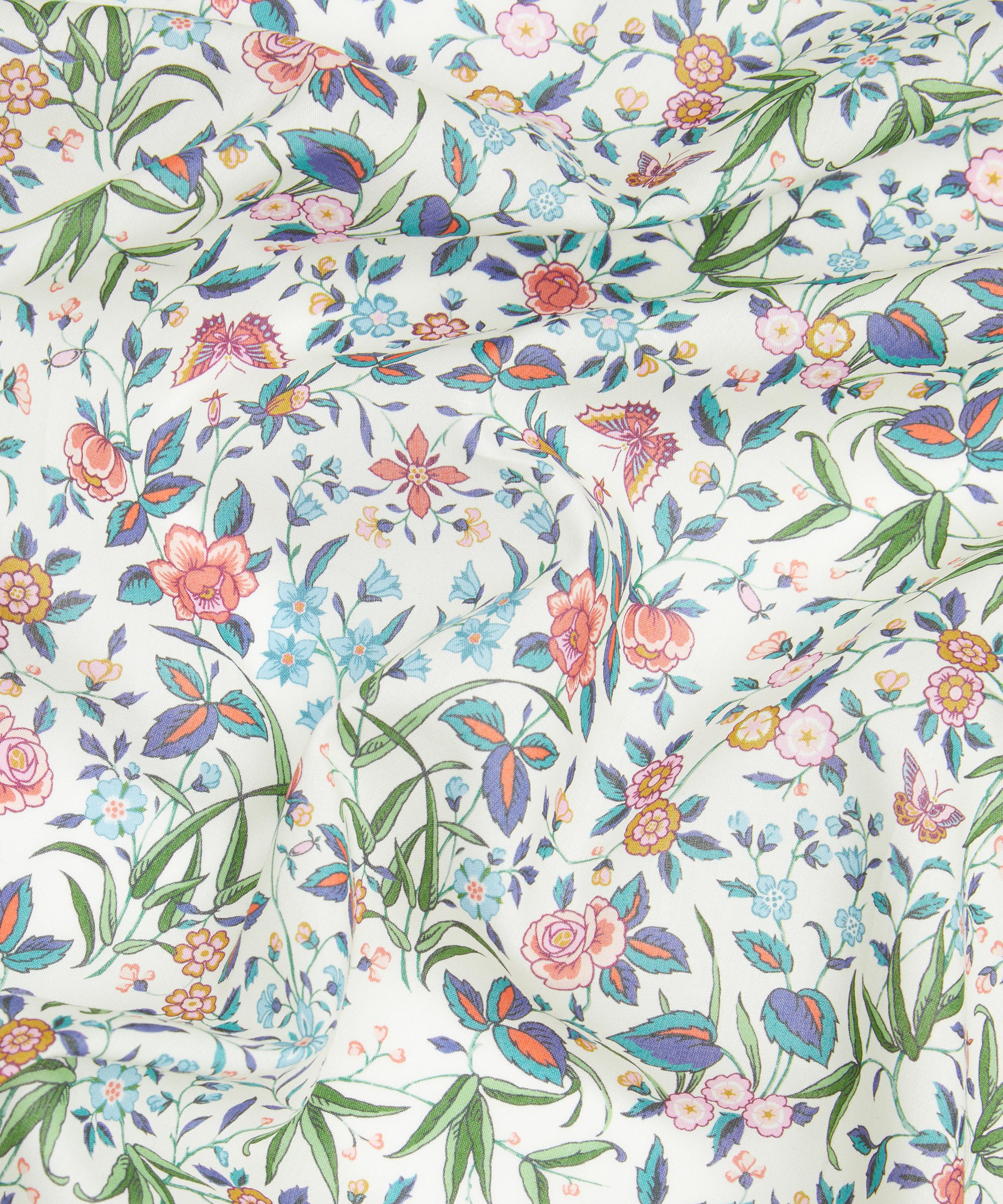 Inspired by an artwork from the Liberty archive, this botanical print features trails of beautifully illustrated flowers, complemented by elegant leaves and colourfully camouflaged butterflies.