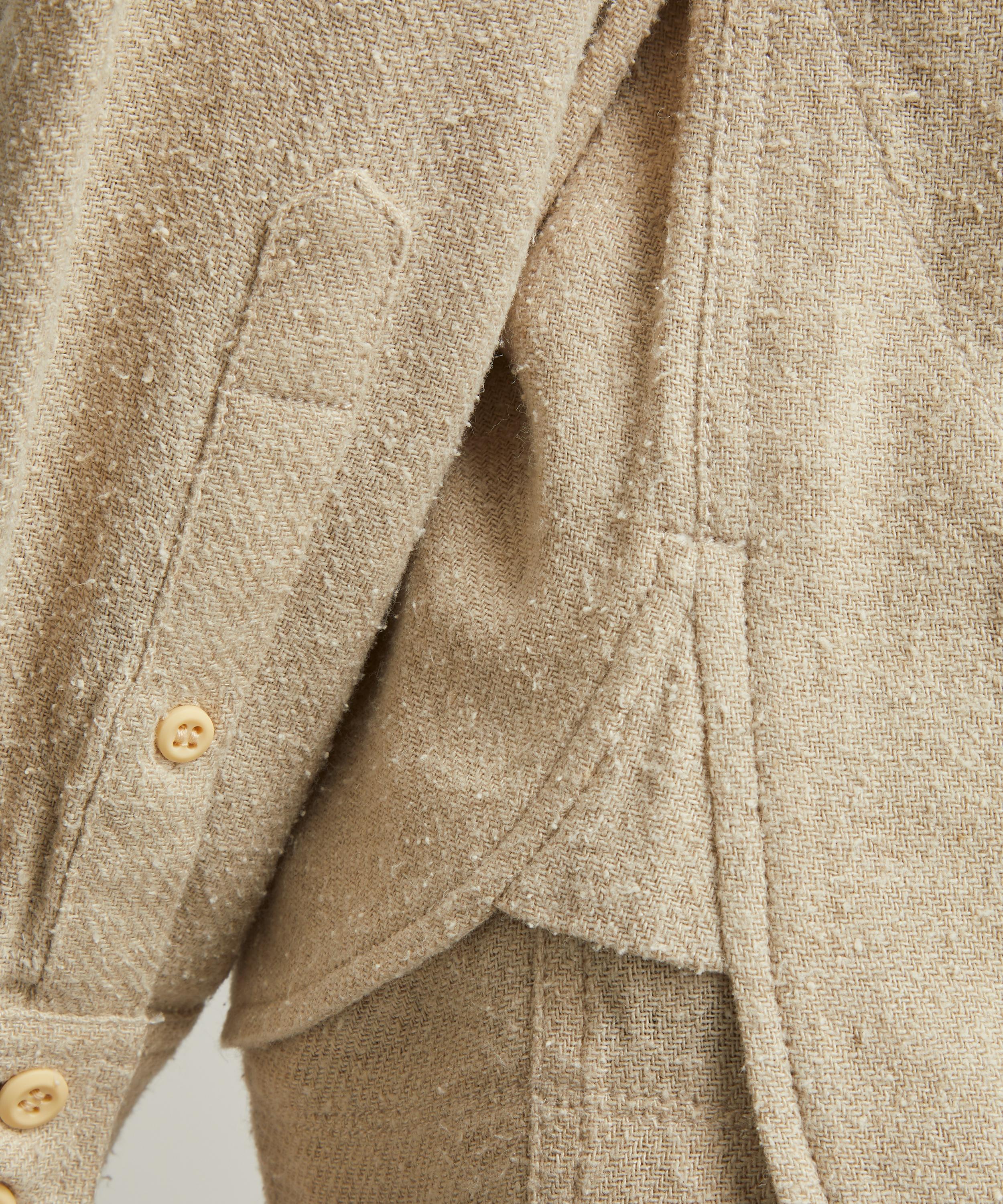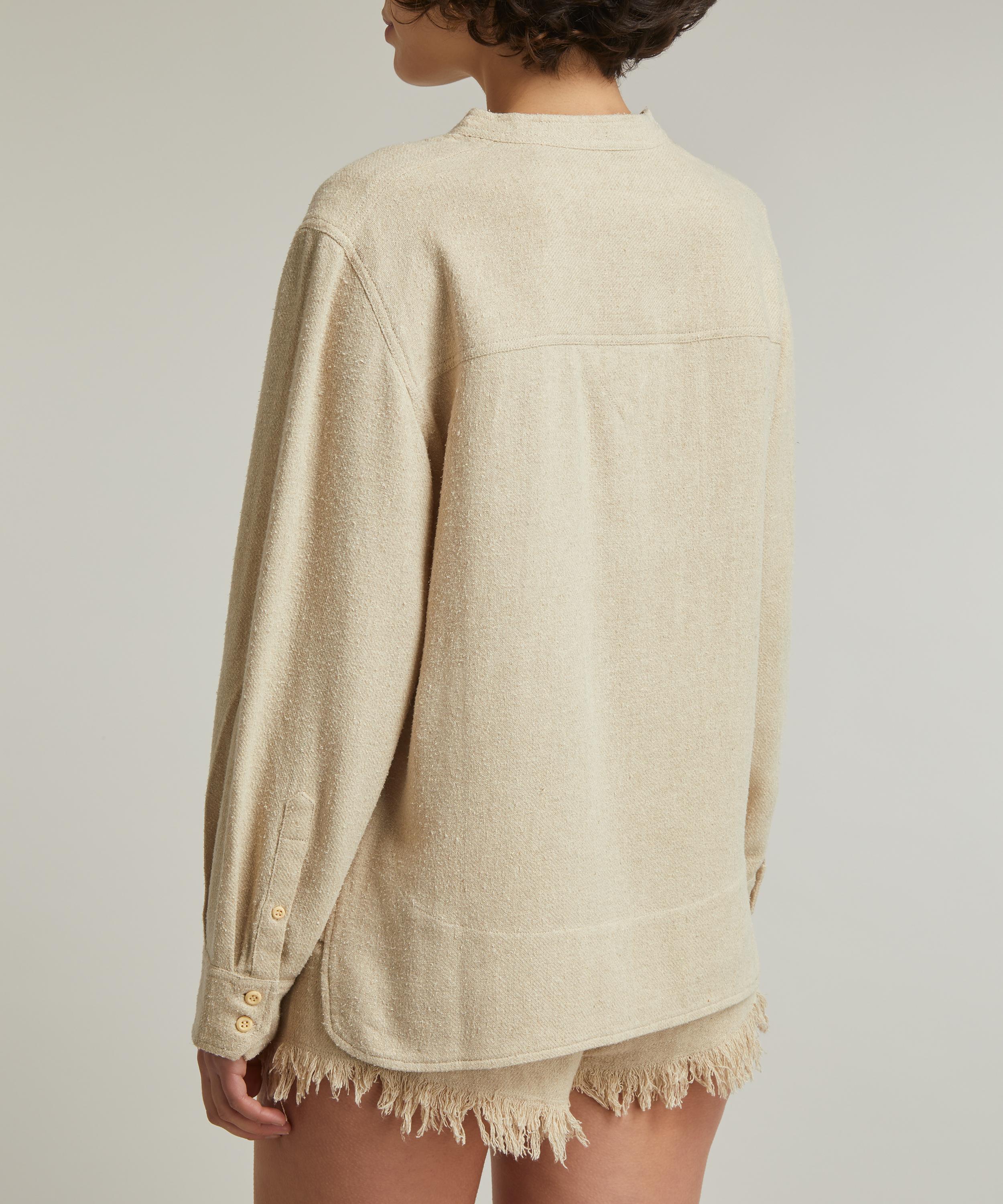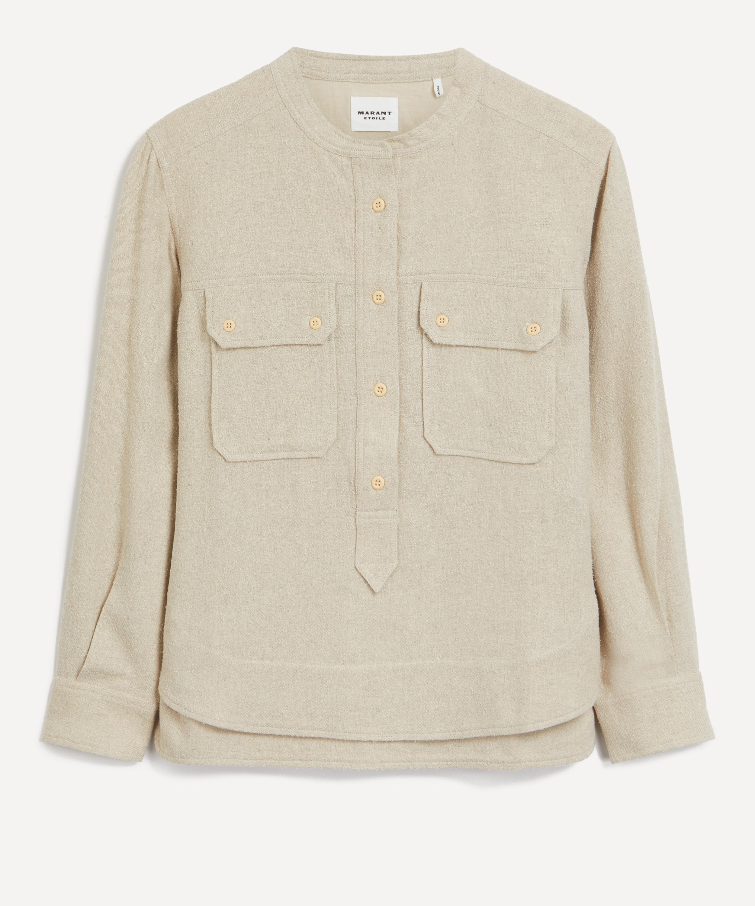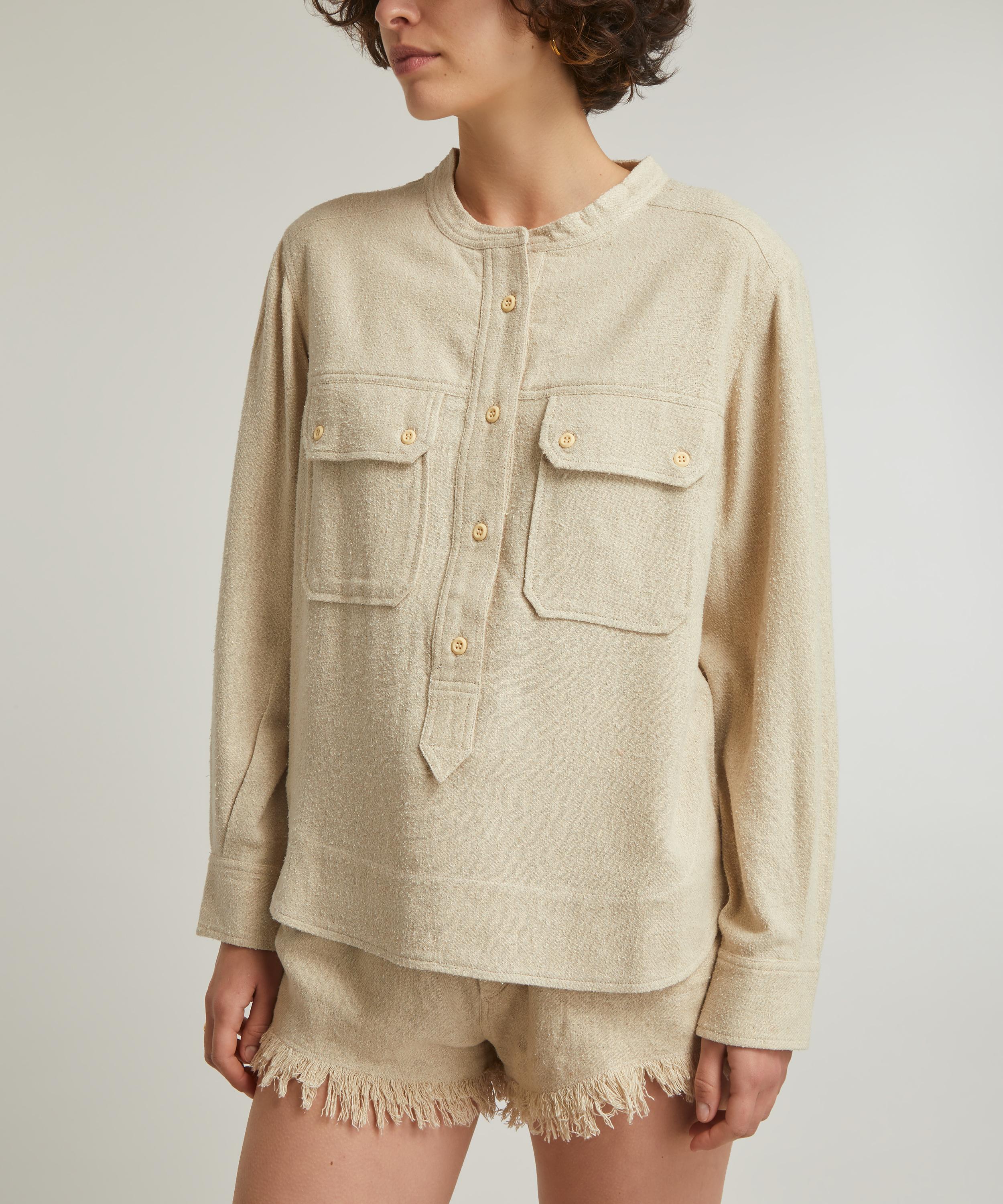Woven from silk with tactile pilling throughout, this long sleeve shirt is secured with a half placket and features a round stand-up collar, buttoned barrel cuffs, and two flap pockets at the chest for a utilitarian finish.