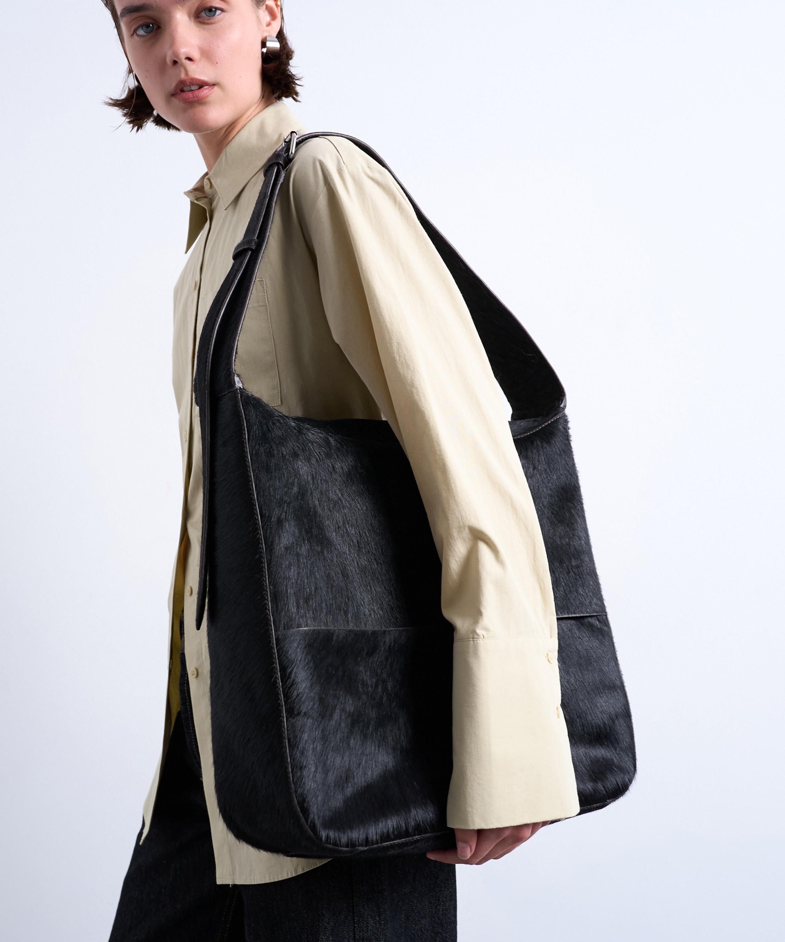 Crafted from textured pony leather with a distinctive hair-like finish, this oversized tote features a boxy silhouette and an adjustable shoulder strap for enhanced comfort and everyday practicality.