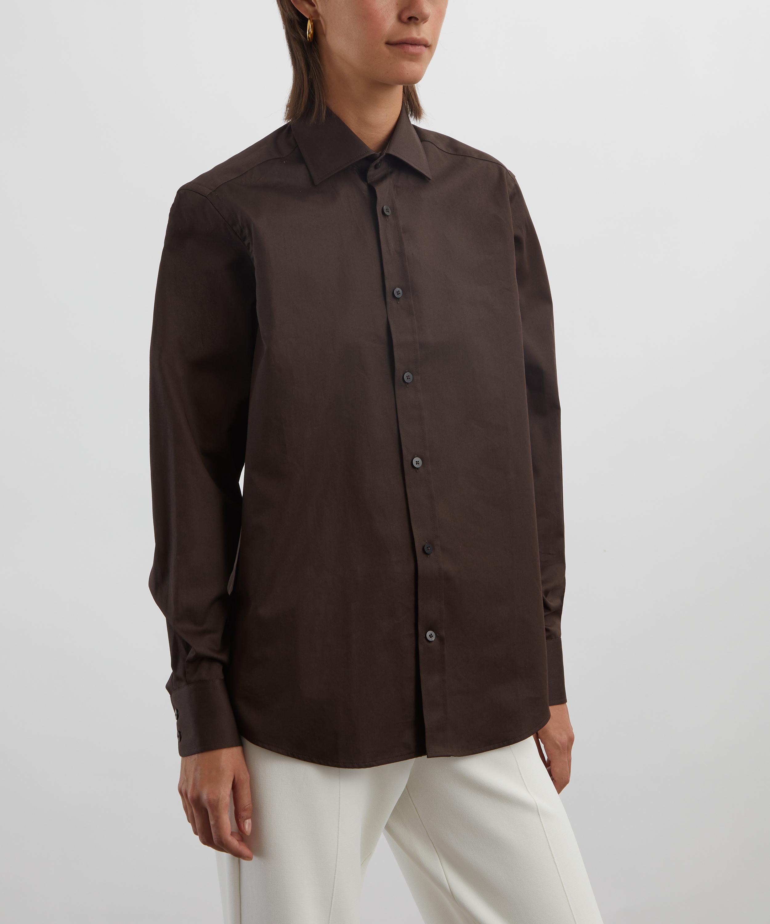 Inspired by British heritage and timeless style, this long-sleeve shirt has been cut from a rich, chocolate-hued cotton poplin to a relaxed fit, featuring slightly dropped shoulders, two pleats across the yoke and a front button fastening for a classic finish.