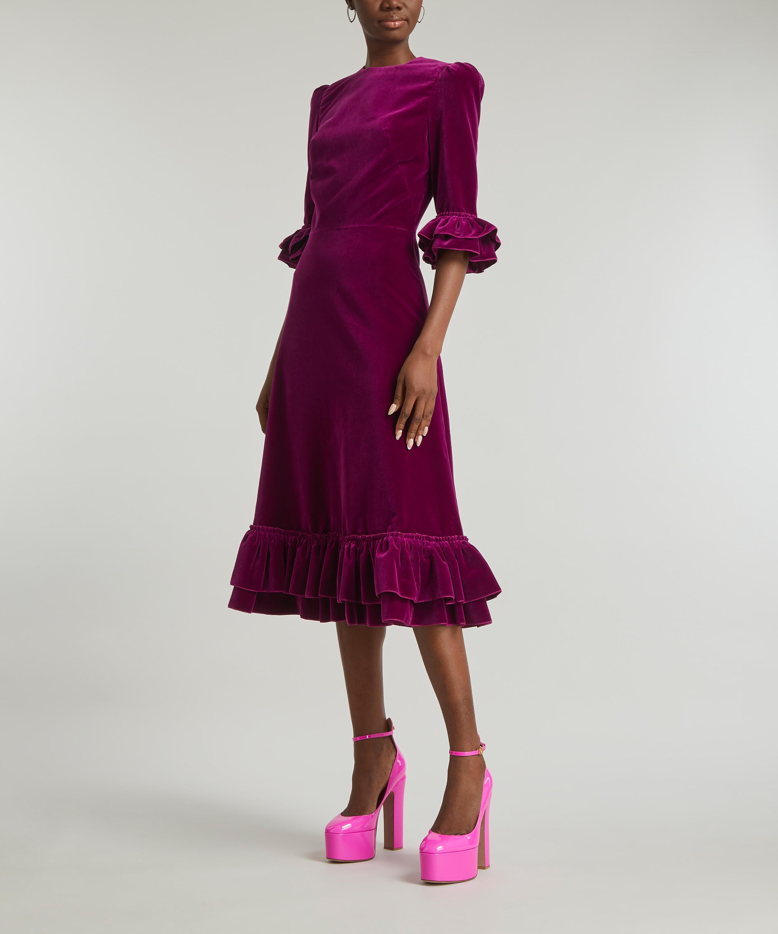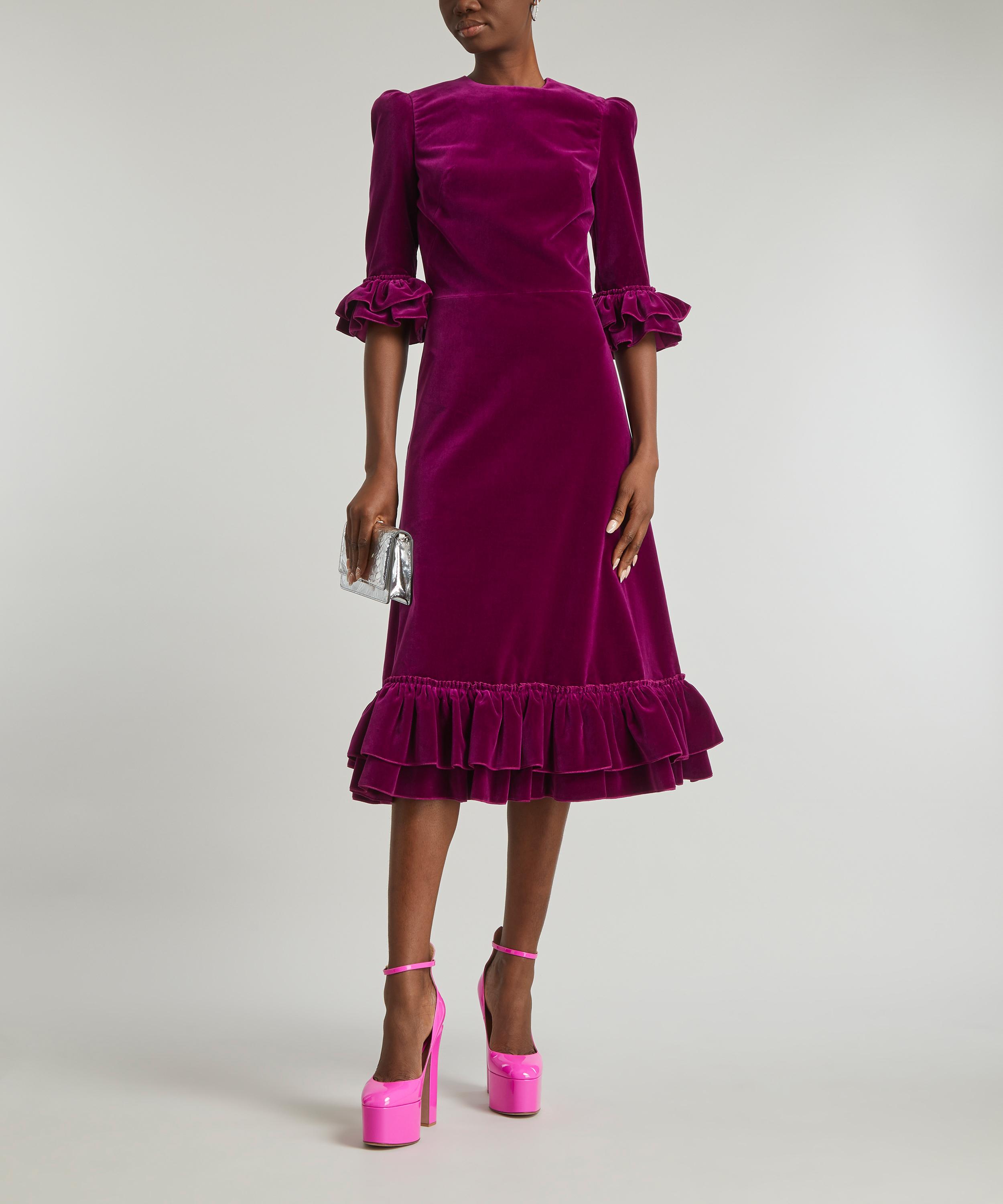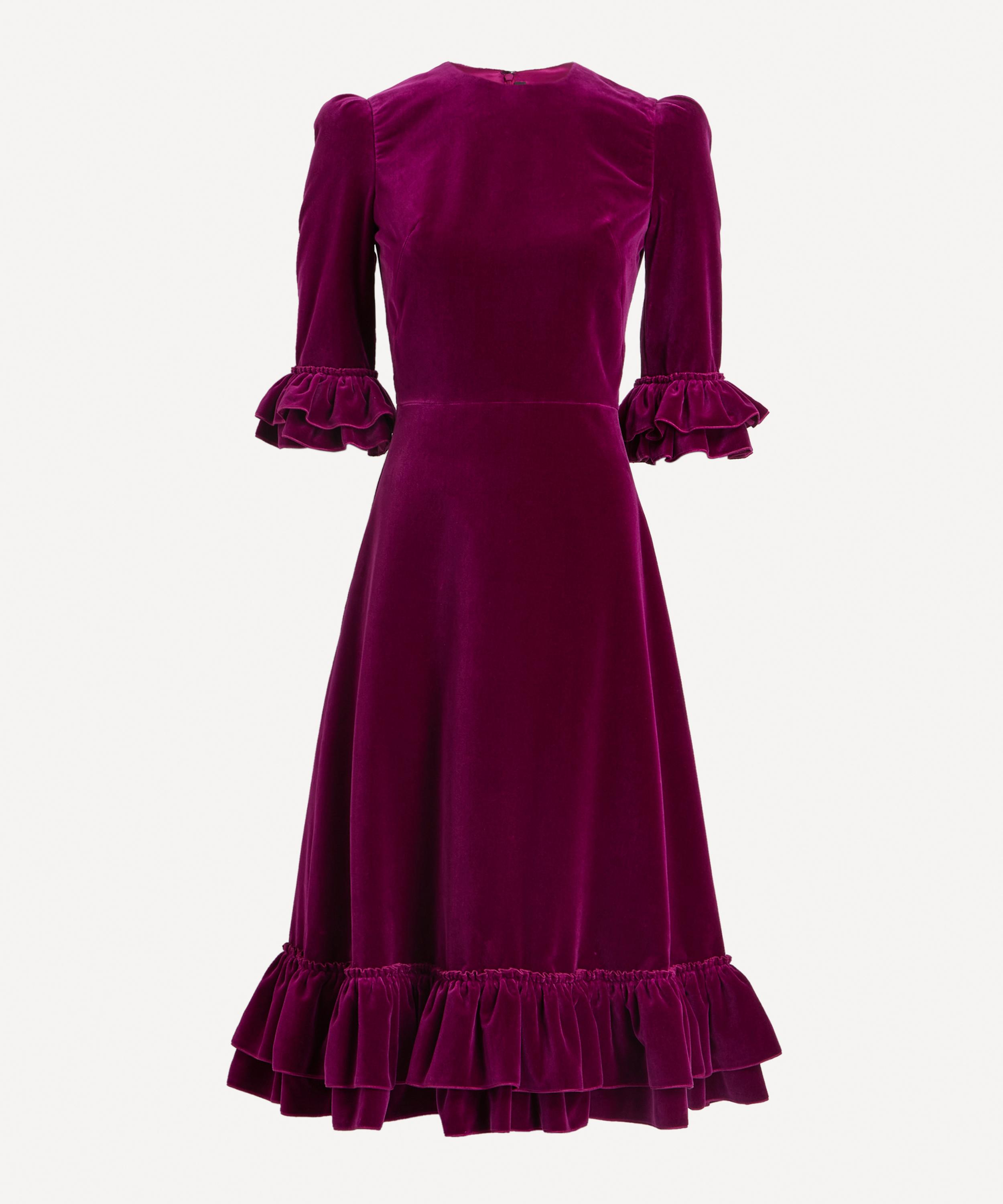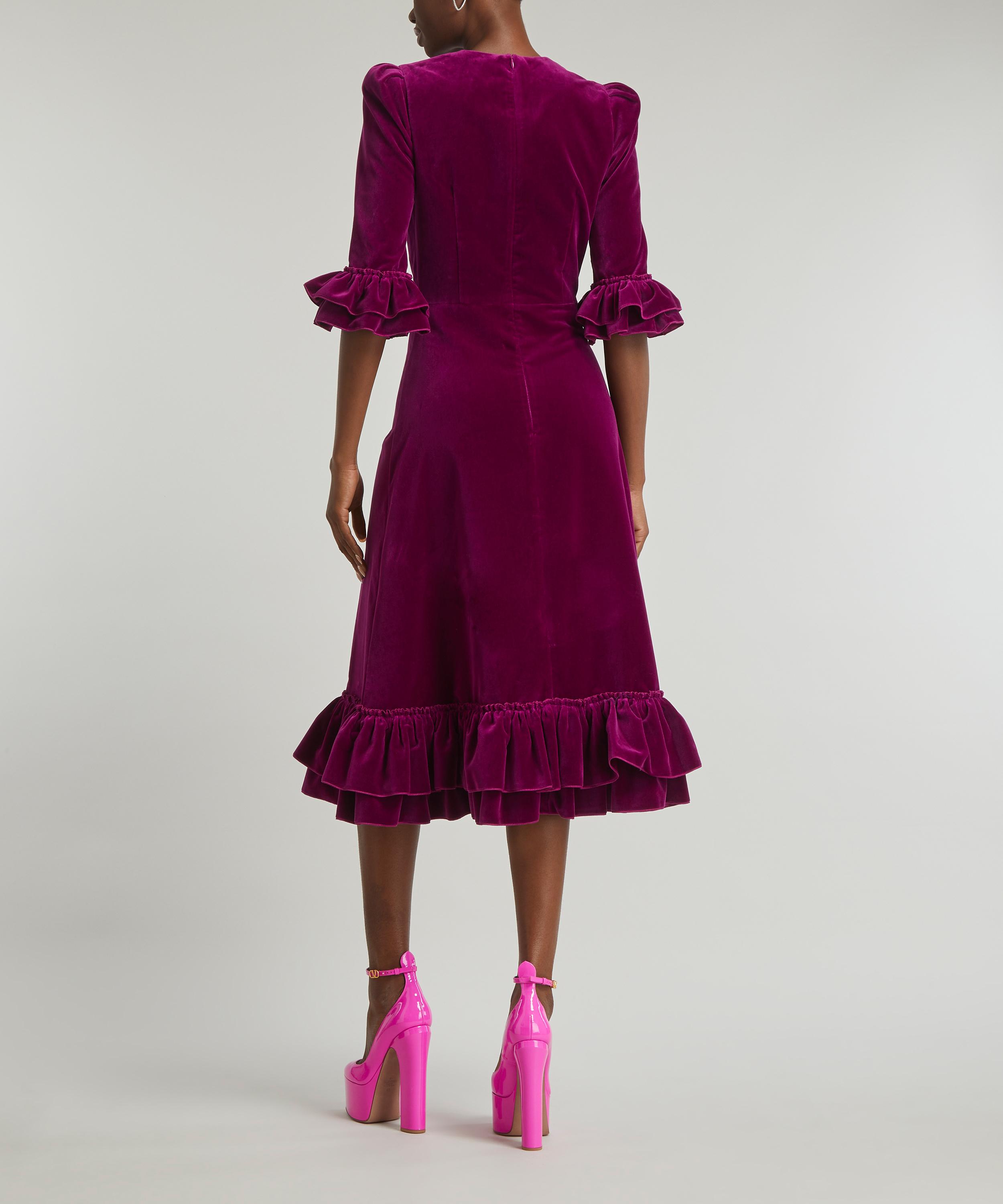 The Vampire’s Wife signature Falconetti dress is reimagined in plush purple velvet for the new season. Effortlessly elegant, this statement style is cut to flatter the feminine frame with its waist defining cut and accentuated shoulder line, complete ruffles adorning its sleeves and the hem of its flowy, midi-length skirt.