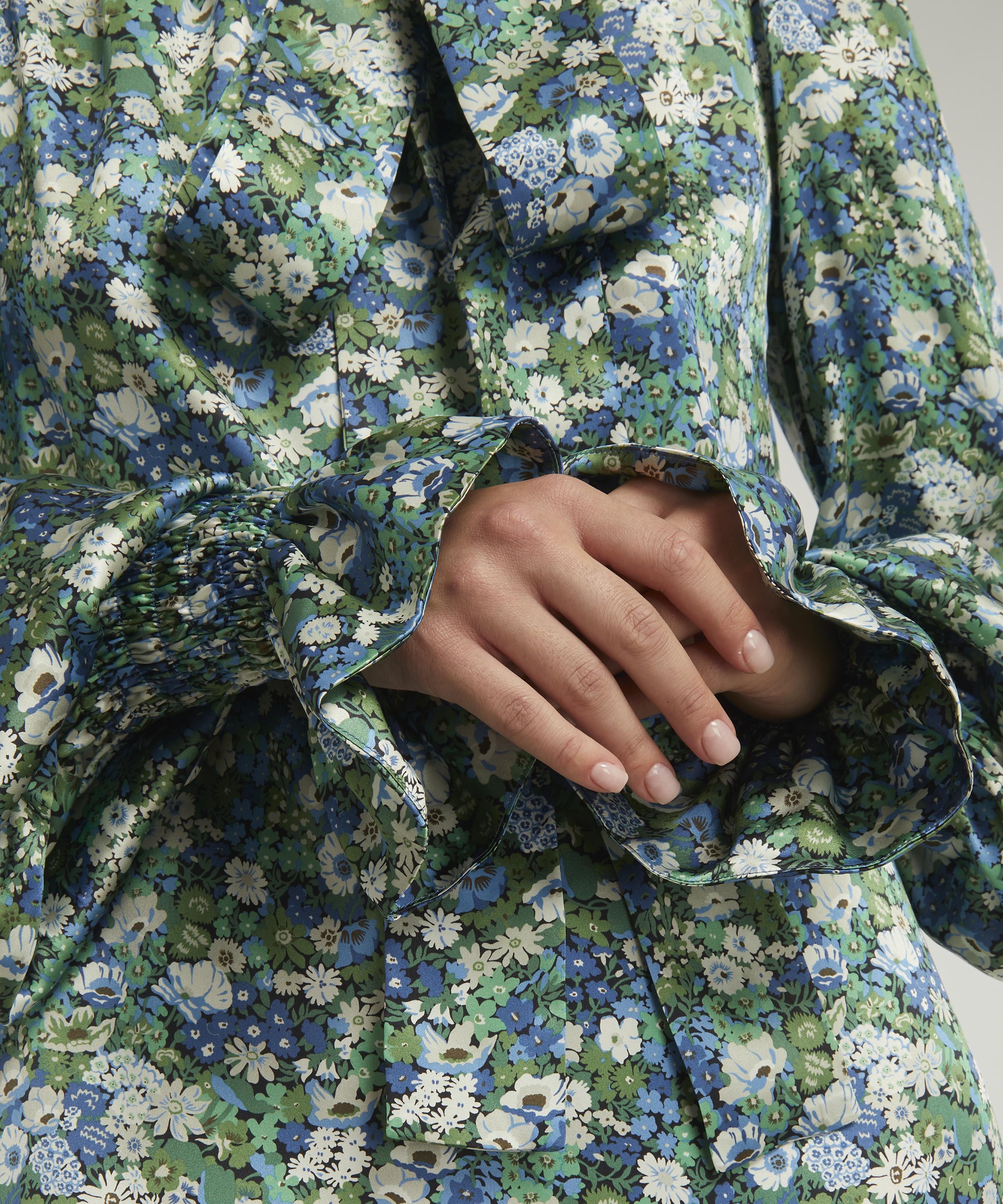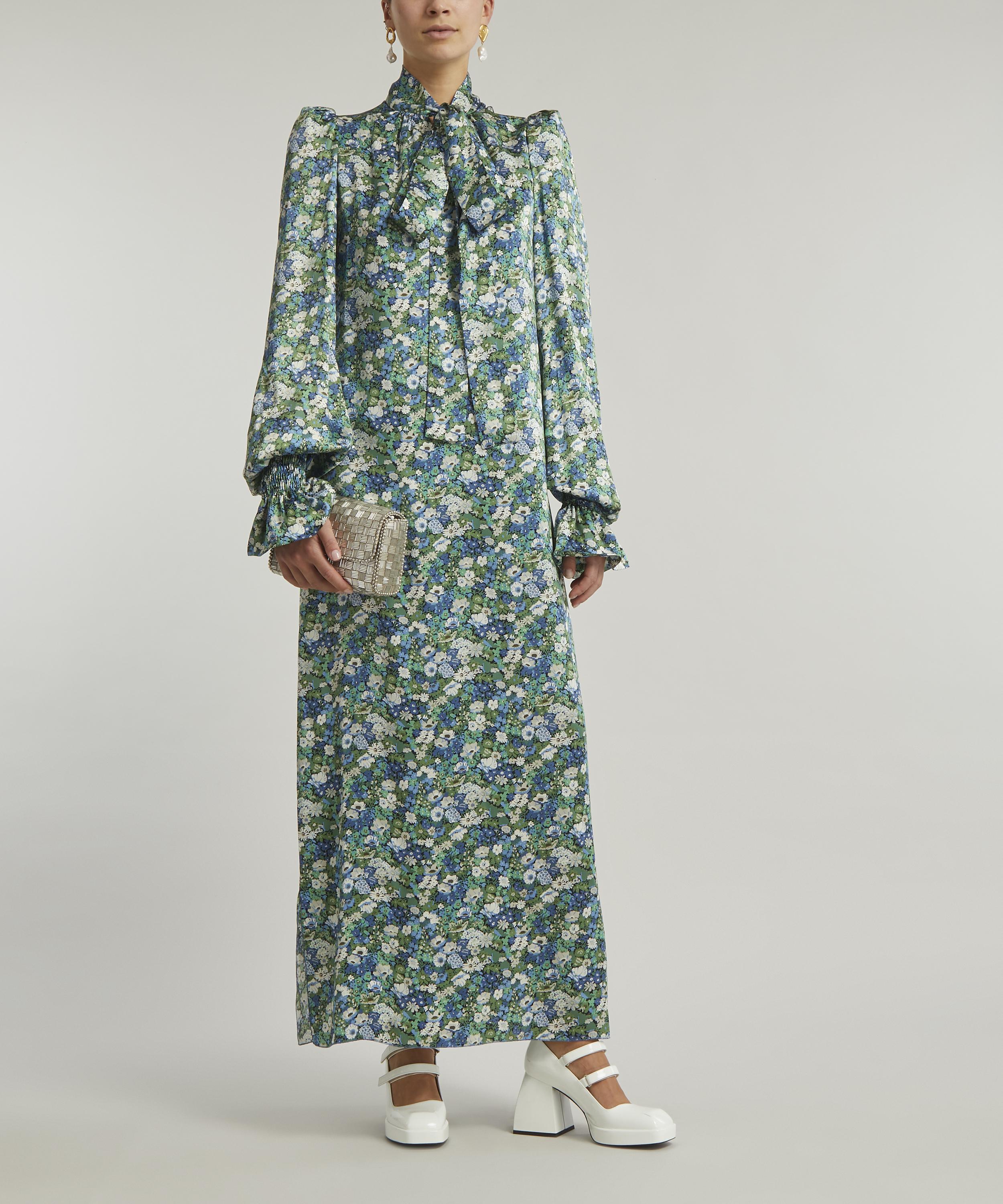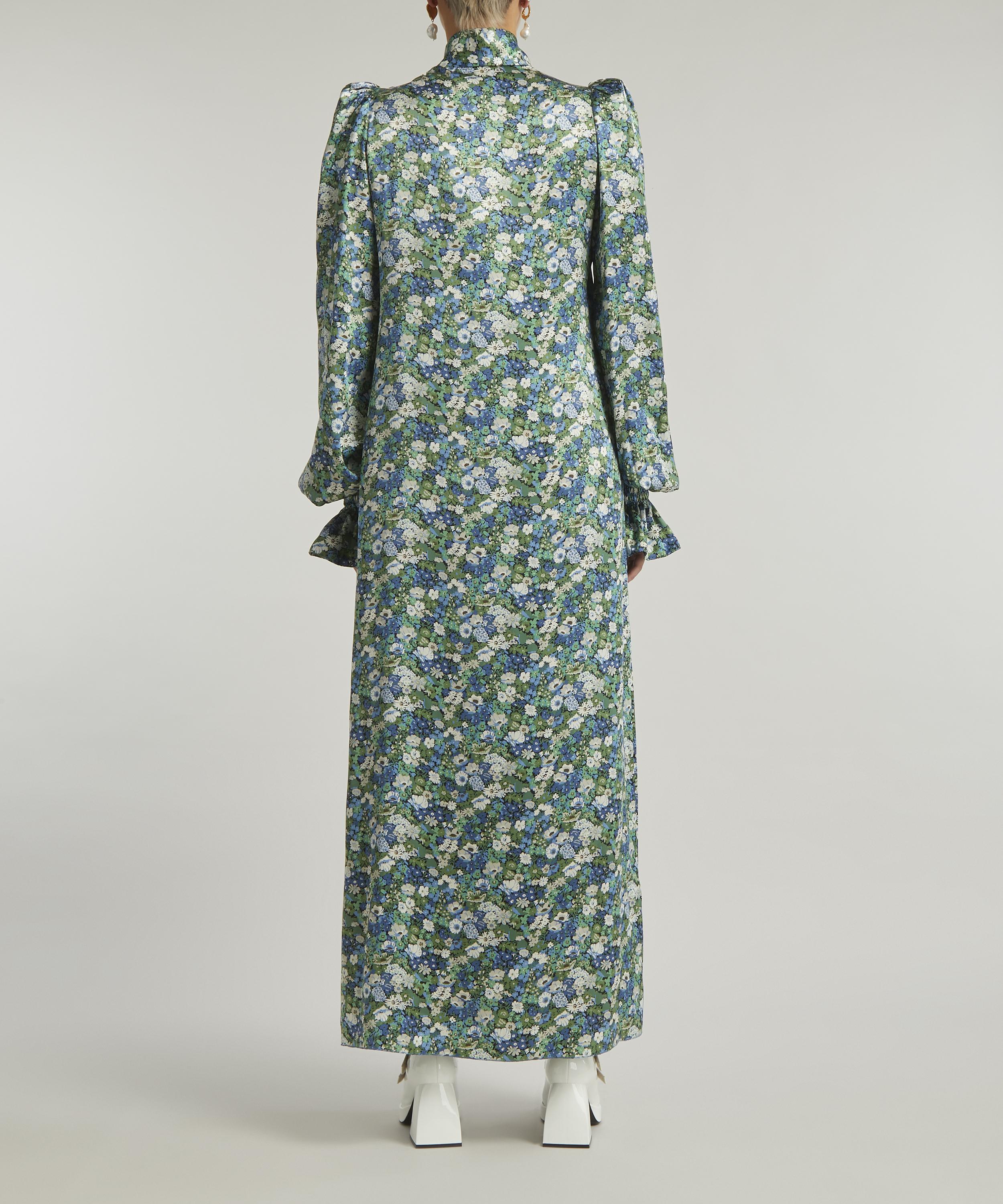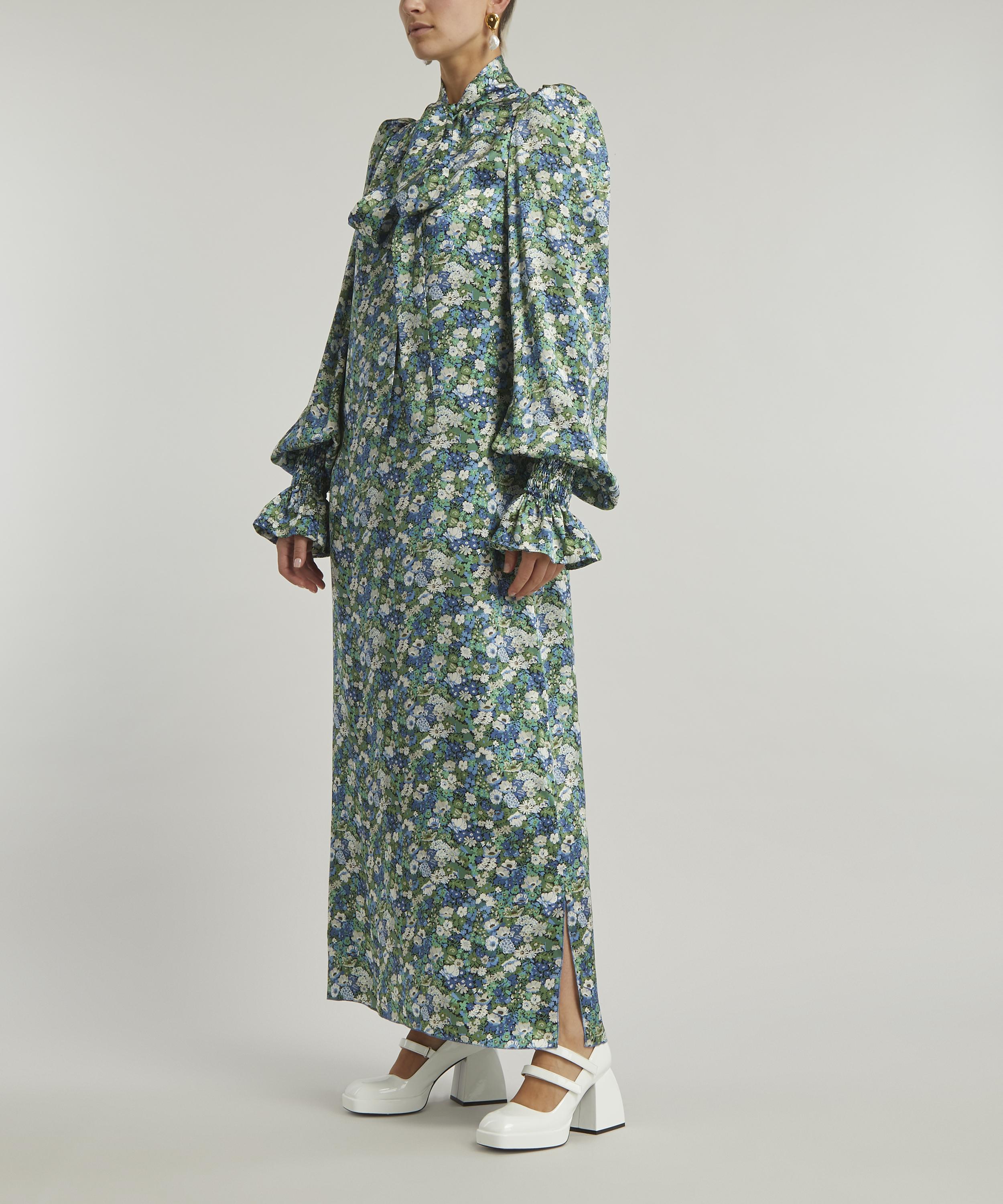 Inspired by a blooming English garden, the delightfully ditsy Fortune Teller Robe from The Vampire’s Wife is adorned all-over in Liberty’s classic Thorpe floral pattern. Oozing with opulence, this statement silk gown is cut to an elegant A-line silhouette that falls to the ankle with small slits on each side. A romantic, retro-infused design, it has a draped pussy-bow collar and voluminous, puffed-sleeves, complete with dramatically flounced cuffs for a playful yet polished finish.