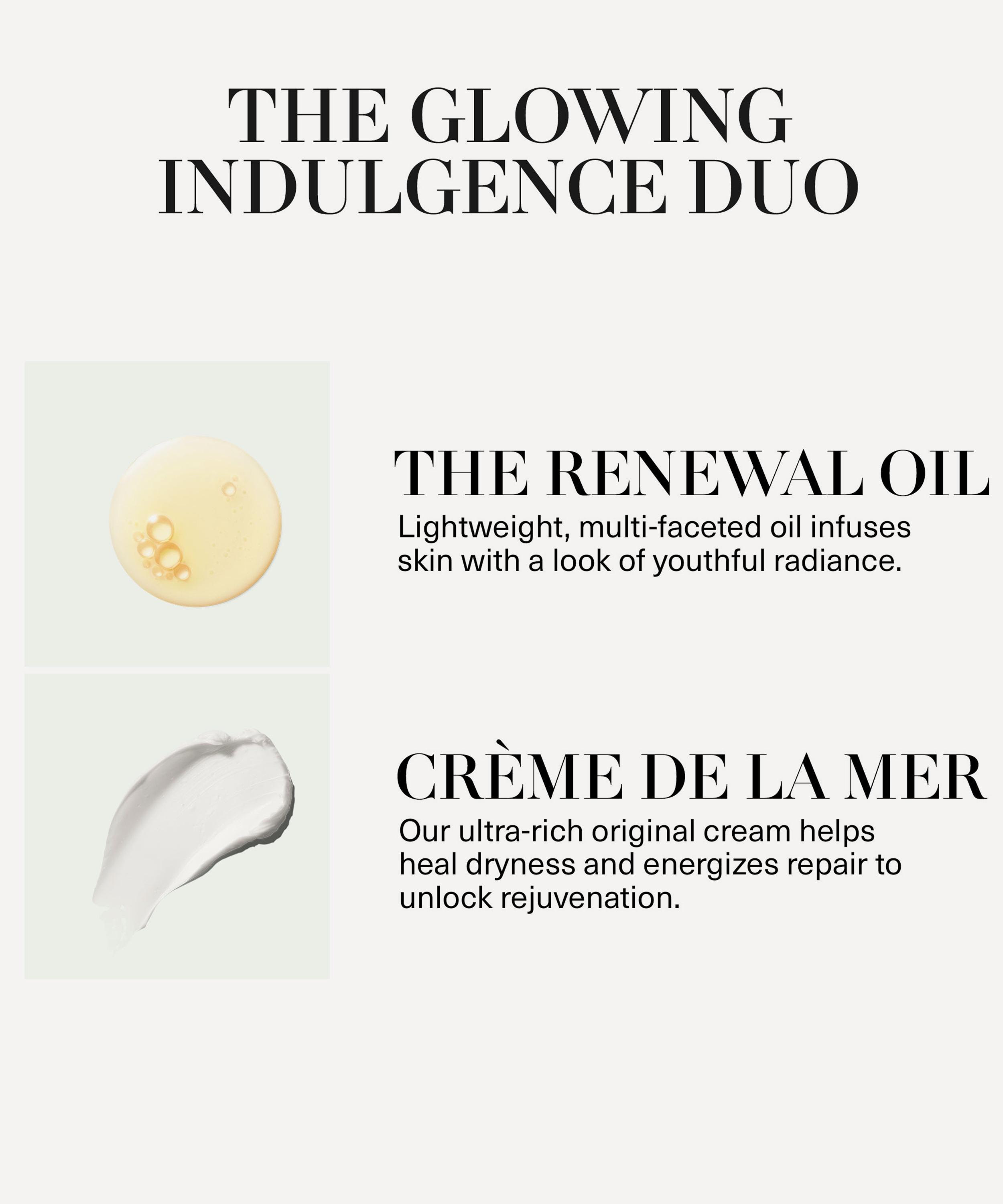 - The Glowing Indulgence Collection includes: Crème de la Mer 15ml and The Renewal Oil 15ml