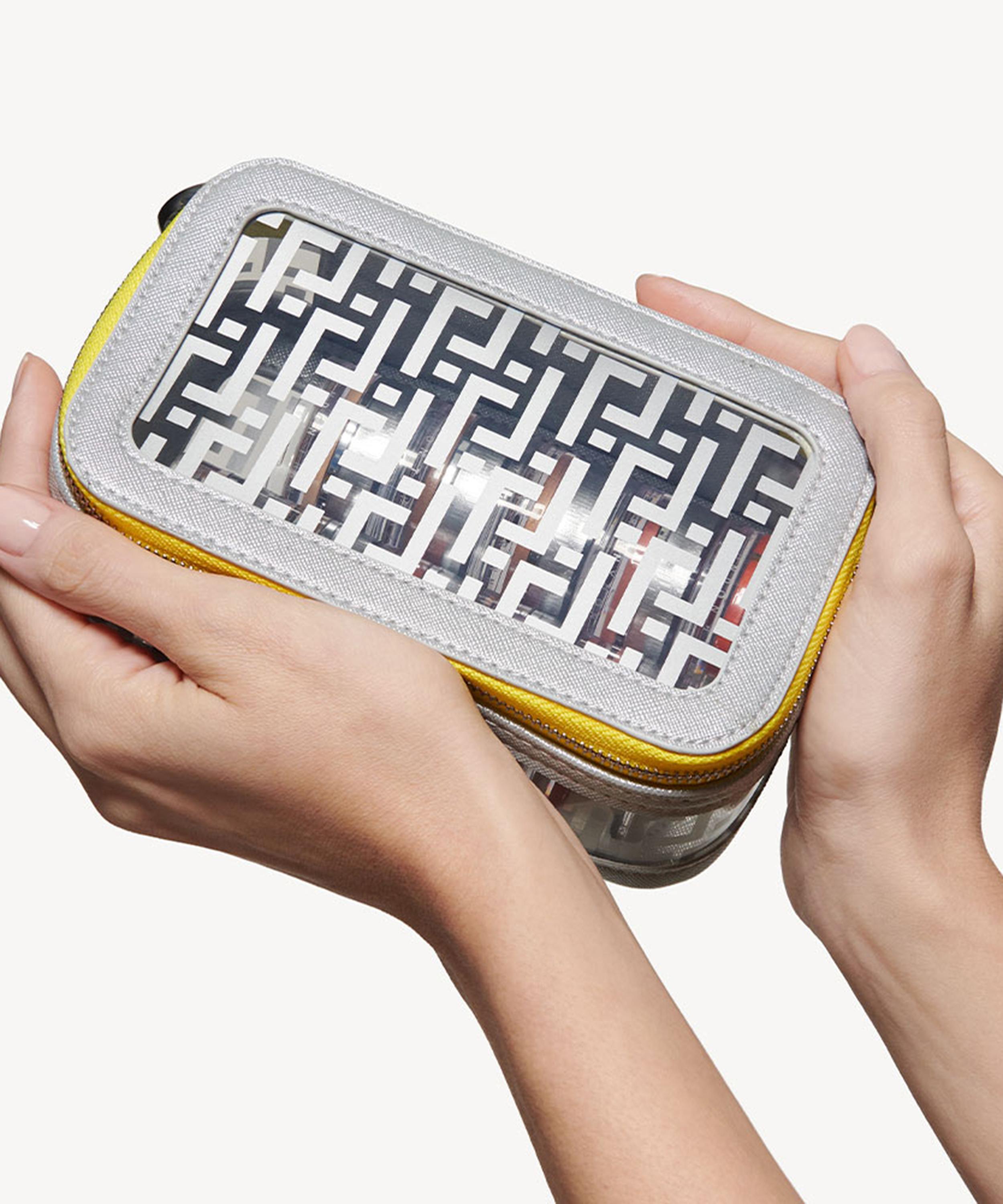 Designed for a compact, boxy shape, this versatile beauty bag features transparent panels adorned with the brand's instantly recognisable monogram logo, and is complete with elegant imitation leather trims and a zip-around closure in a signature vibrant yellow hue for a playful finish.