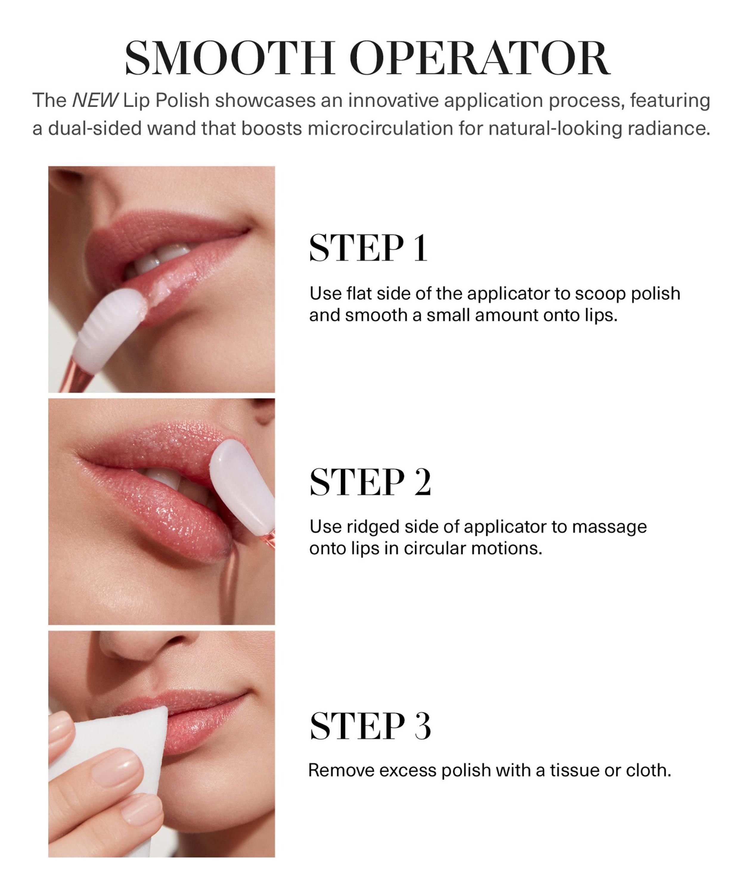 Three times a week, use flat side of the applicator to smooth a small amount onto lips. Use ridged side of applicator to massage onto lips in circular motions. Remove excess polish with a tissue or cloth.