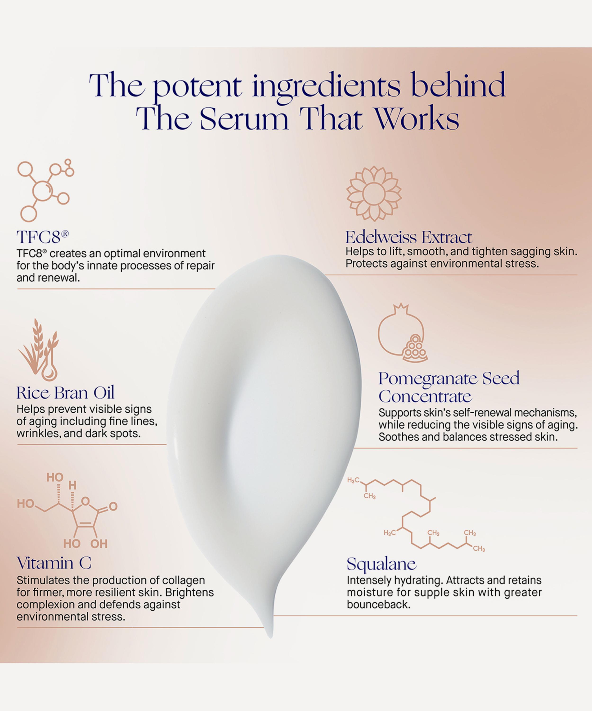 - Formulated from Pomegranate Seed Concentrate, Edelweiss Extract, Vitamin C, Polysaccharide Moisture Complex, Squalane, Resveratrol, Rice Bran Oil