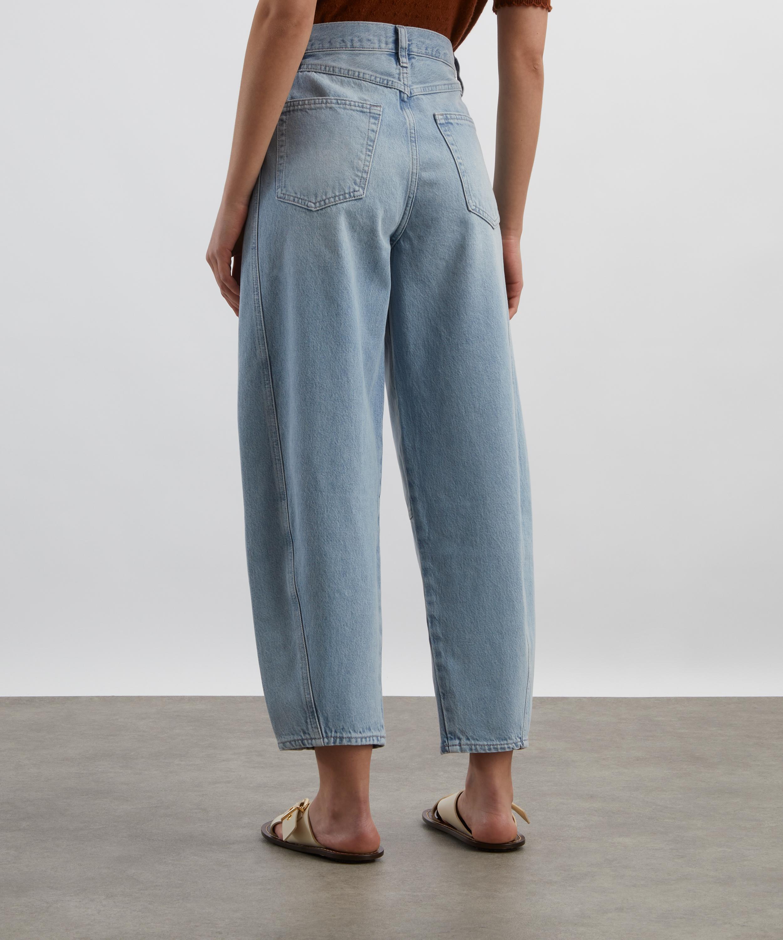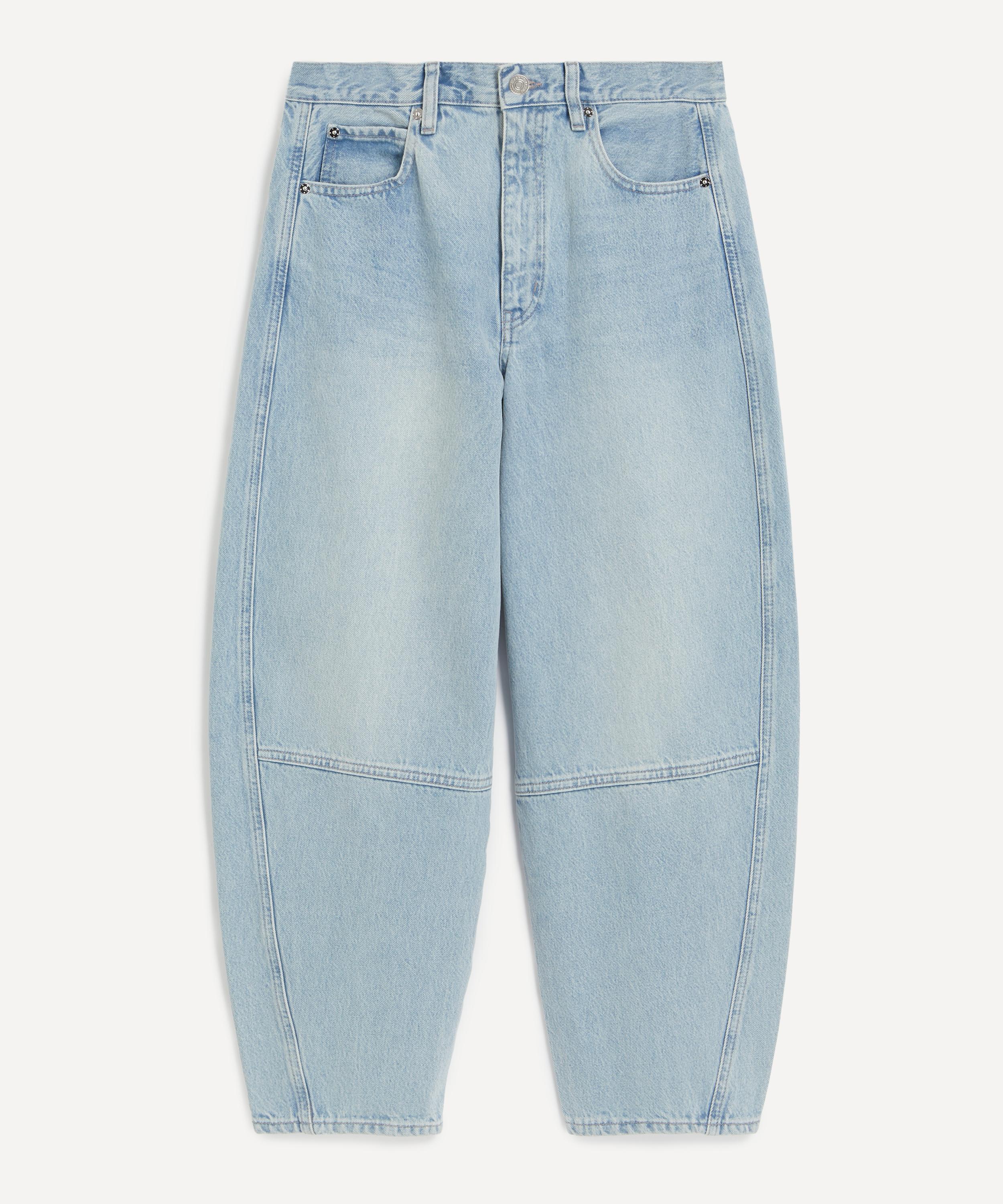 Crafted from rigid denim in a light-blue wash, the Twisted Jeans showcase a high-rise, barrel-leg silhouette with an ankle-length inseam. Utility-inspired seam detailing adds a distinctive touch, blending structure with effortless style.