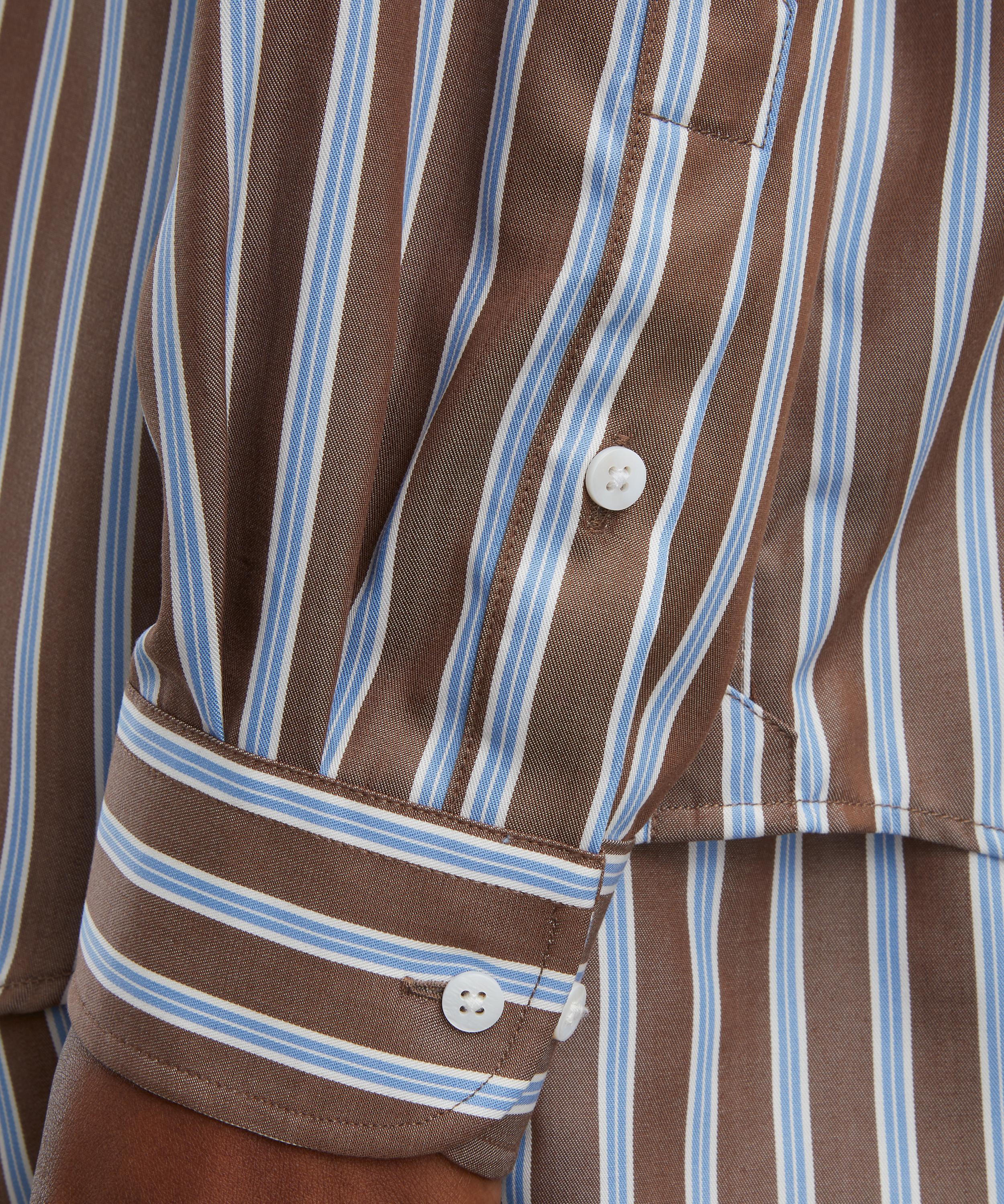 Inspired by classic British heritage styles, the Weekend Shirt is crafted from TENCEL™ Lyocell and adorned with a striking Mocha Multi-Stripe pattern. Cut for a relaxed fit with dropped shoulders and exaggerated cuffs, it’s finished with a spread collar, button fastening, and a chest pocket, blending effortless ease with tailored sophistication.