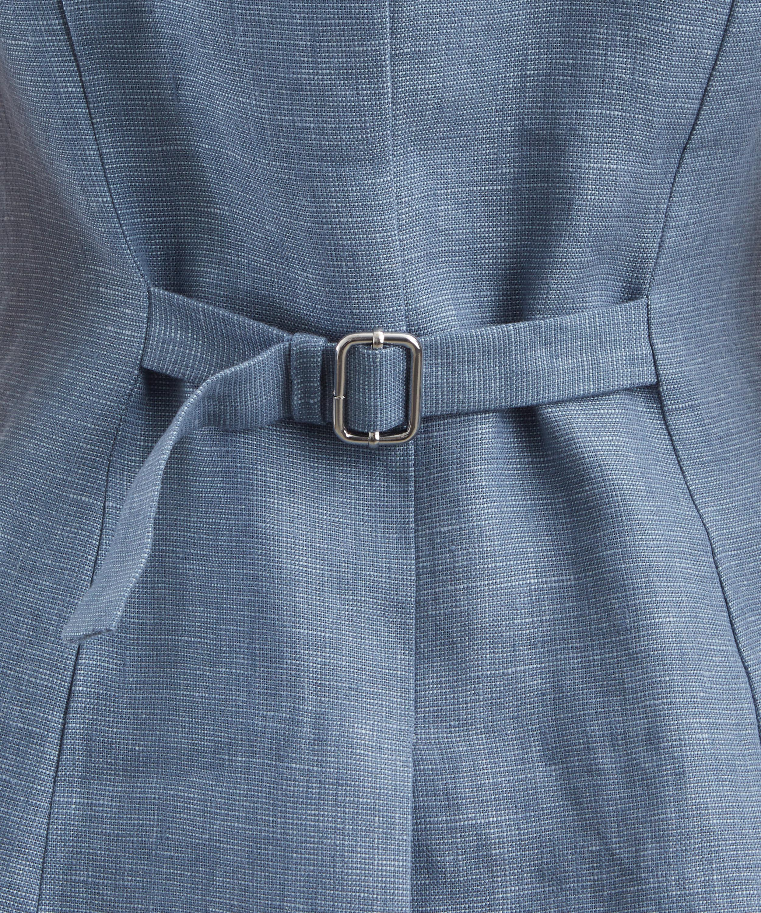 Cut from premium linen, the Thea vest exudes effortless charm with its high scoop neckline and double-breasted button fastening. A buckle adjuster at the back gently cinches the waist, creating a feminine, softly defined silhouette.