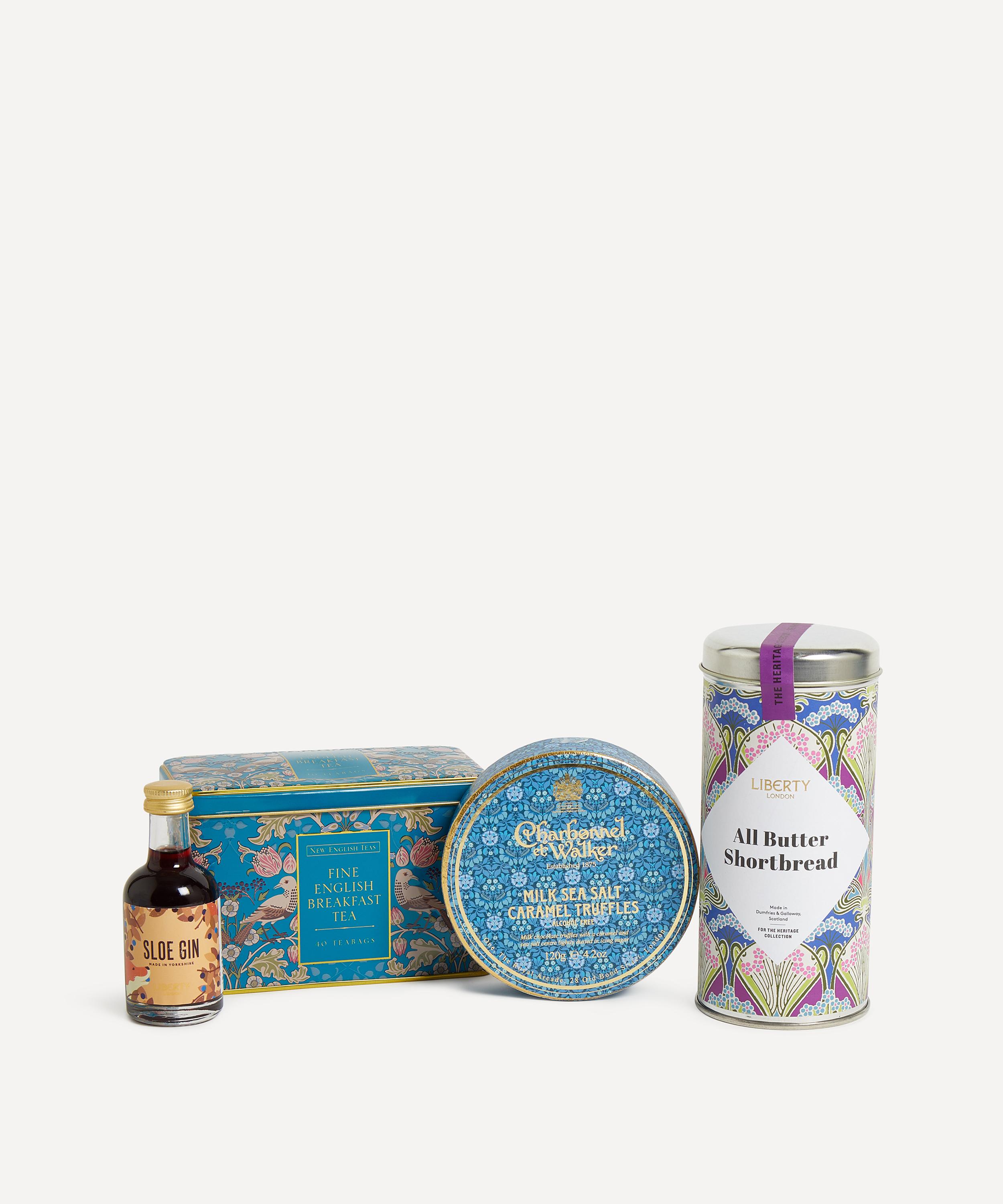 - Includes: Liberty Heritage All Butter Shortbread (230g), Songthrush and Berries Tea Tin, Liberty Print Sea Salt Truffles (120g), Liberty Sloe Gin Miniature (50ml)