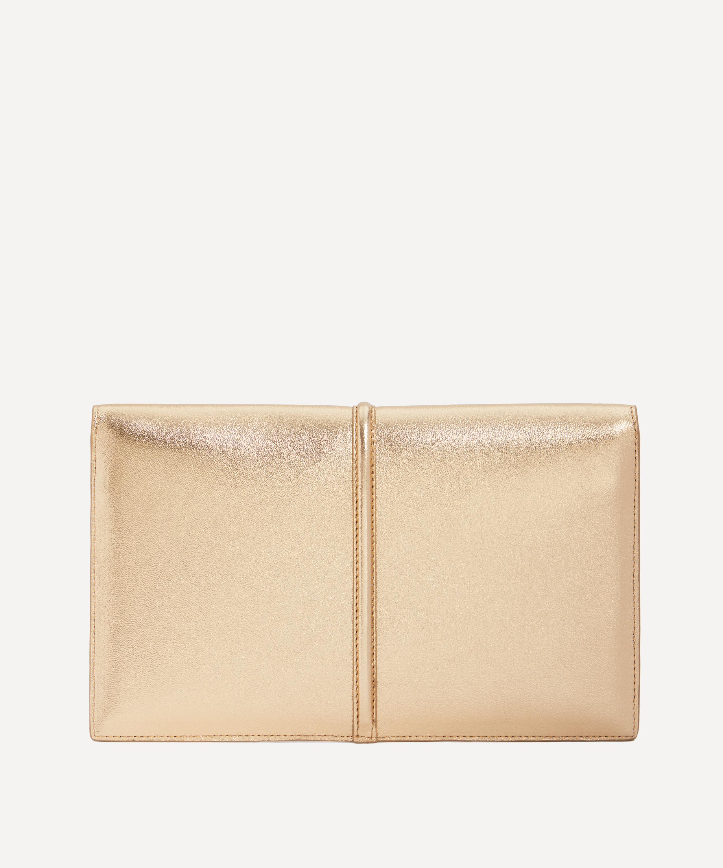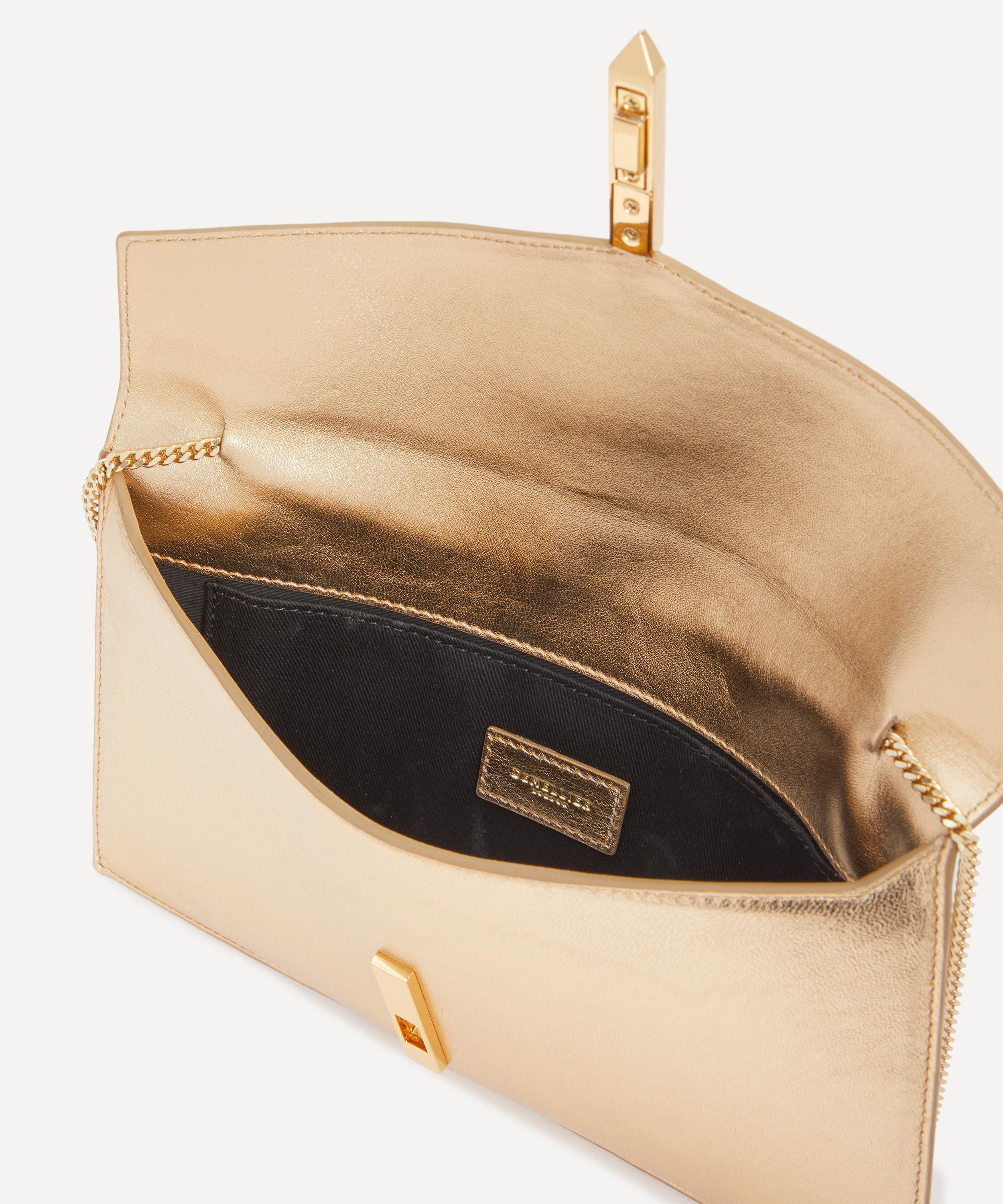Handcrafted with integrity from smooth leather, this elegant bag features an envelope-style design, characterised by the elongated arrow-shaped lock that adorns the front, and is complete with a magnetic closure and a detachable chain strap.