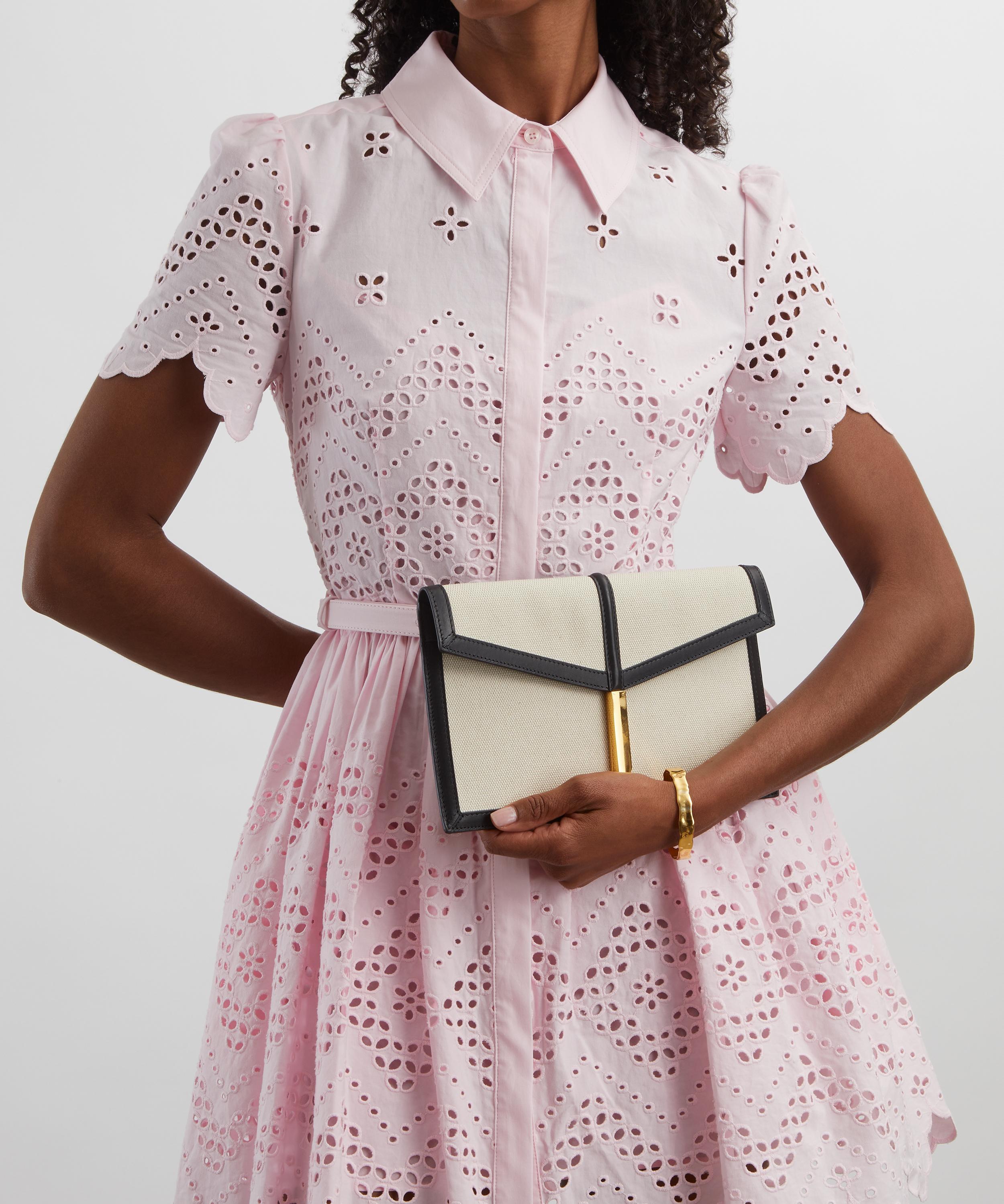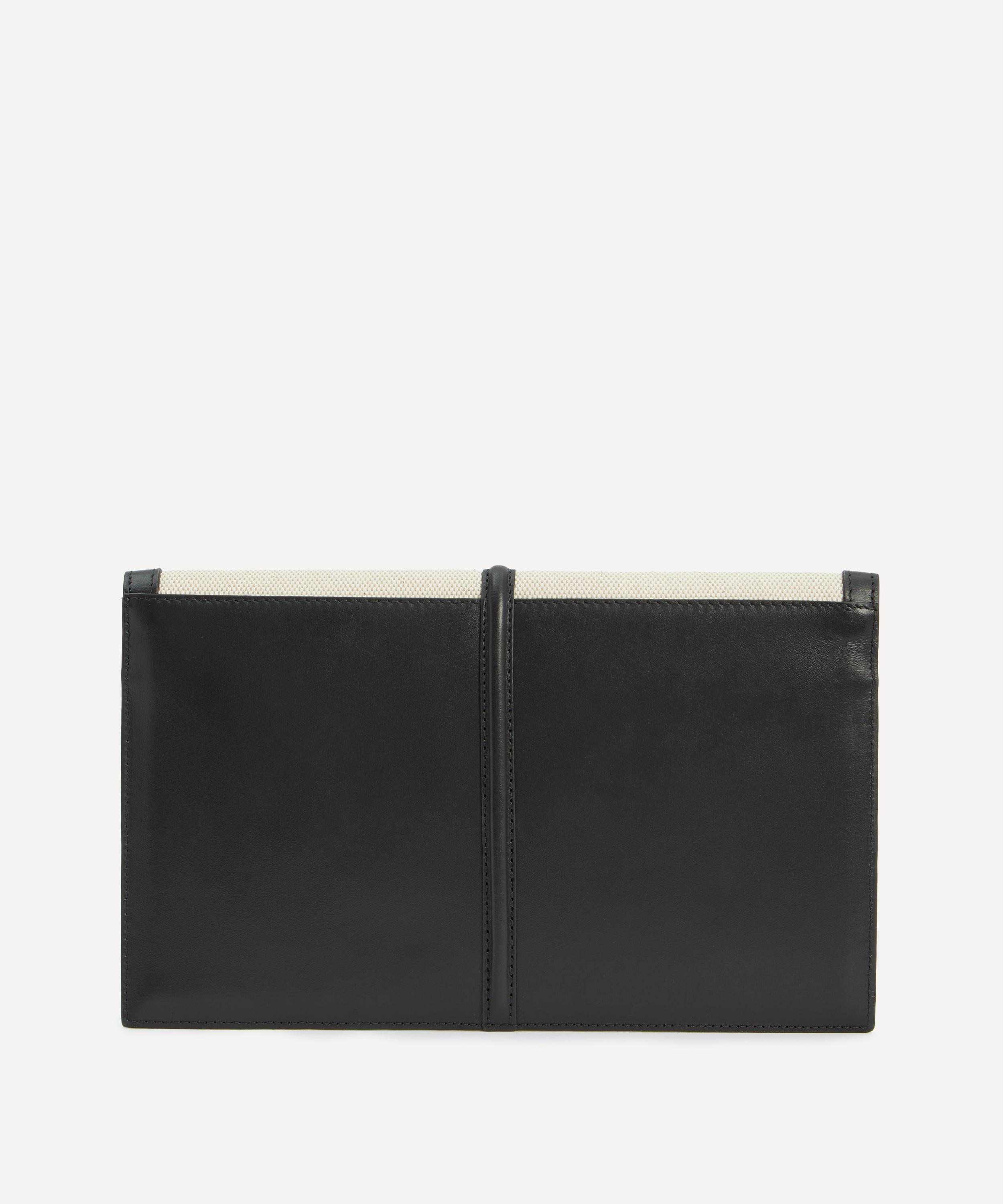 Handcrafted with integrity from smooth leather and cotton canvas, this elegant bag features an envelope-style design, characterised by the elongated arrow-shaped lock that adorns the front, and is complete with a magnetic closure and a detachable chain strap.