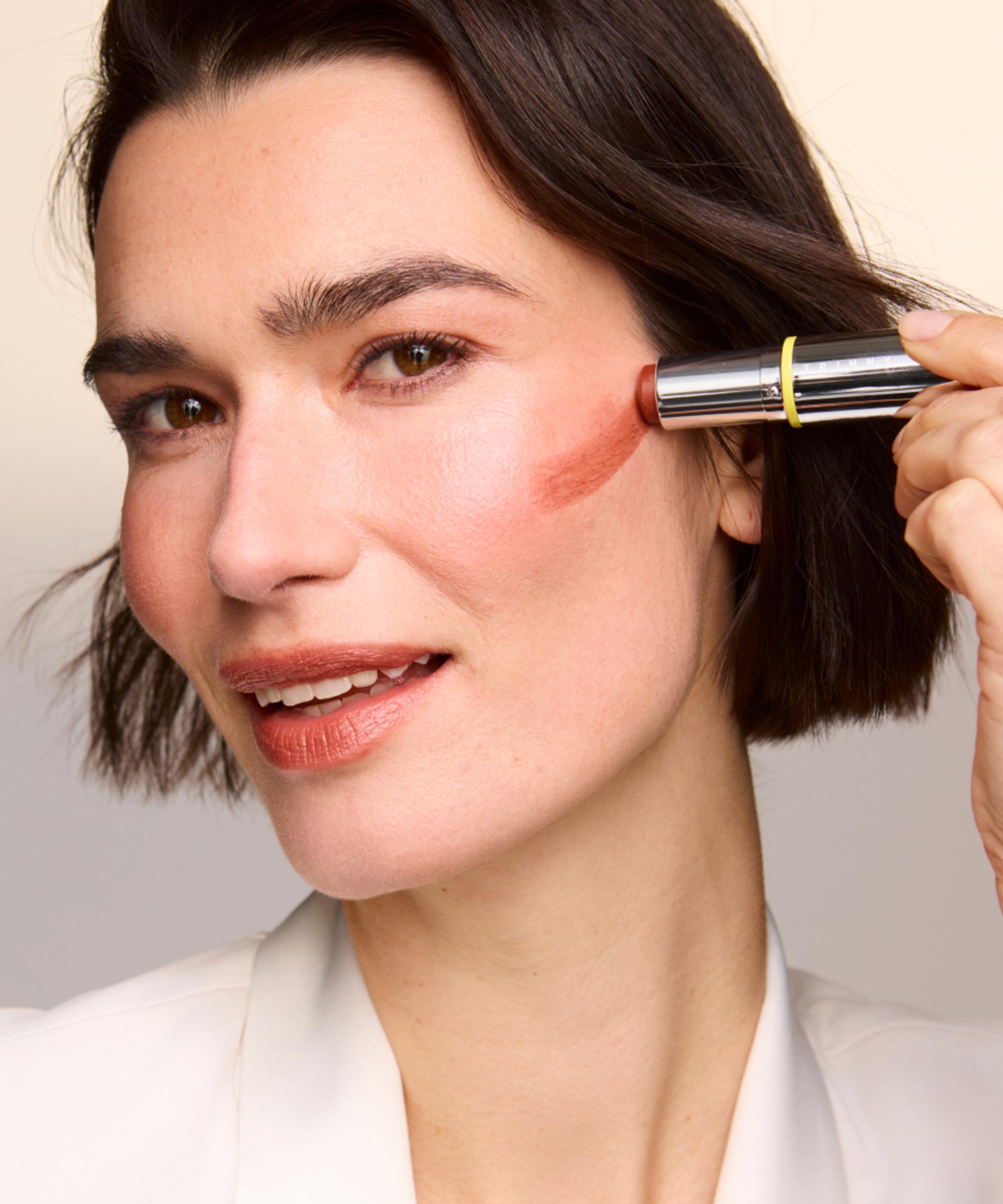 Use the glow end to add a glass-like sheen where you want it, whether that’s layered over the matte colour or on its own across the cheek or brow bones.