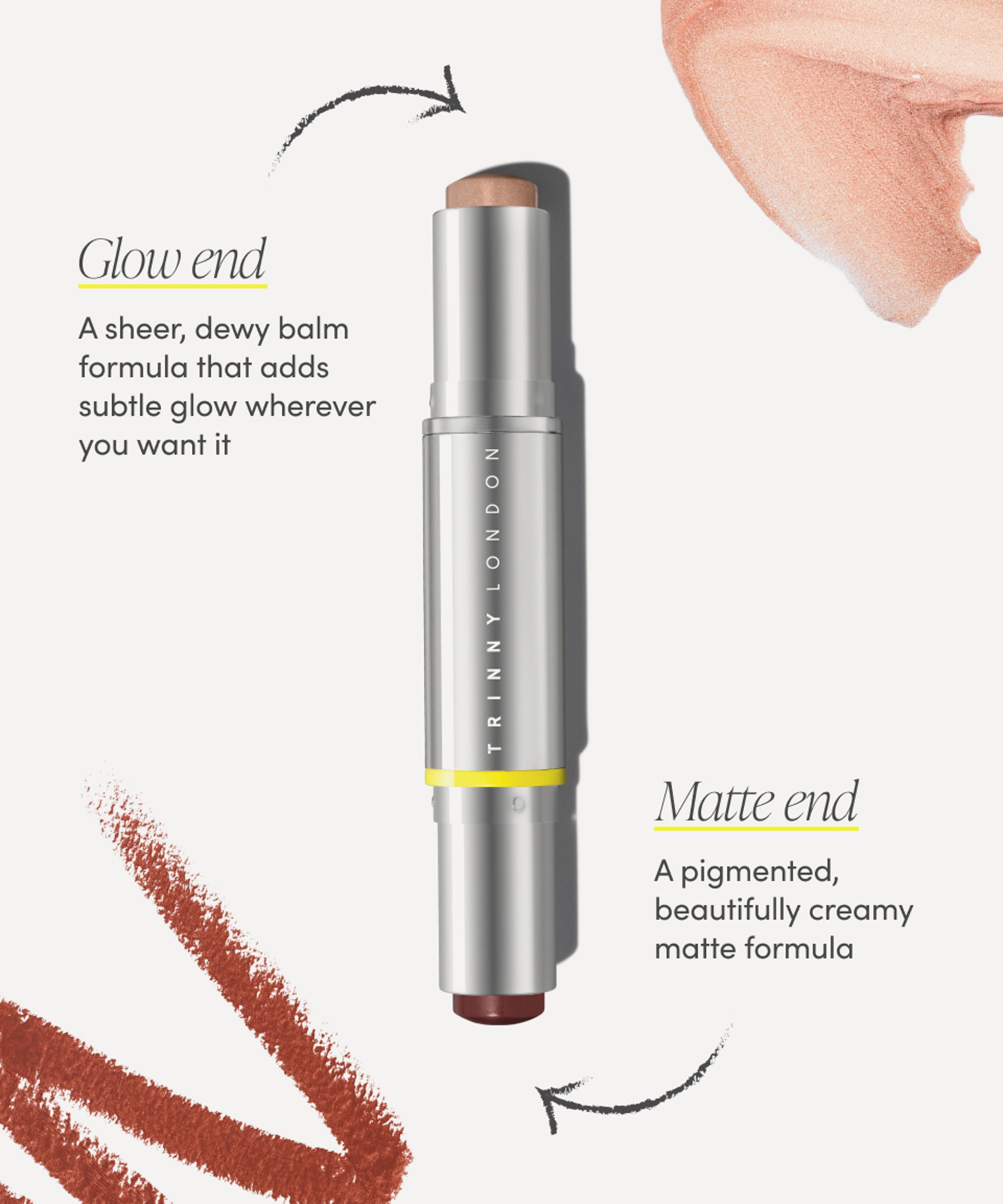 Streamline your makeup kit with Trinny London's 3-in-1 multitasker Trinity, an innovative dual-sided design featuring a sheer, dewy formula and a creamy matte formula.
