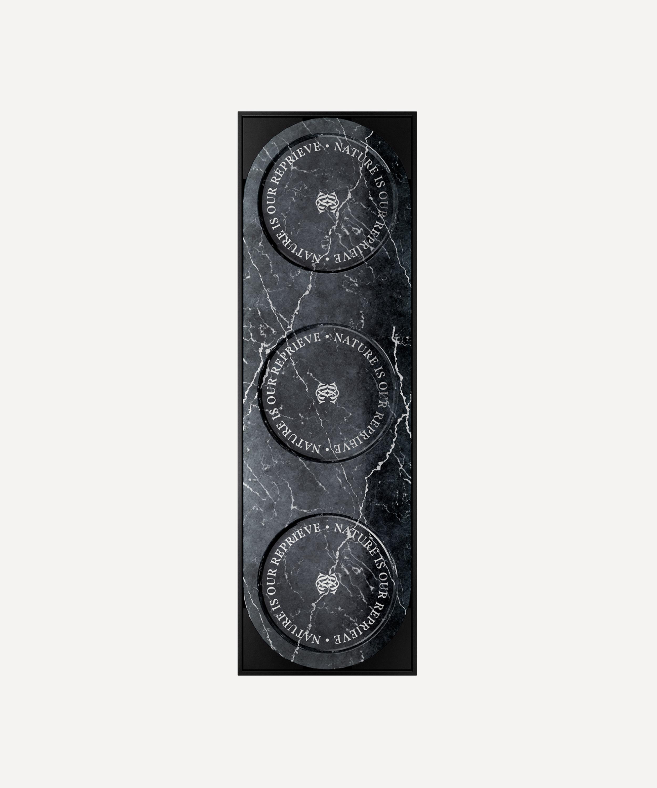 Elevate your display with this sleek tray, beautifully crafted from Marquina Nero marble with natural variations of delicate white veins and complete with an engraved logo detail at the centre of the holder, surrounded by the brand's guiding principle, 'Nature is our Reprieve'.