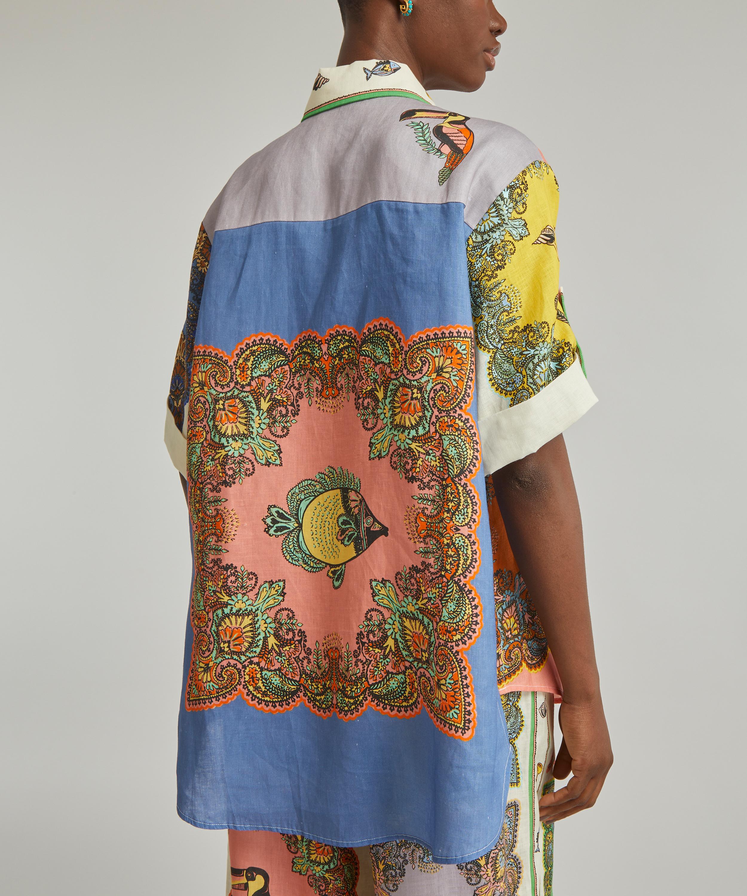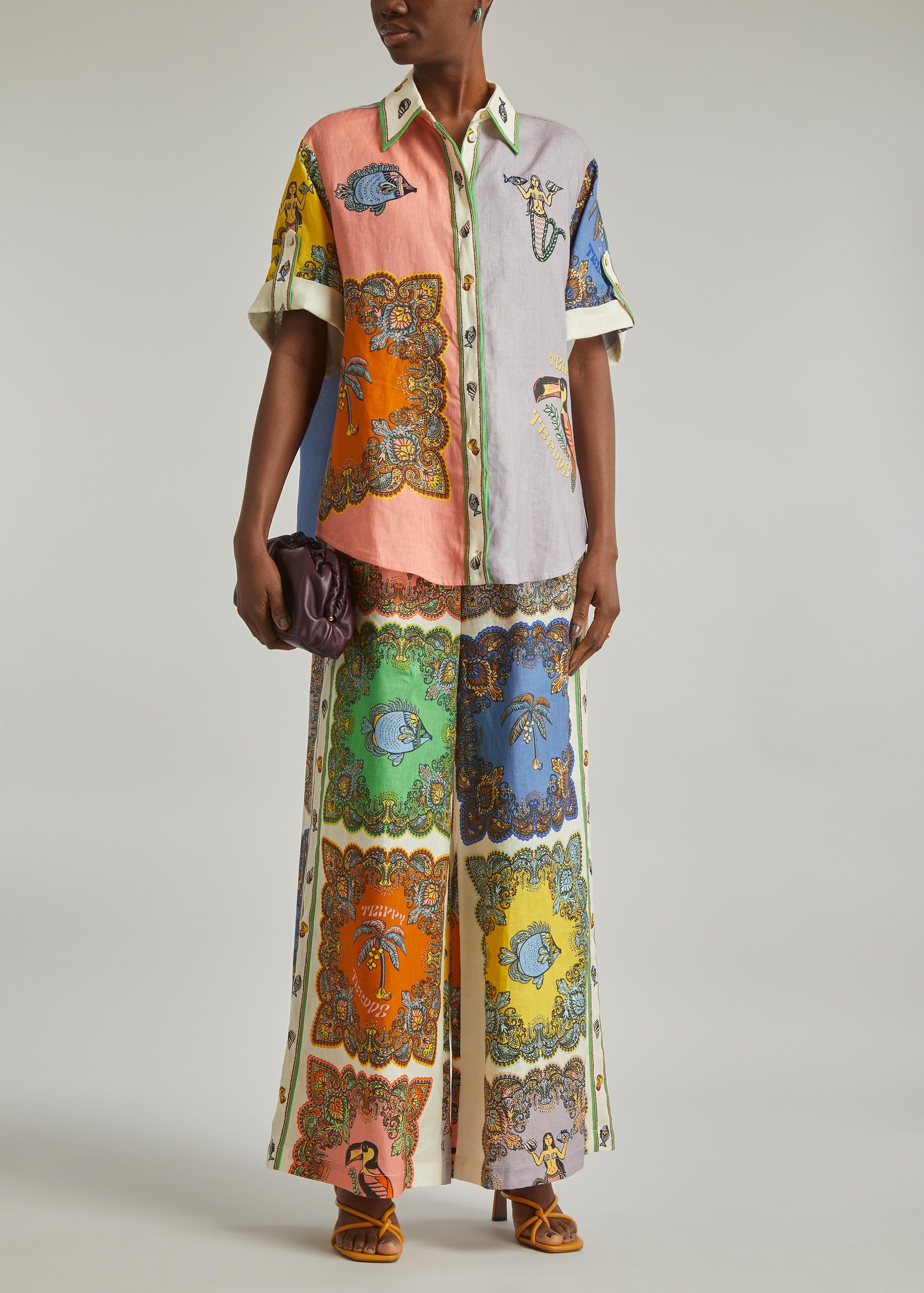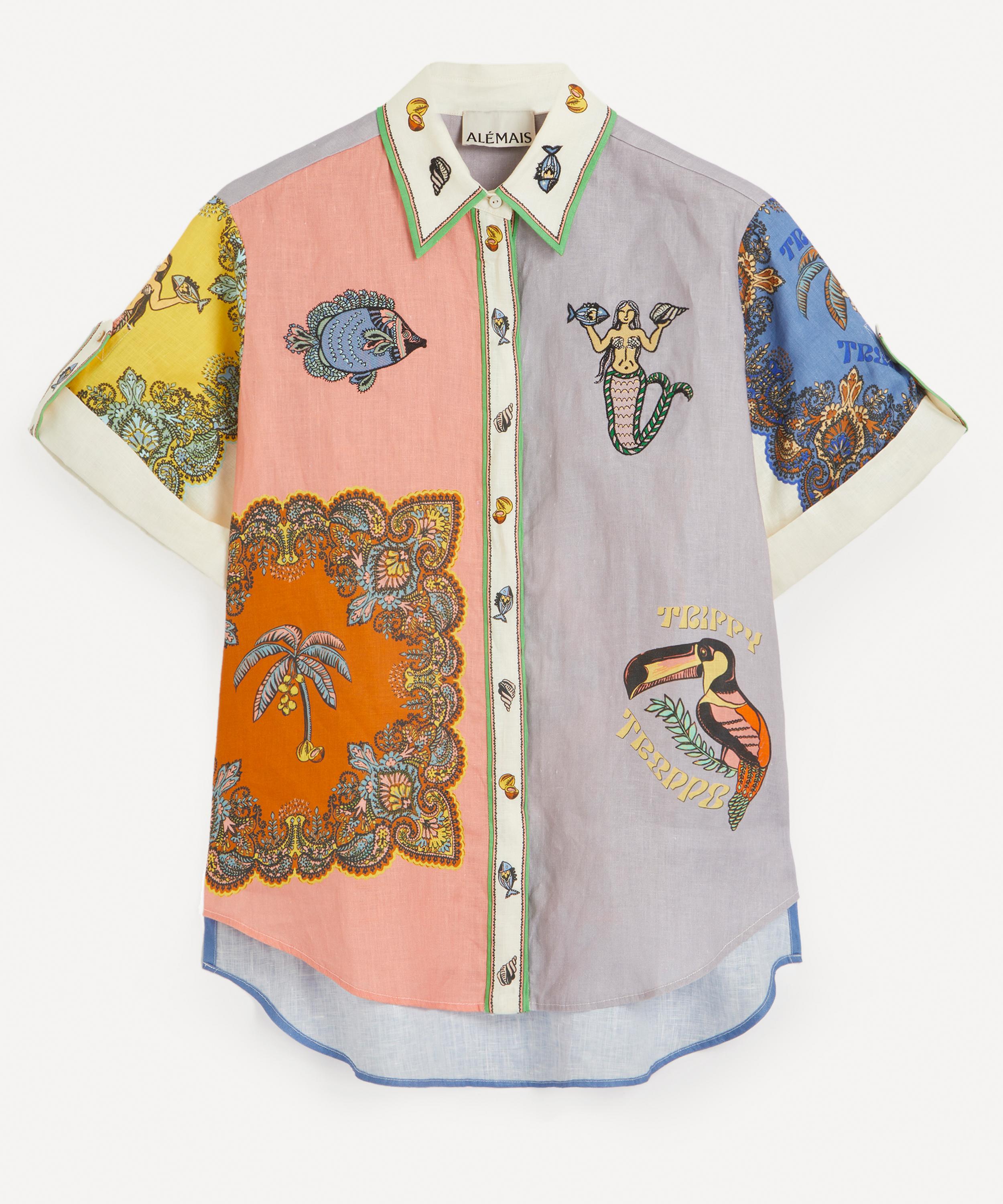 The Trippy Troppo shirtdress from Australian label ALÉMAIS brings a touch of sun-kissed sophistication to your new season edit. Showcasing a mélange of mixed tropical prints depicting mermaids, fish and puffins, its oversized silhouette features an embroidered point-collar, dropped shoulders and relaxed short-sleeves, complete with adjustable buttoned tabs.