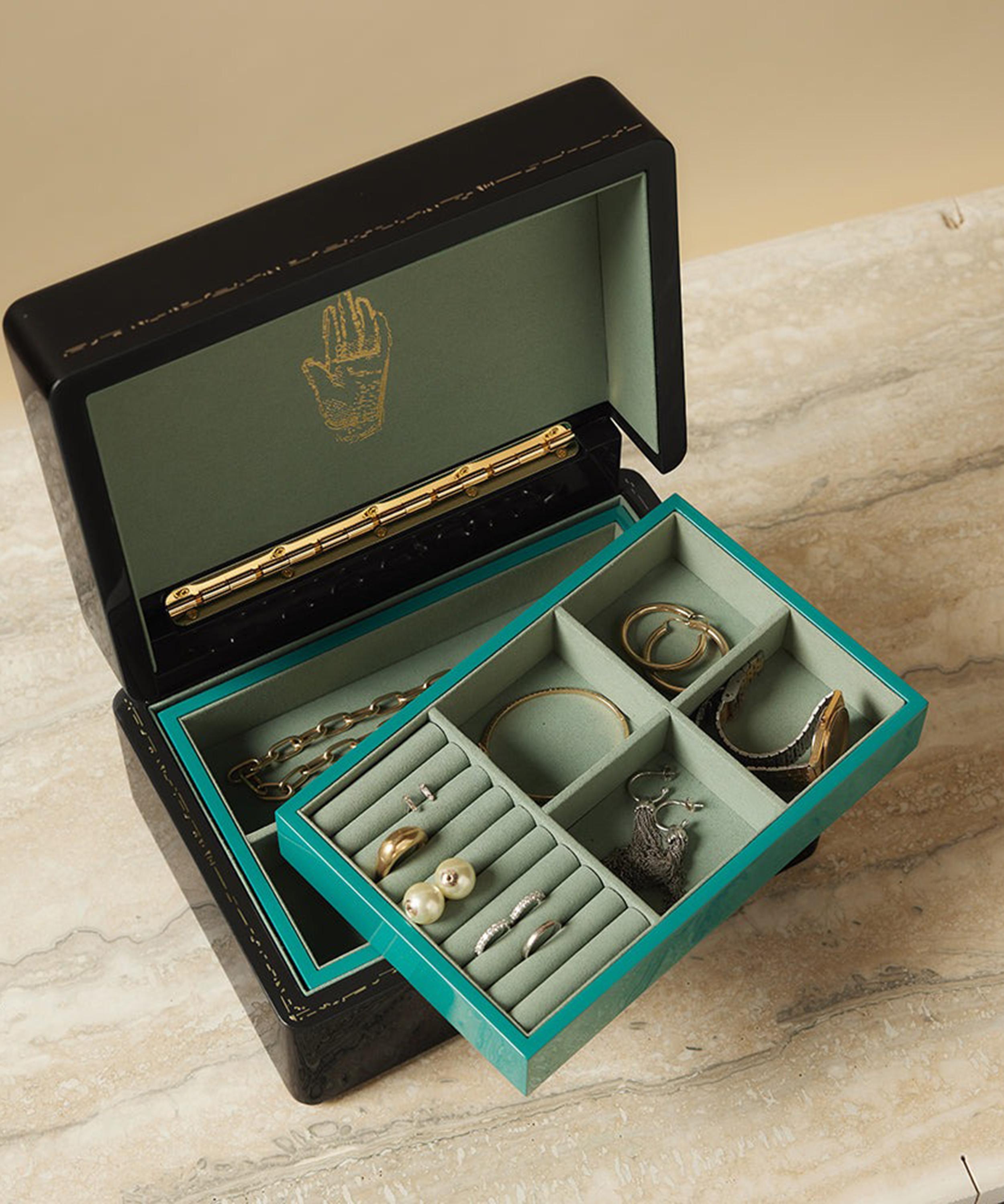 Meticulously handcrafted from solid wood with a lacquered finish, it opens to reveal a thoughtfully designed interior boasting a trio of compartments: a removable tray made for rings and small pieces, a larger second tray for necklaces and earrings, and a third level that’s large enough for your watches, pendants and brooches. The perfect gift for a loved one, or yourself, it makes storing your precious pieces as pleasurable as wearing them.