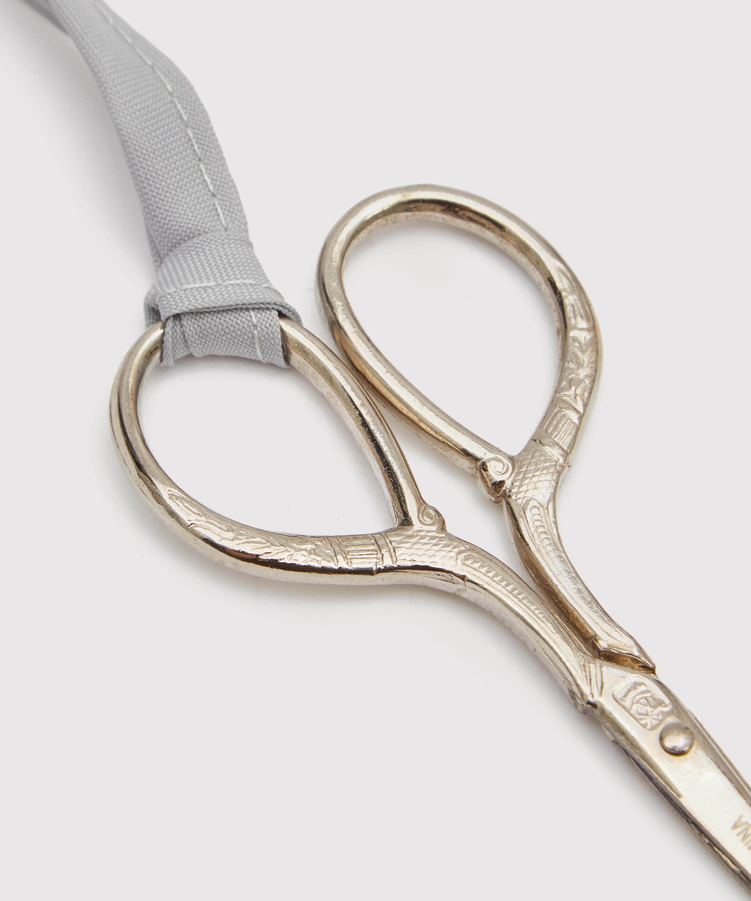 - Ribbon attaches scissors to case