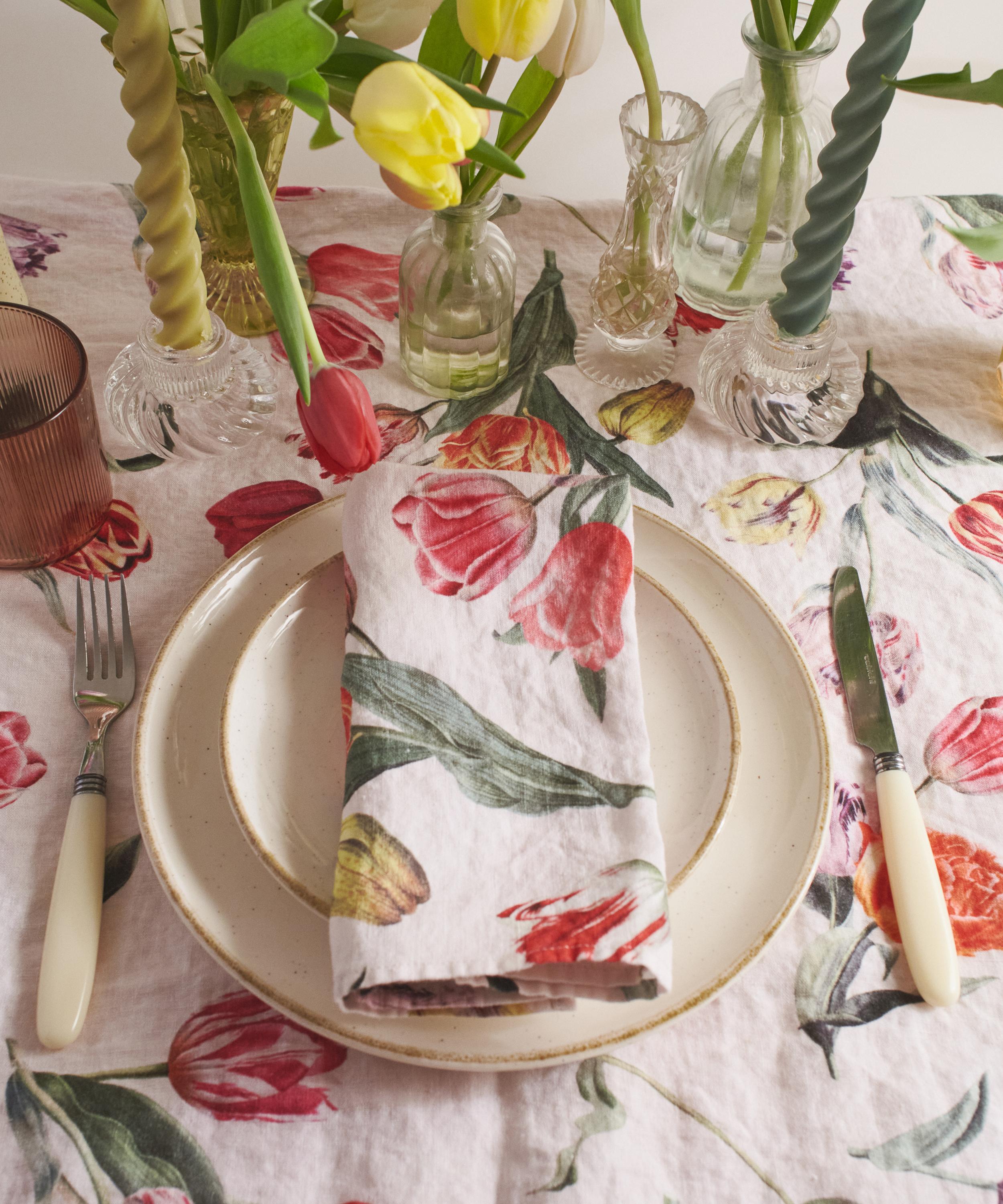 Crafted from stone washed European linen, this tablecloth is hand-painted with an exclusive tulip print that draws inspiration from the bright floral hues of springtime. A celebration of nature, each tablecloth is designed in East London and printed exclusively for the collection in Lithuania. Pair with the matching napkins to create a floral-inspired dining set-up.