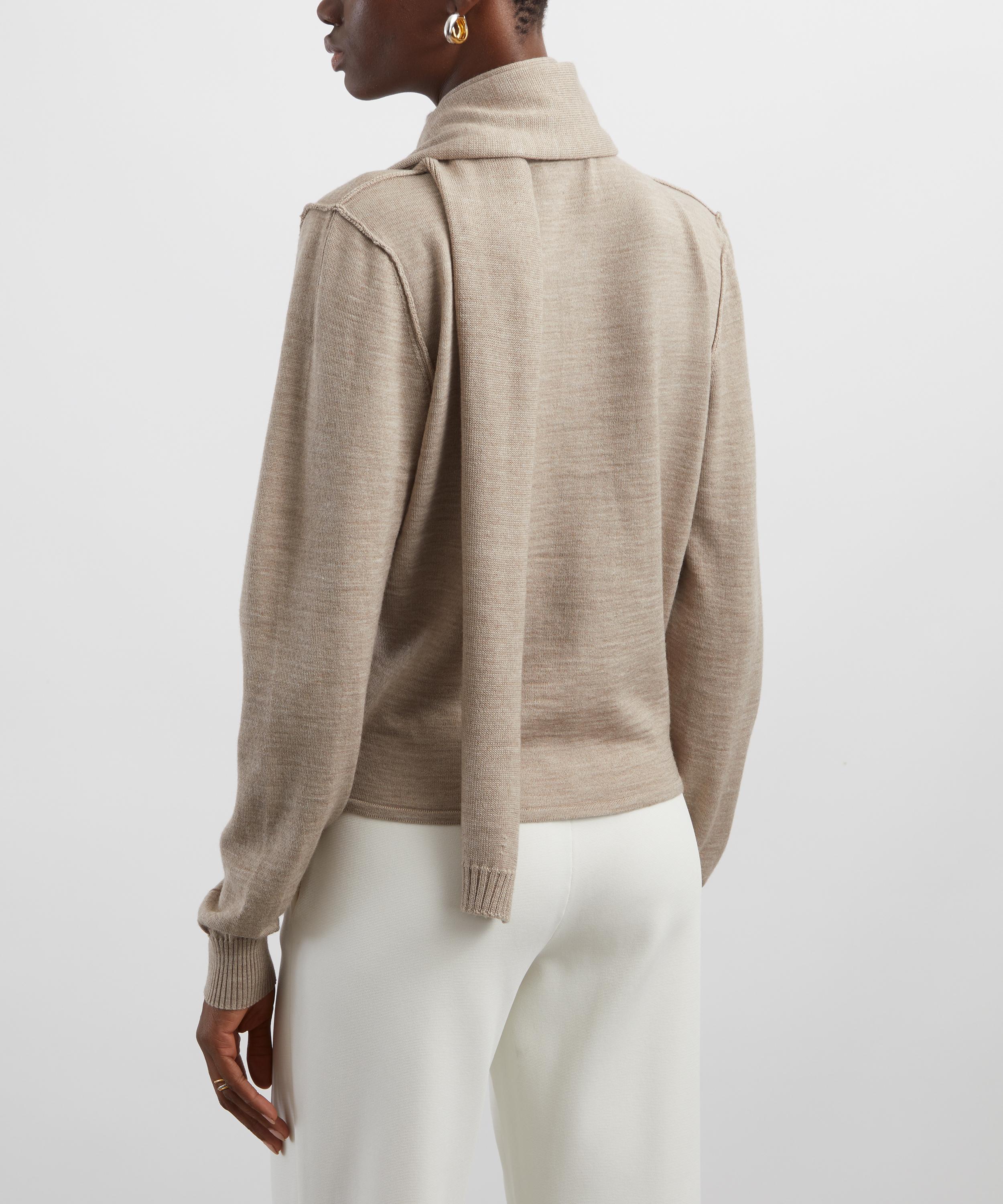 Crafted from a soft Merino wool blend, this abstract knit features an asymmetrical button placket that wraps around the waist, fastening at the side seam. Designed with an integrated scarf, it offers versatile styling options for a dynamic, layered look.