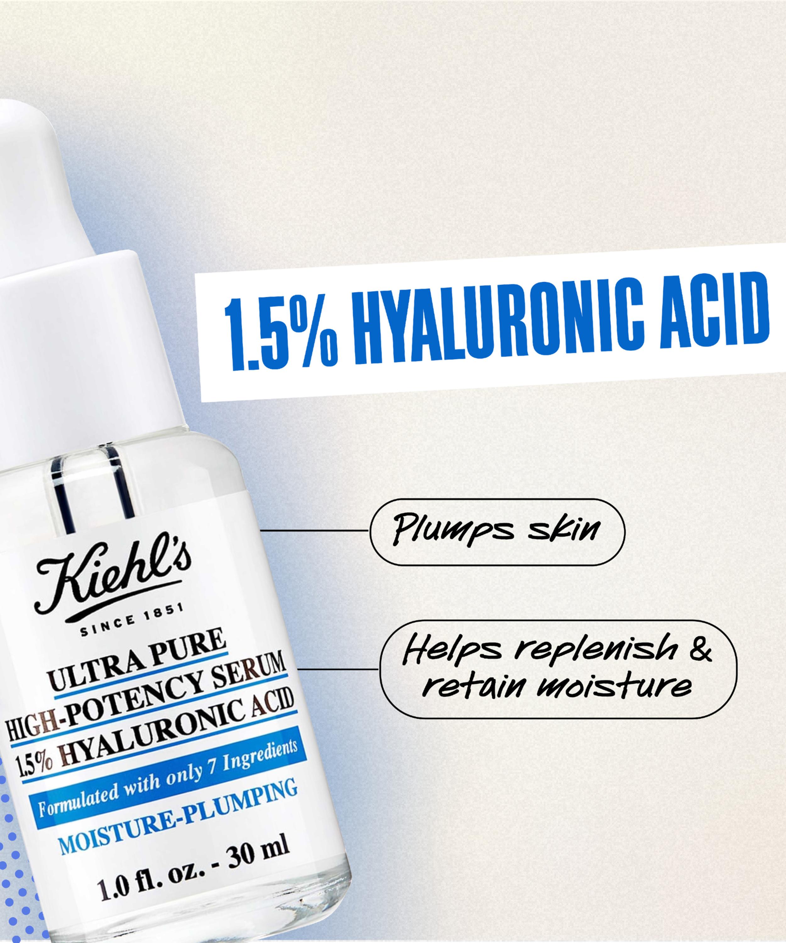Transform dry, sensitive skin with the replenishing Ultra Pure High-potency Serum 1.5% Hyaluronic Acid from Kiehl's, formulated to quench dehydrated skin, leaving it deeply moisturised and plumped.