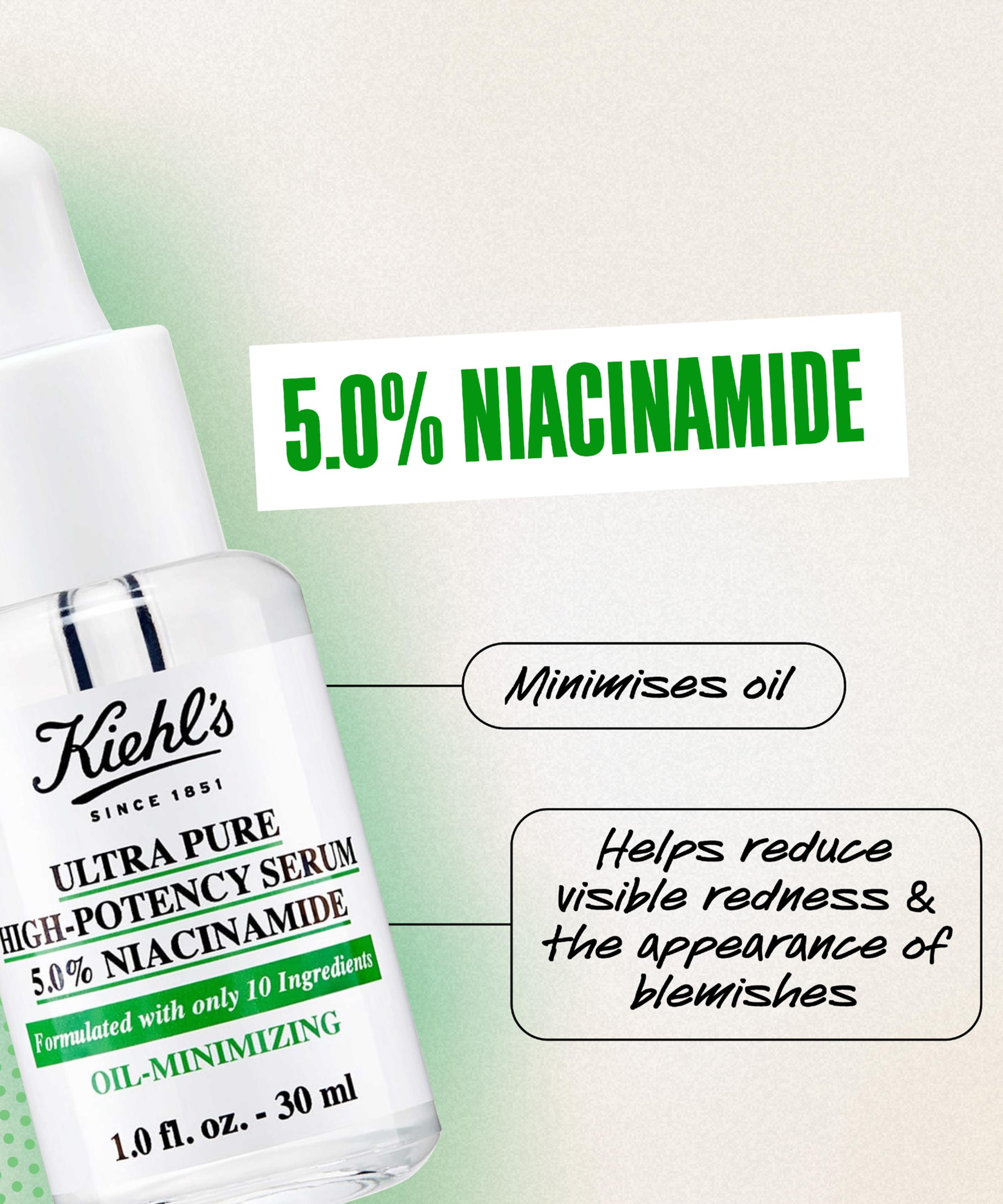 Transform oily complexions with the Ultra Pure High-Potency Serum 5.0% Niacinamide from Kiehl's, formulated to reduce imperfections and excess oil and minimise shine.