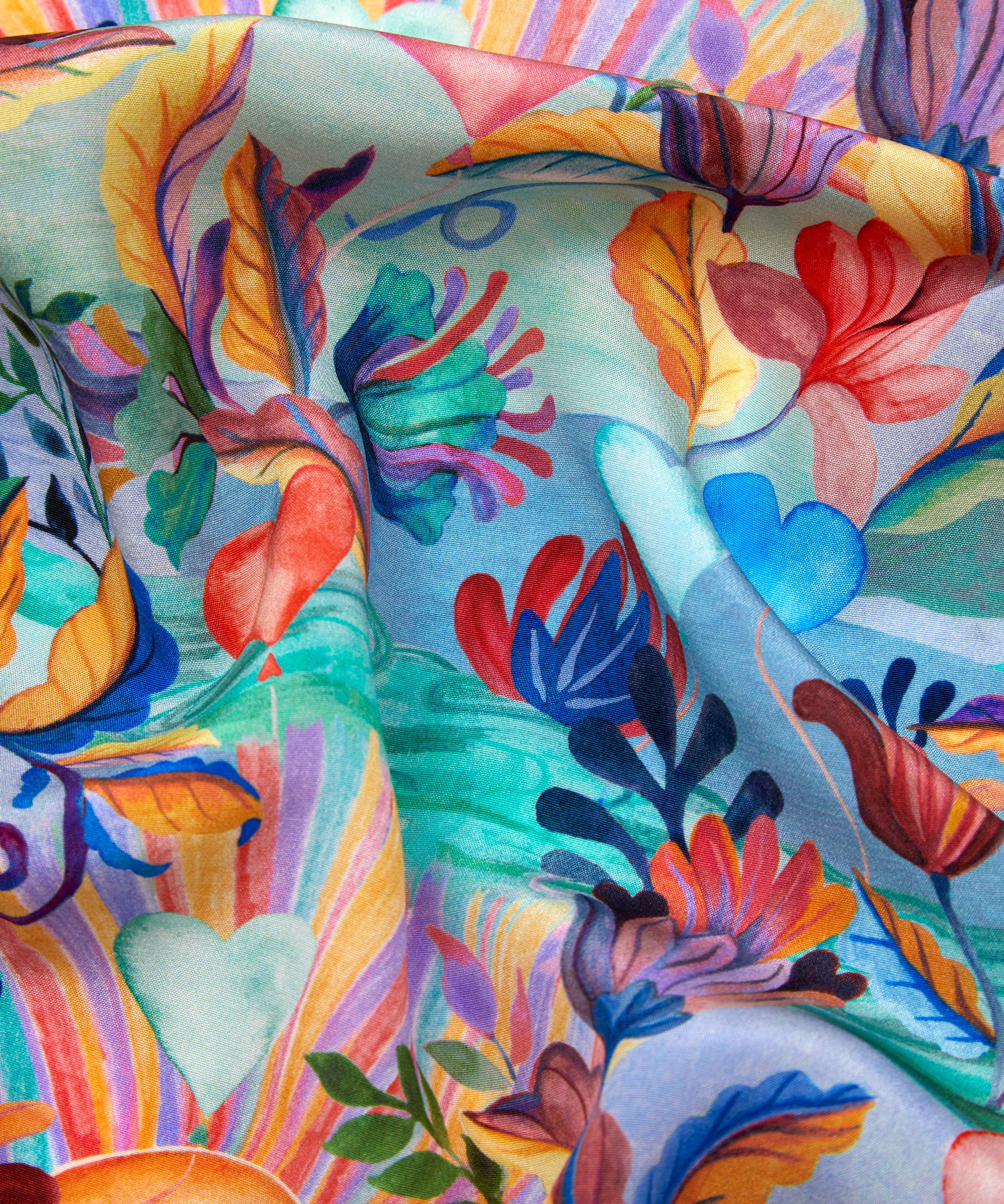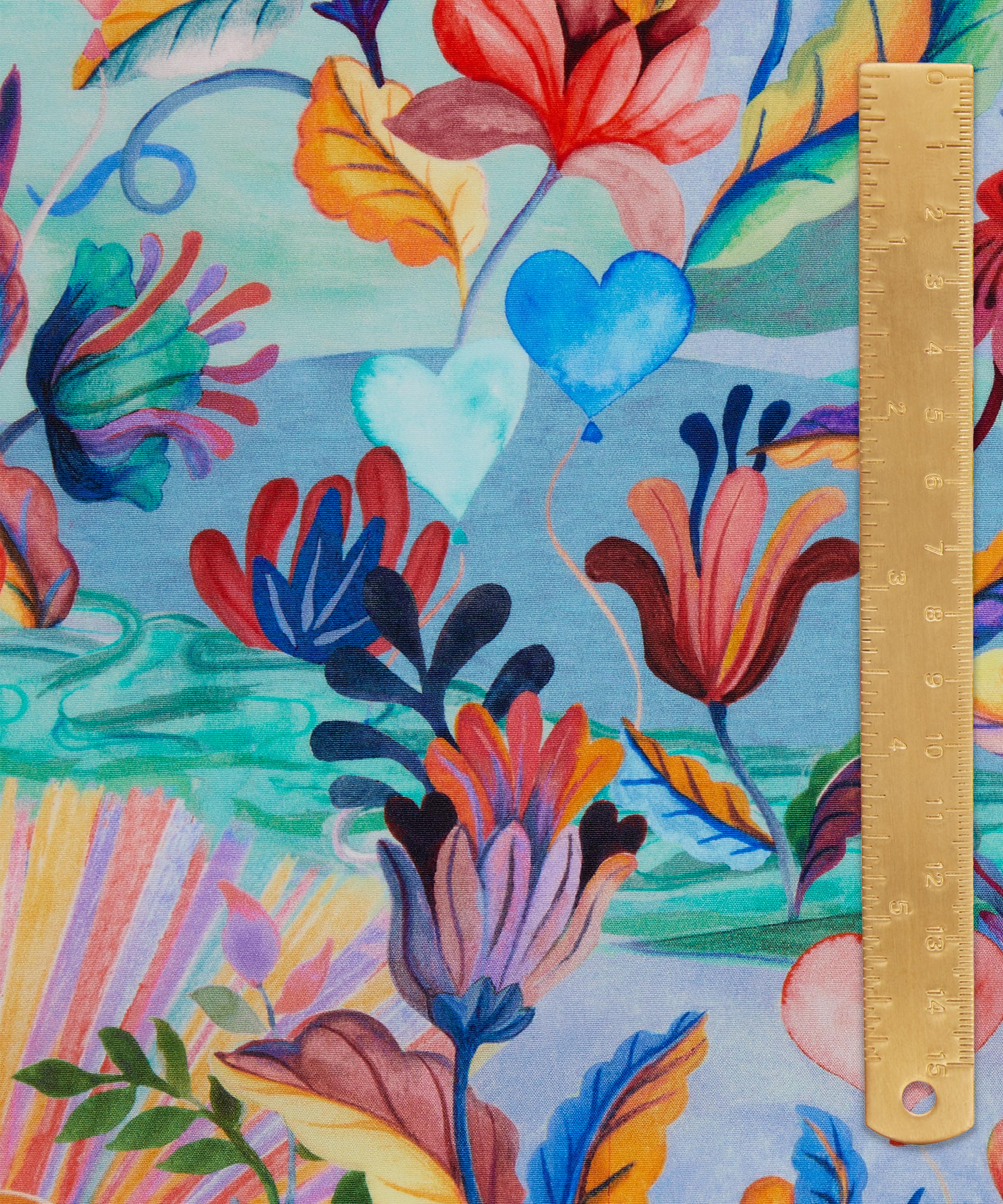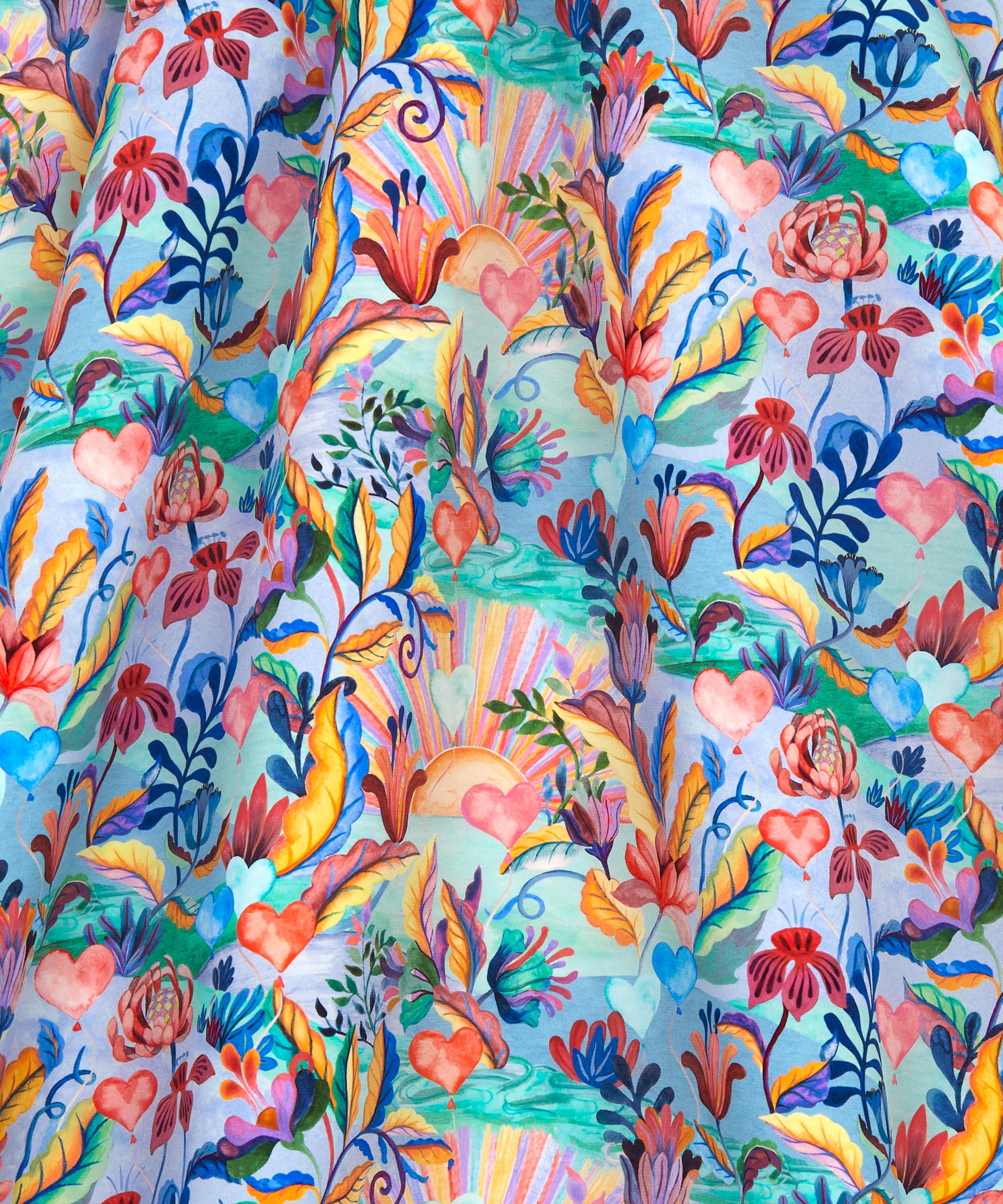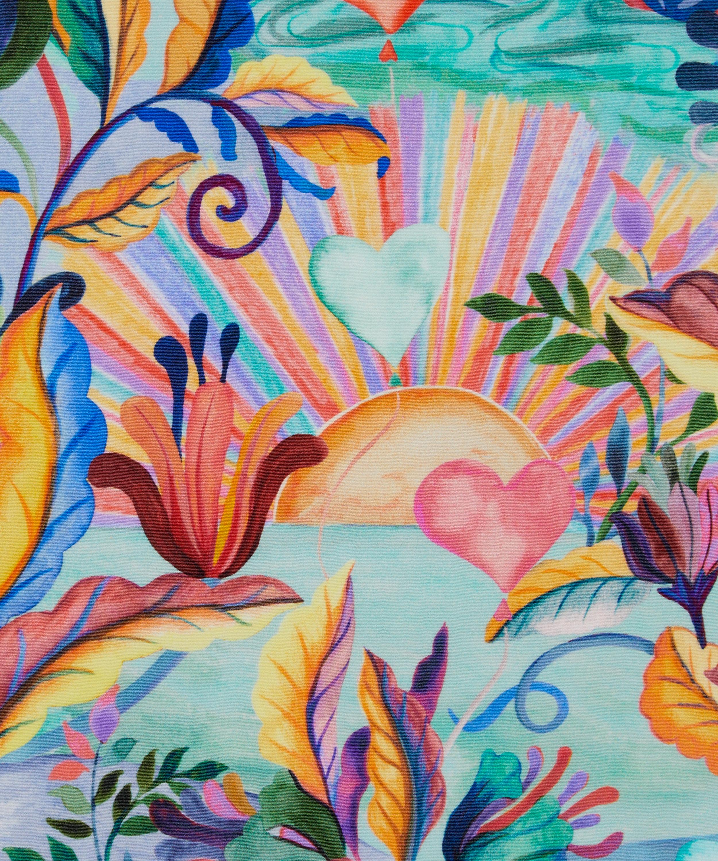 The colour yellow is aligned with positivity and optimism: happiness, sunshine and spring. To reflect this, Una Landscape depicts a picture-perfect world of joy. Painted in watercolour, the design features a meandering landscape where blossoming spring flowers and heart shaped balloons are set against an ever-rising sun. This print is part of the Yellow story of our Spring/Summer 2024 collection, examining the joyful spirit of this multi-faceted colour, with designs influenced by art movements such as Expressionism and Symbolism to the radiant beauty of pretty primulas, primroses, lemons, bees and buttercups.