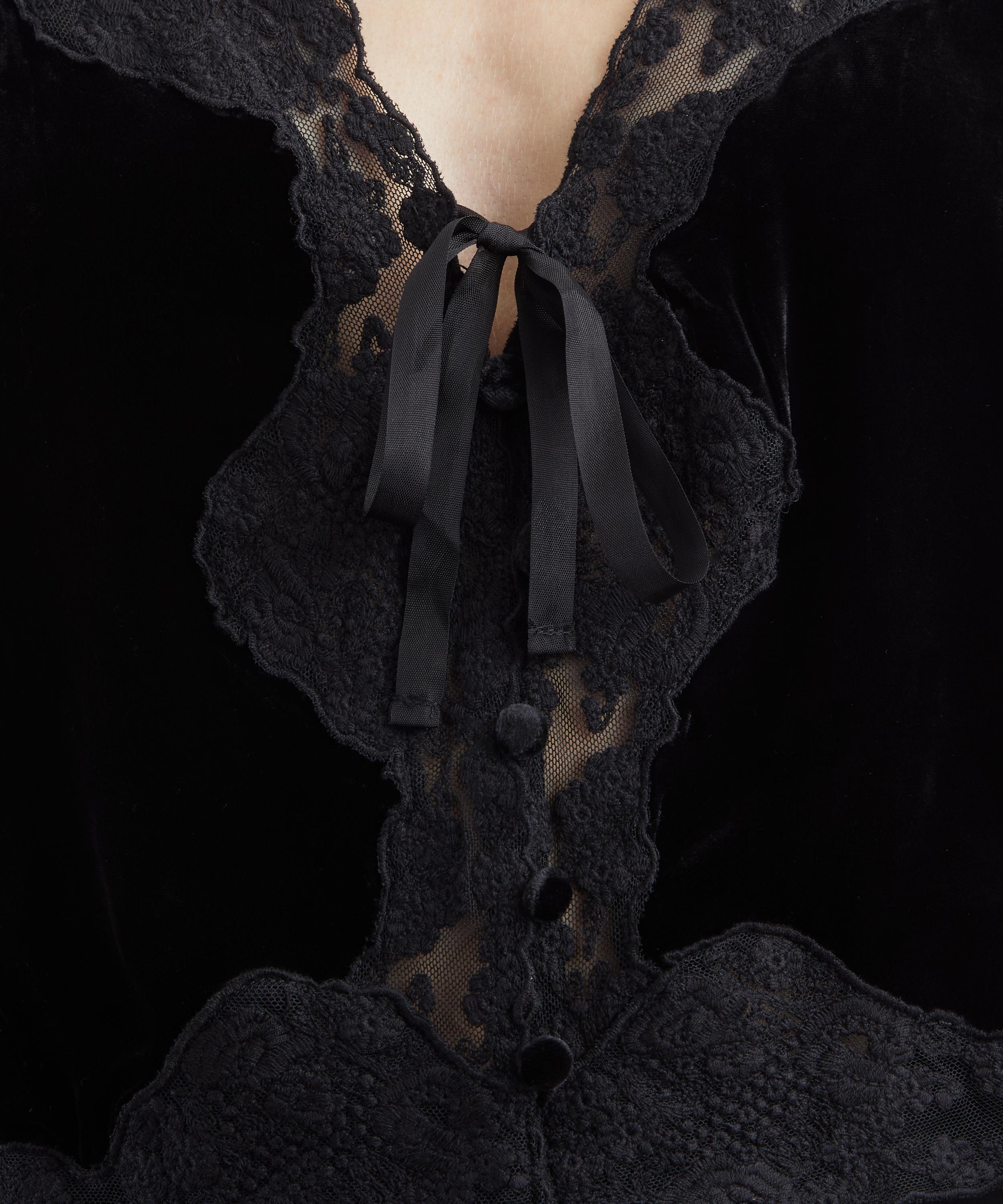 Blending boho glamour with dark romanticism, the Ursula top is an effortlessly chic party piece. Crafted from plush silk velvet and finished with delicate lace detailing throughout, it’s designed for a loose, floaty fit with a V-neckline, short sleeves, and button fastening.