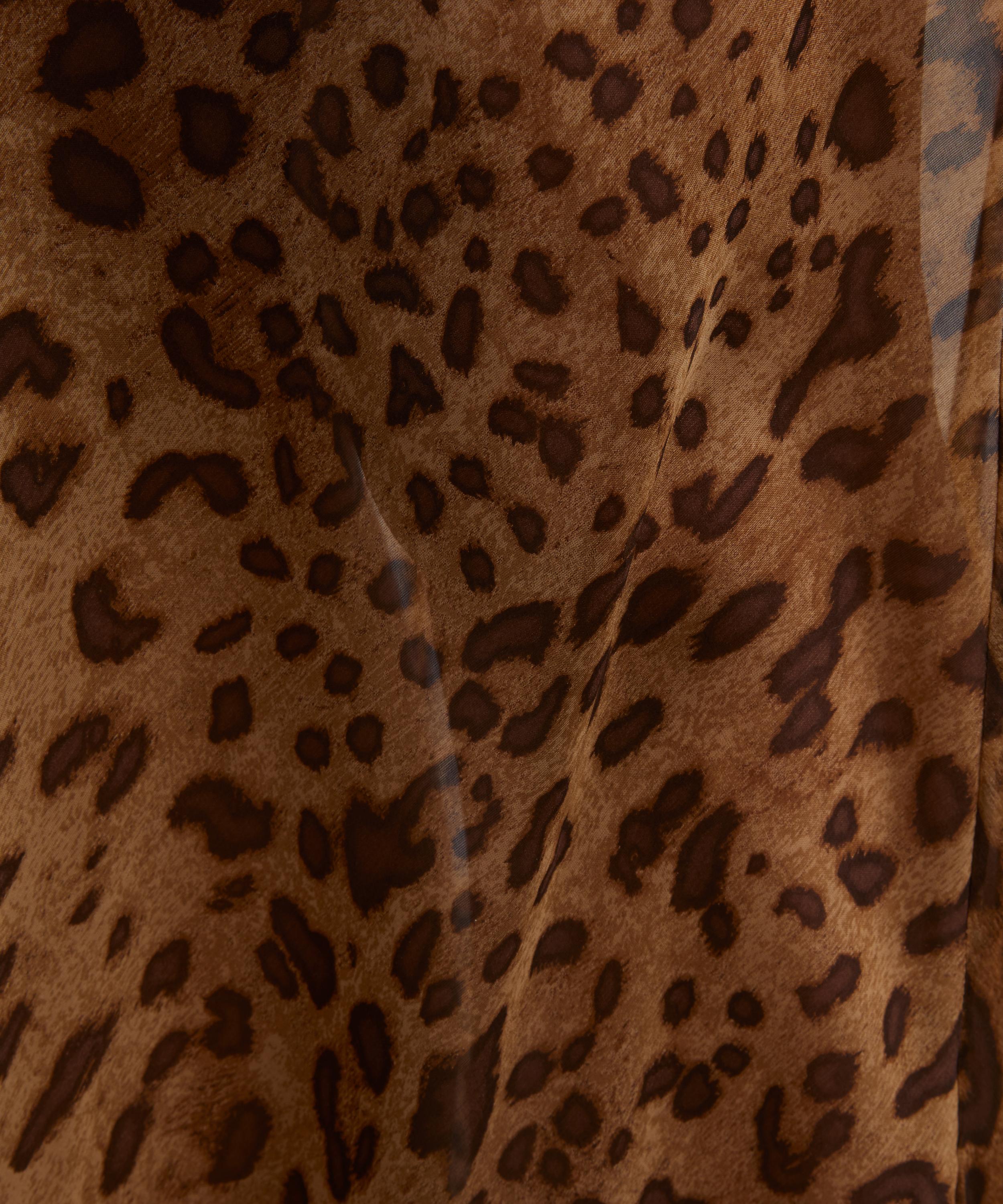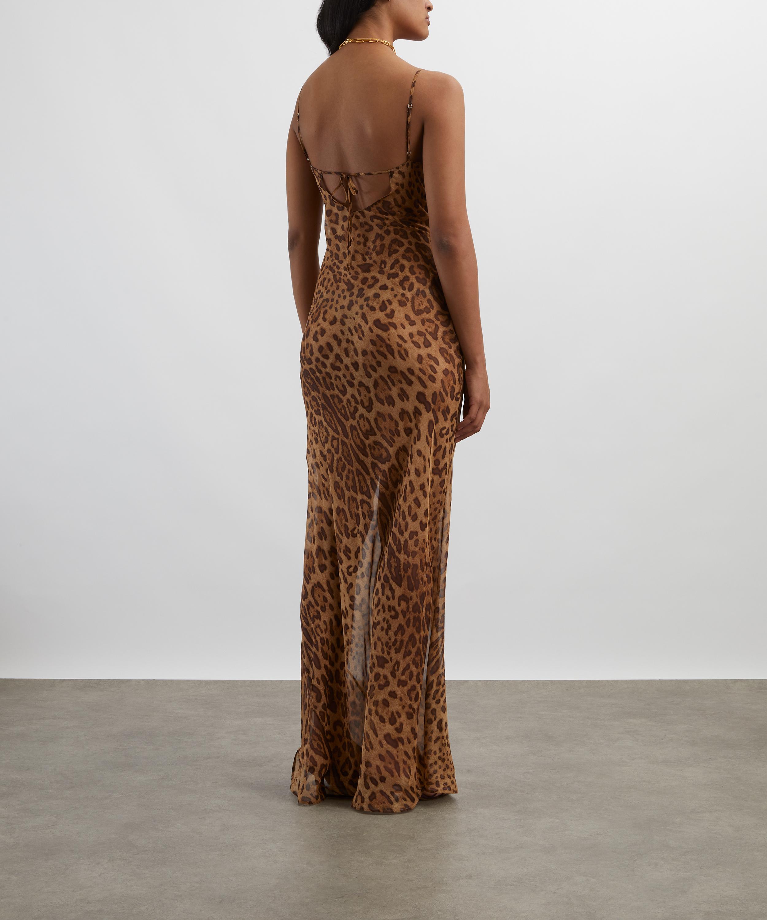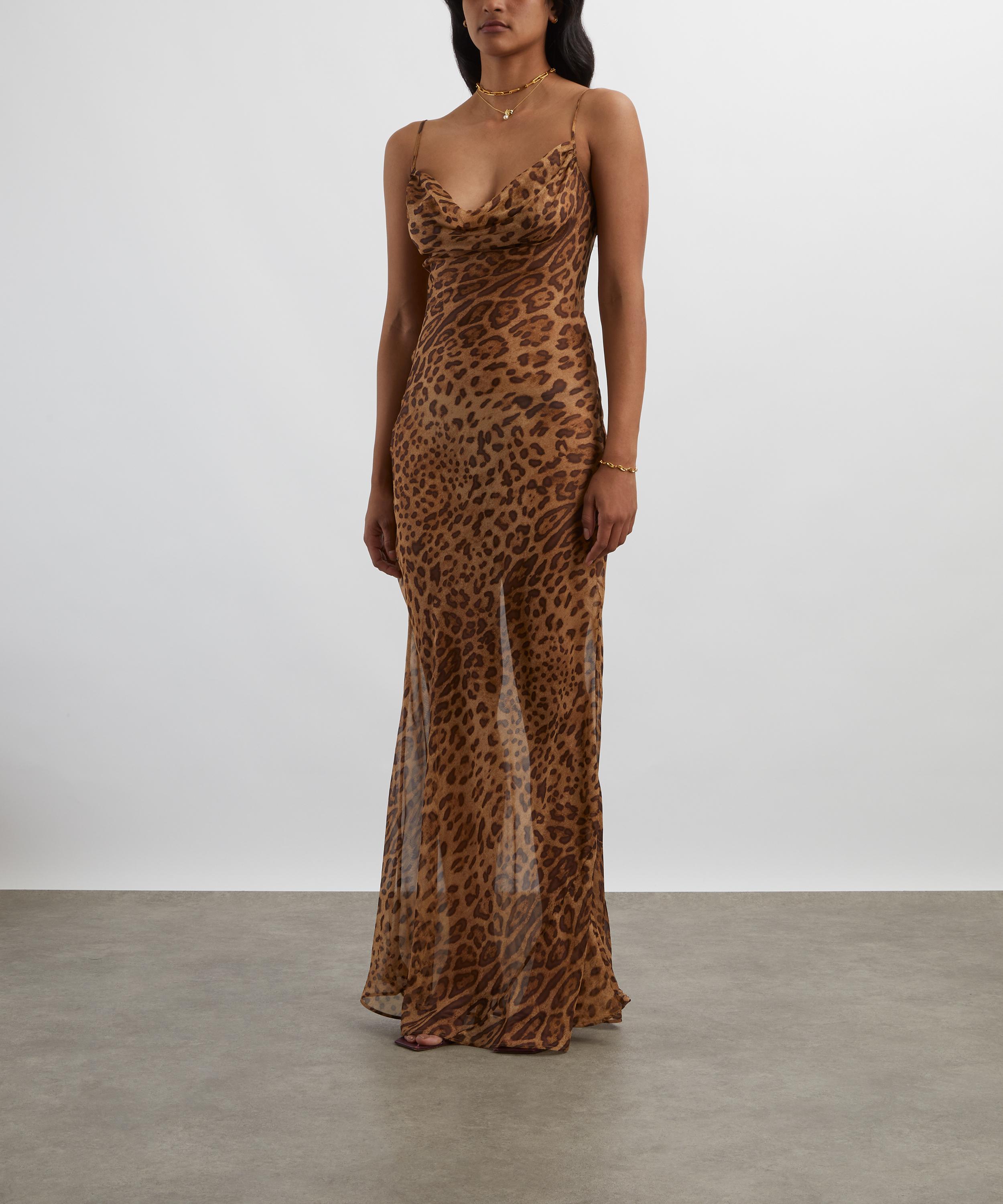 Crafted from semi-sheer silk adorned with a striking leopard print, this sleek maxi dress exudes sophistication with its figure-skimming sheath silhouette, cowl neckline, and open back.