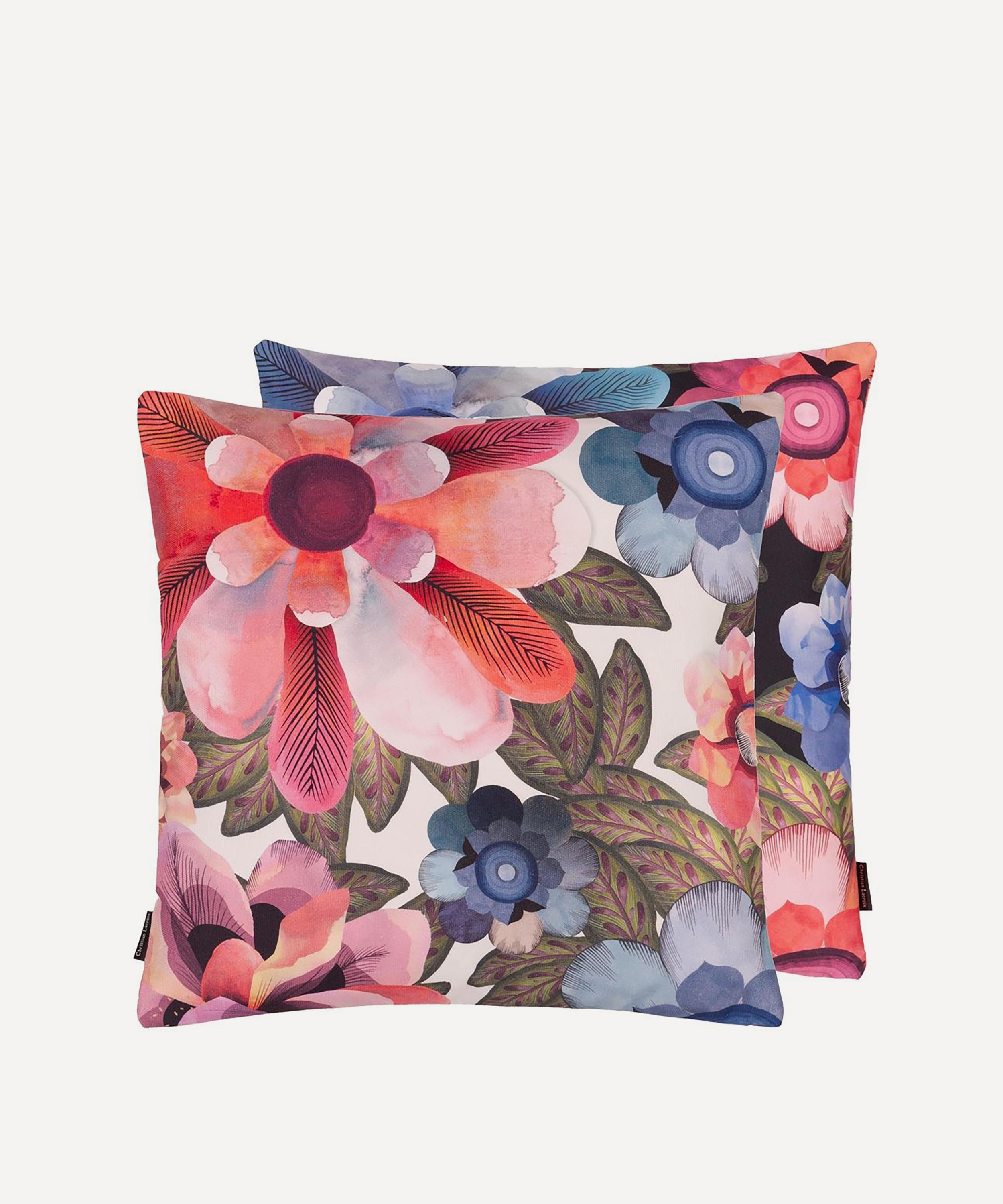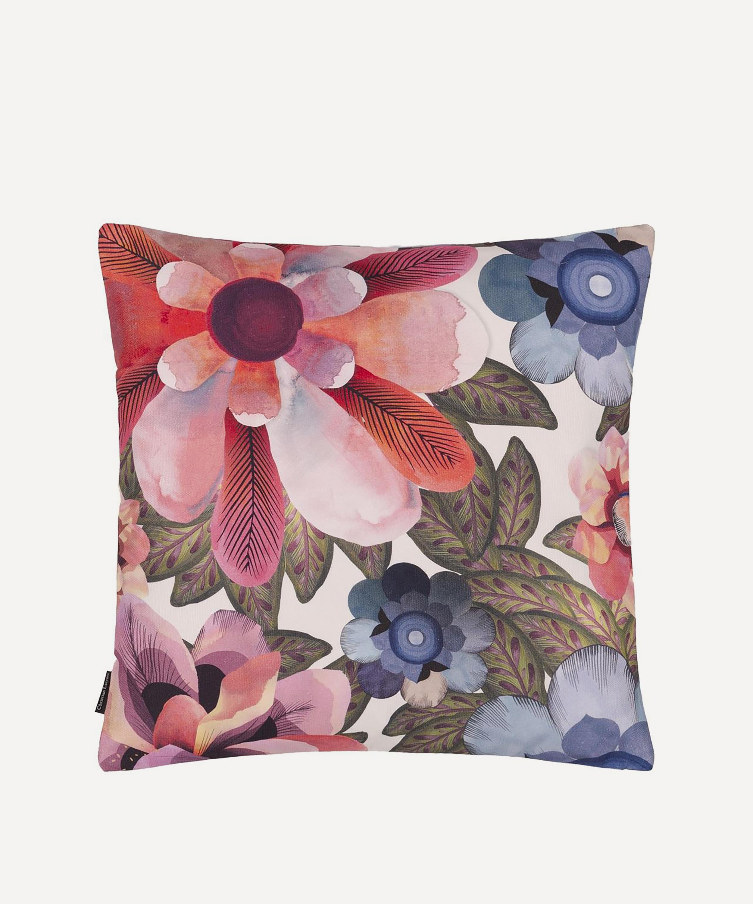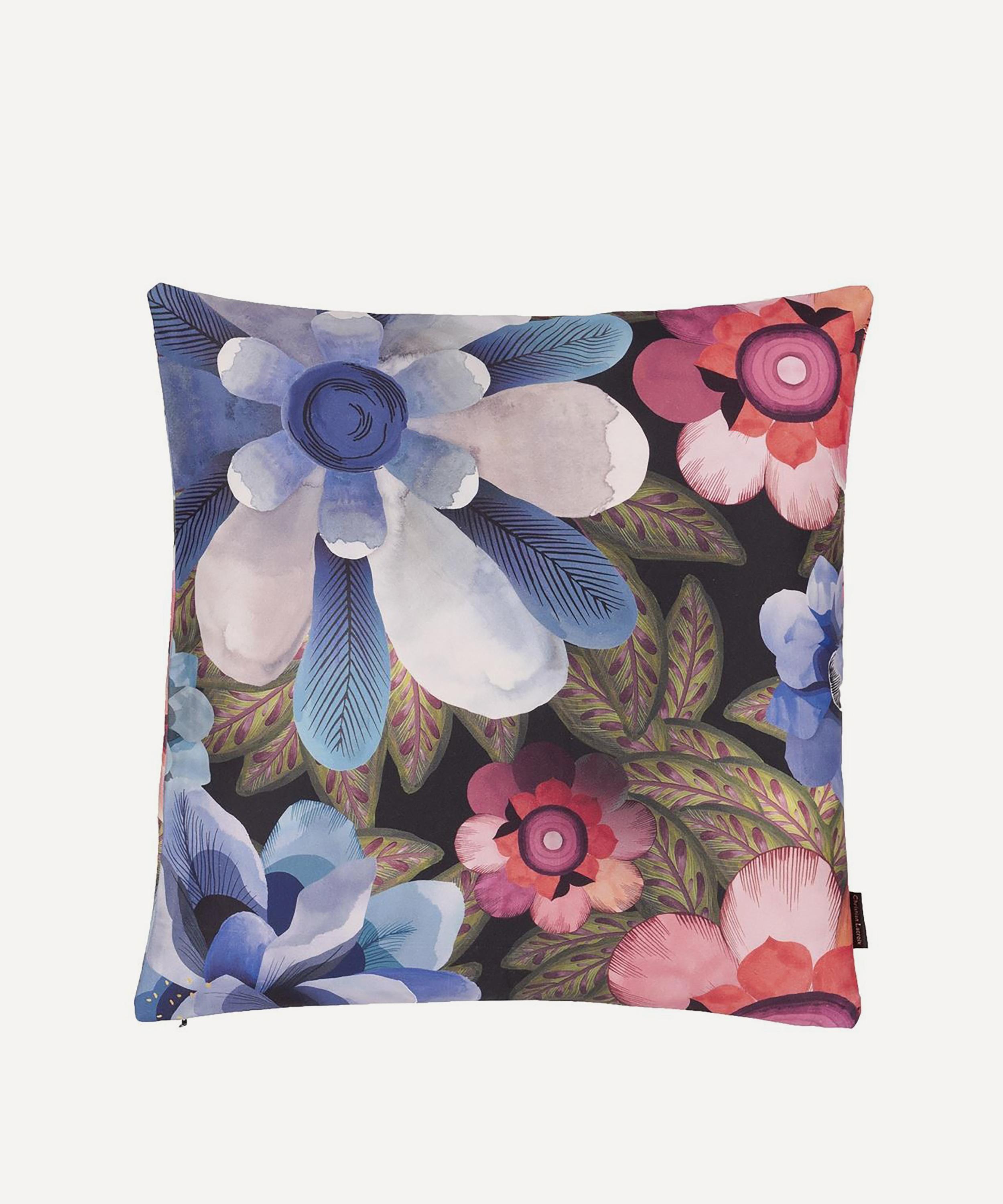 Spotlighting a contemporary geometric pattern to the front, this cushion is digitally printed with densely clustered poppies and cosmos flowers onto a textural cotton canvas. With a luxe cotton satin reverse, style with block colours to enhance the vibrant design.
