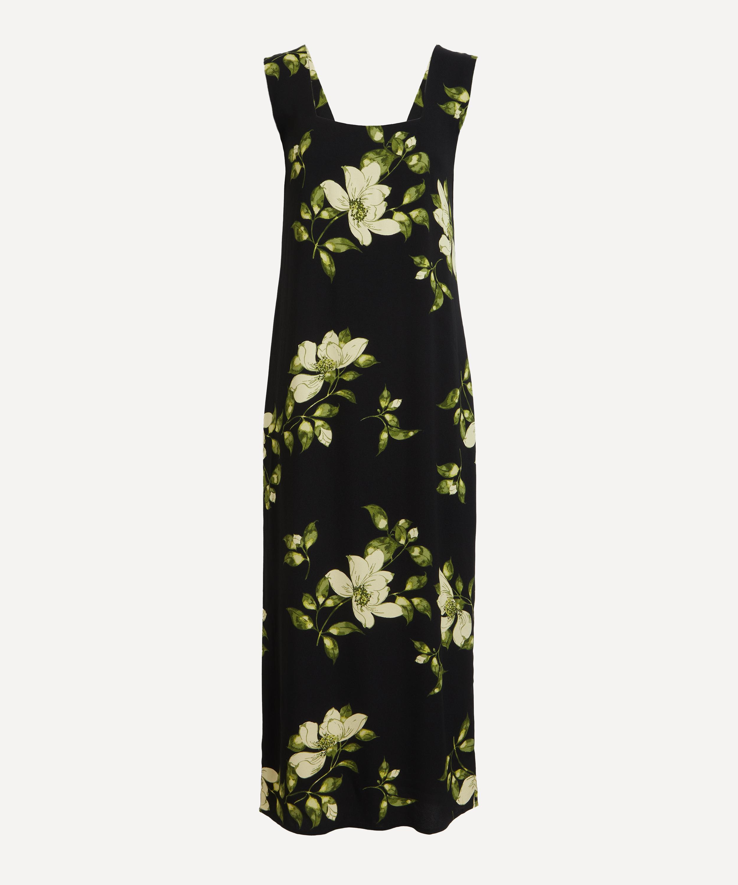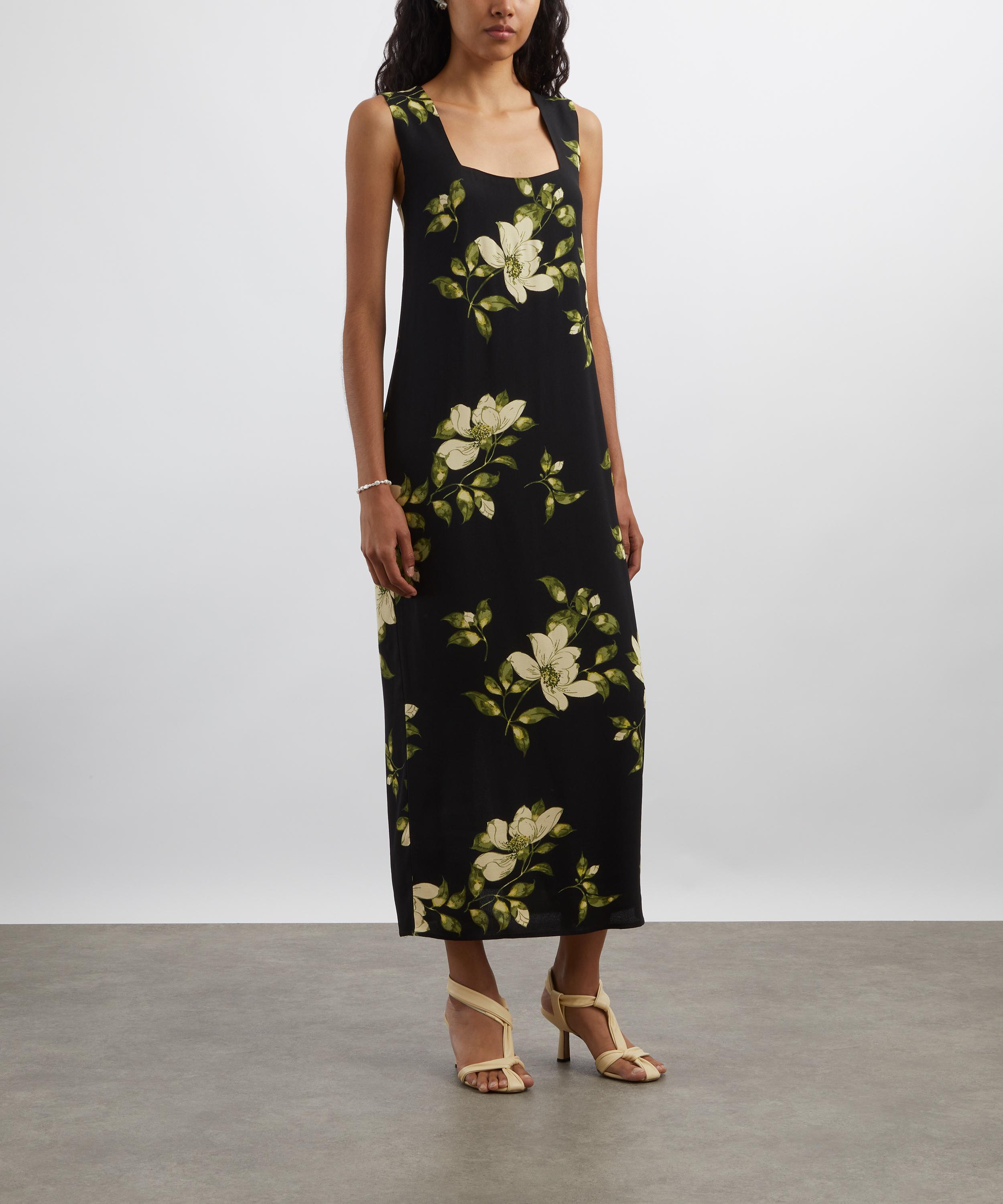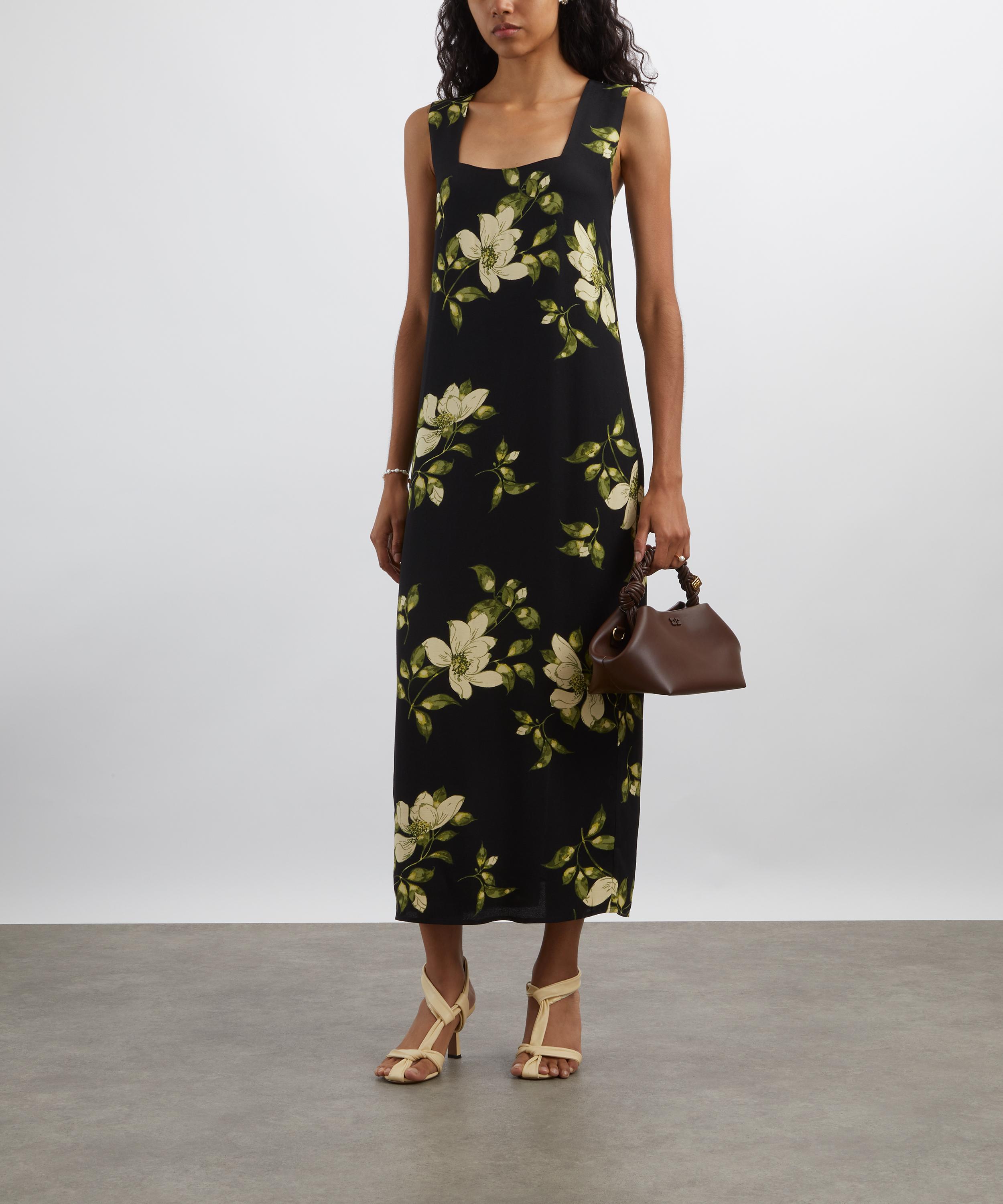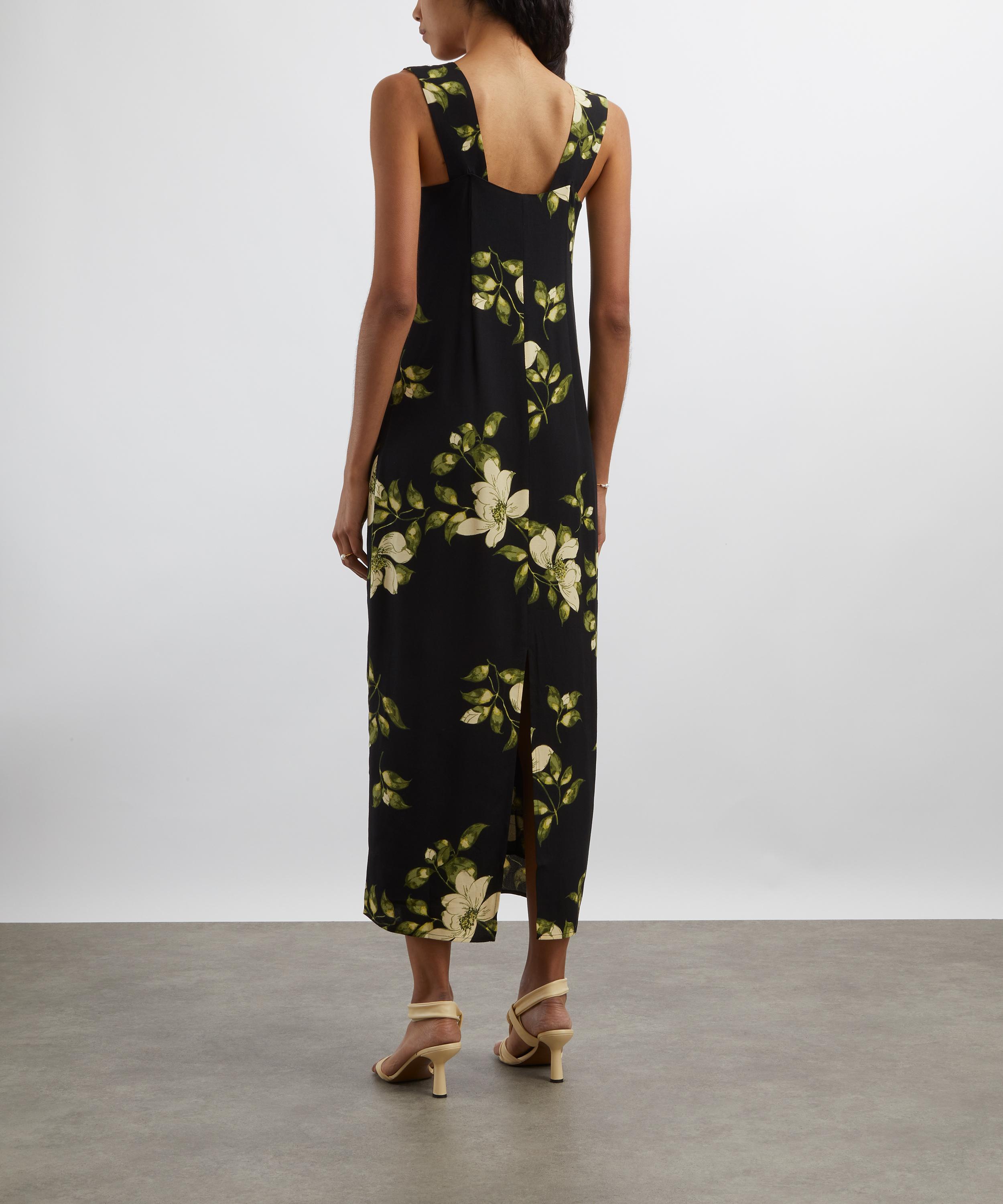 Crafted from lightweight crepe adorned with black florals, the Vea Dress exudes effortless elegance. Cut for a relaxed fit, it features a clean square neckline and subtle back vent, creating an effortlessly sophisticated silhouette with a modern edge.