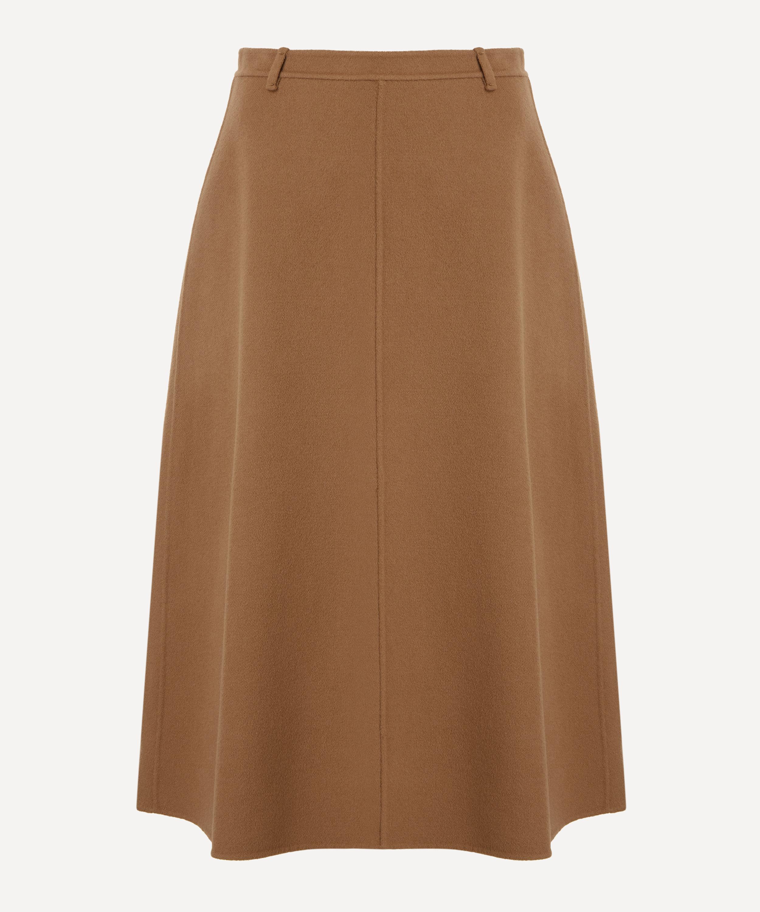 Crafted from hand-sewn double-faced wool broadcloth in a timeless hazelnut hue, this midi skirt offers a flattering flared silhouette complete with a concealed zip fastening, belt loops, and pure silk lining for a luxurious finish.