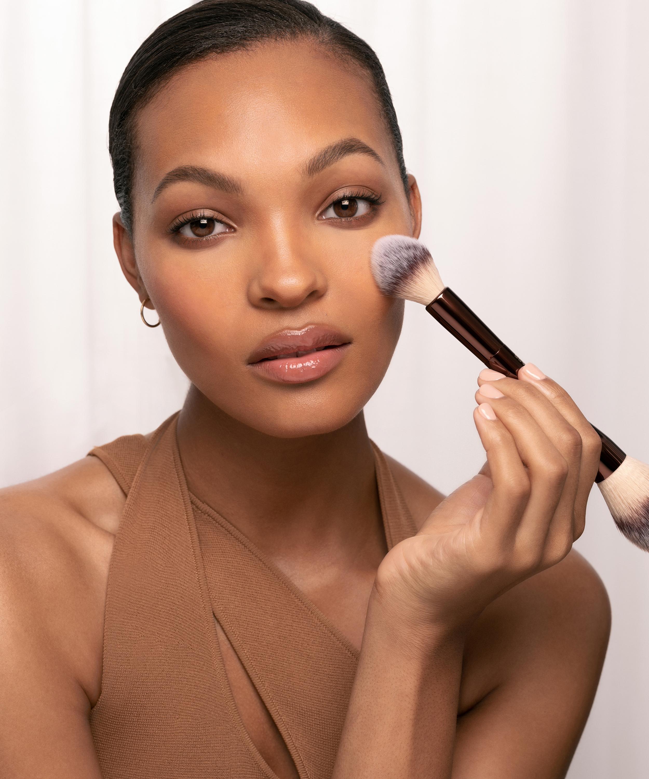Using a powder brush, pick up a small amount of powder and tap off excess. Apply all over the face to set makeup.