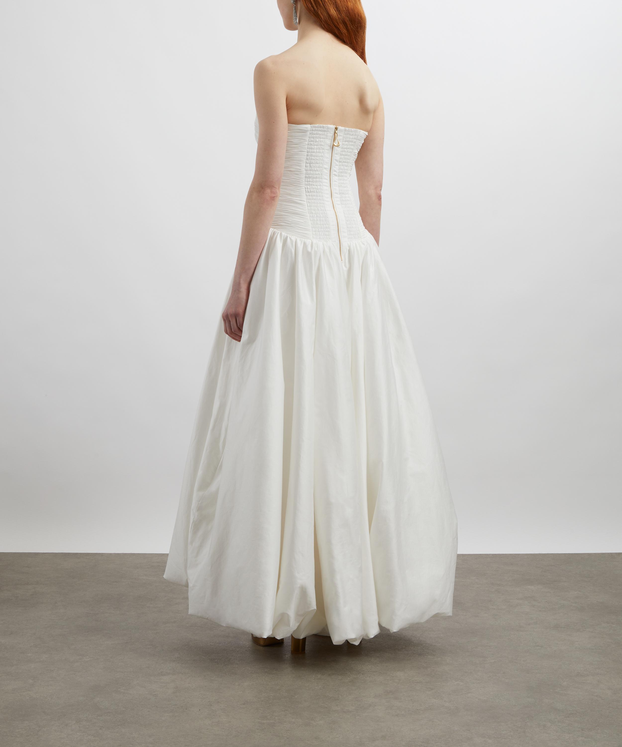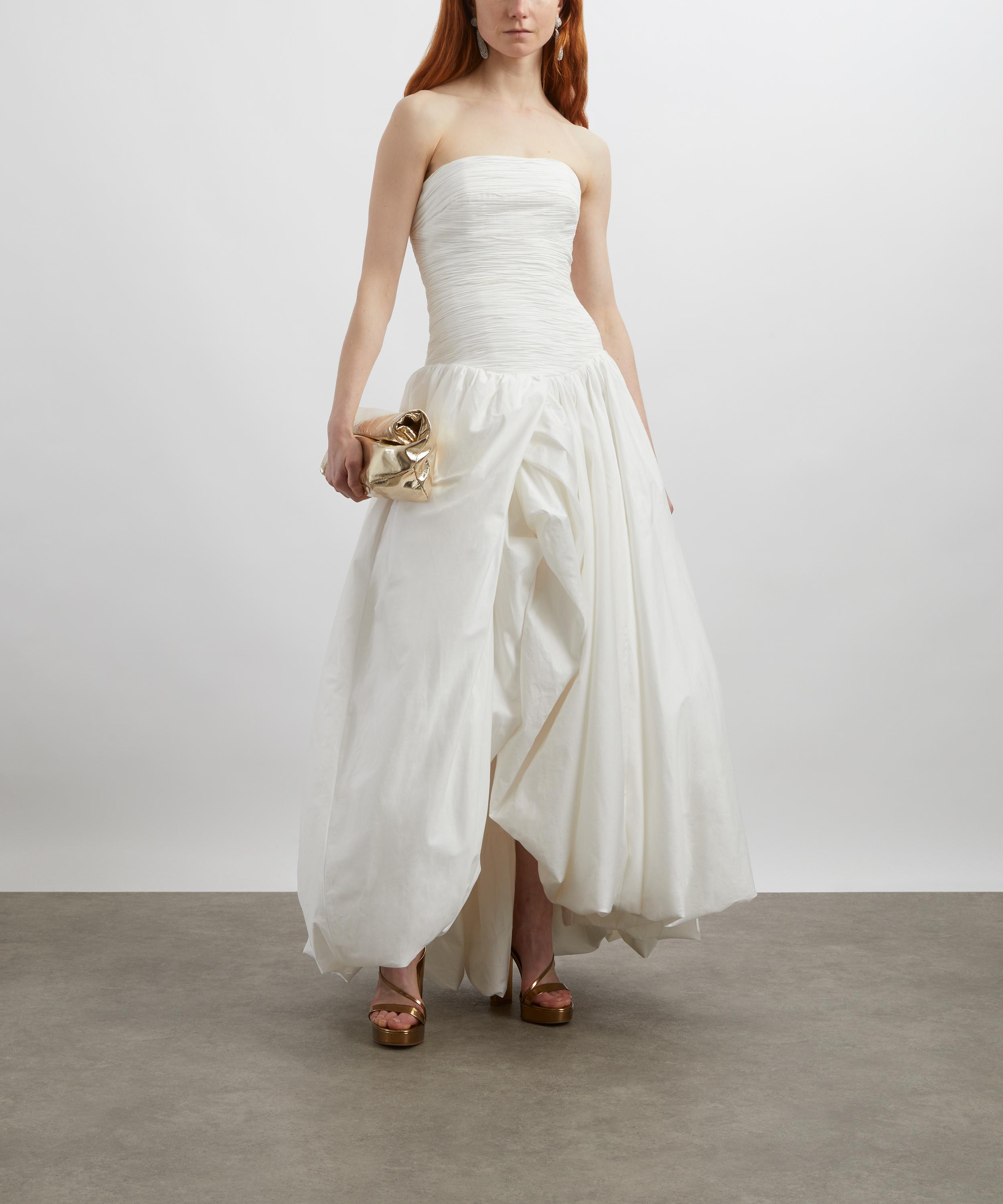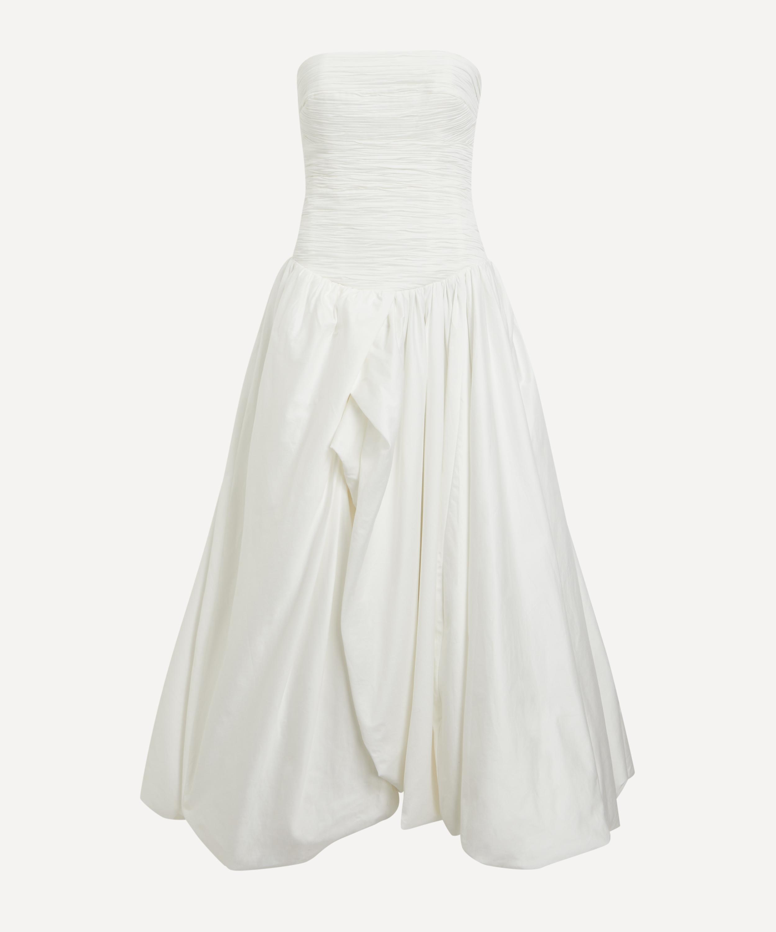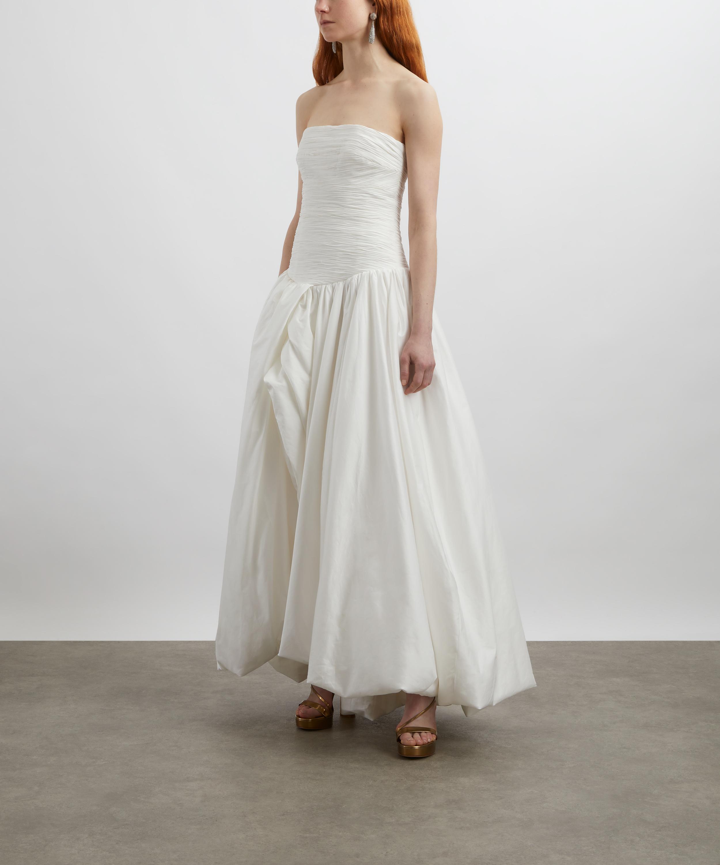 With its strapless, ruched bodice, draped full skirt, and voluminous asymmetric bubble hem, the Violette maxi dress makes a bold and unforgettable statement. Crafted from cotton, the ivory gown is beautifully finished with a decorative gold zip at the back for an added touch of sophistication.
