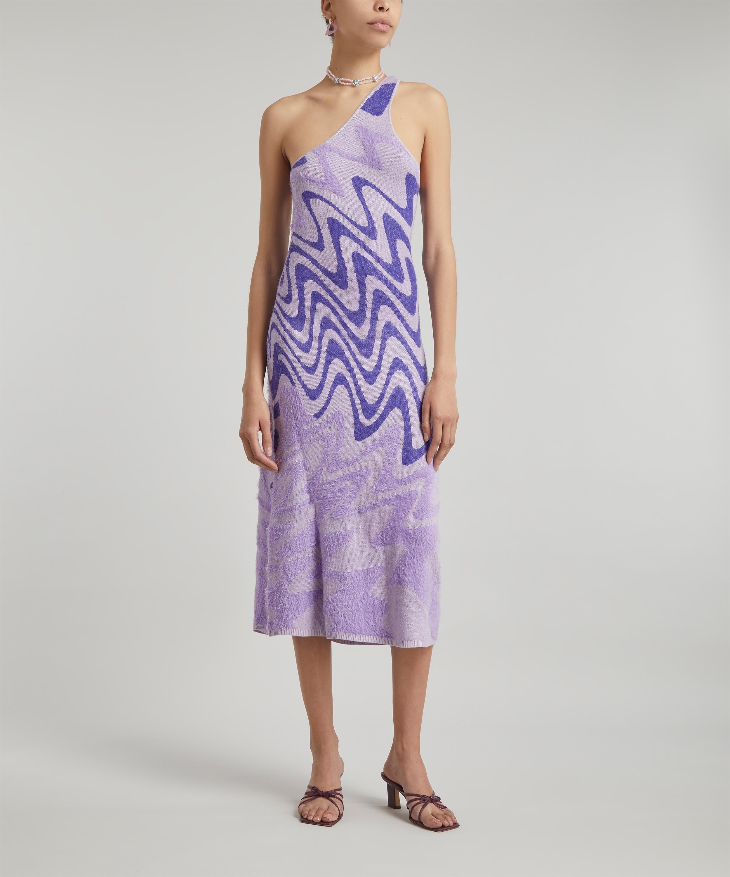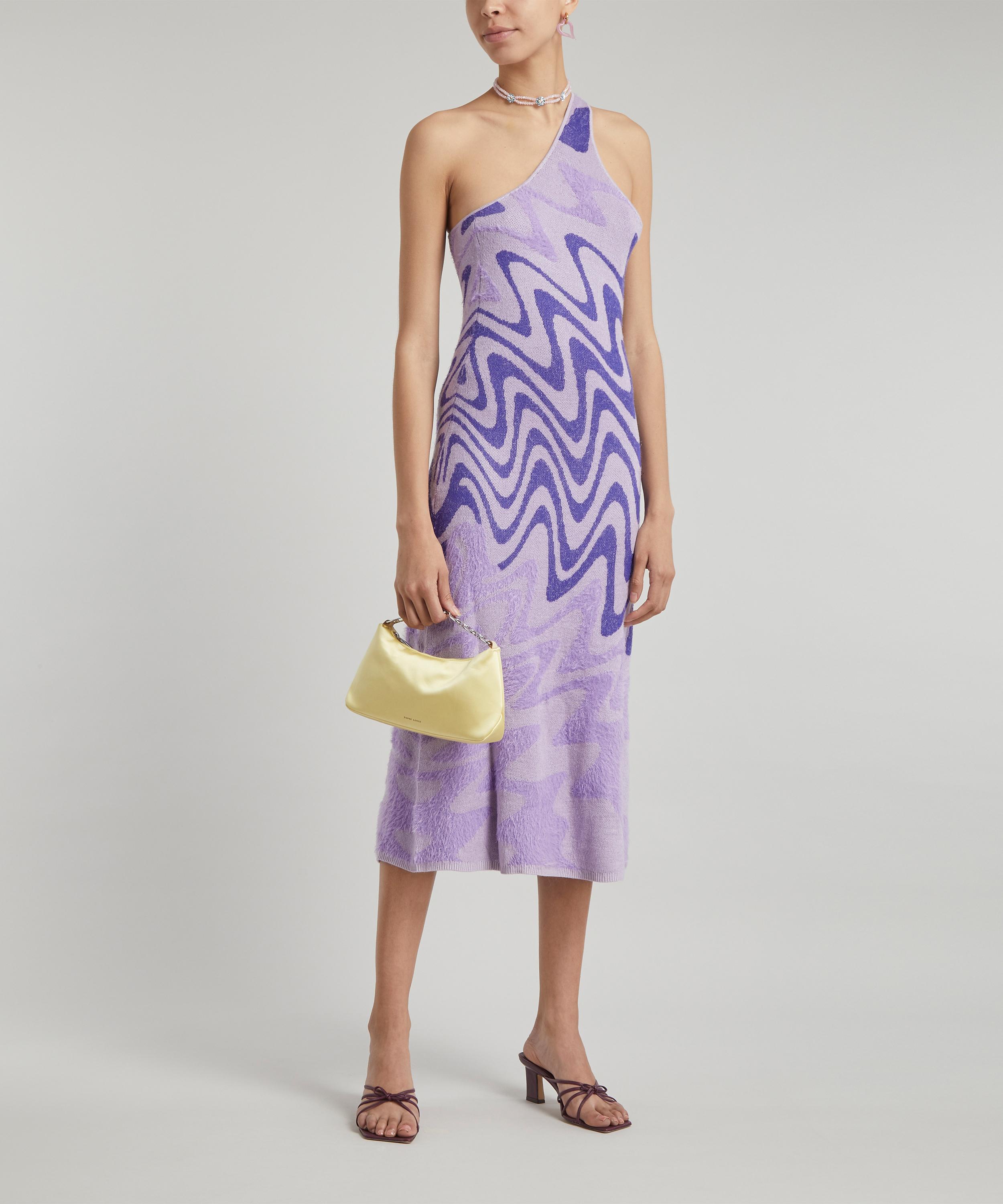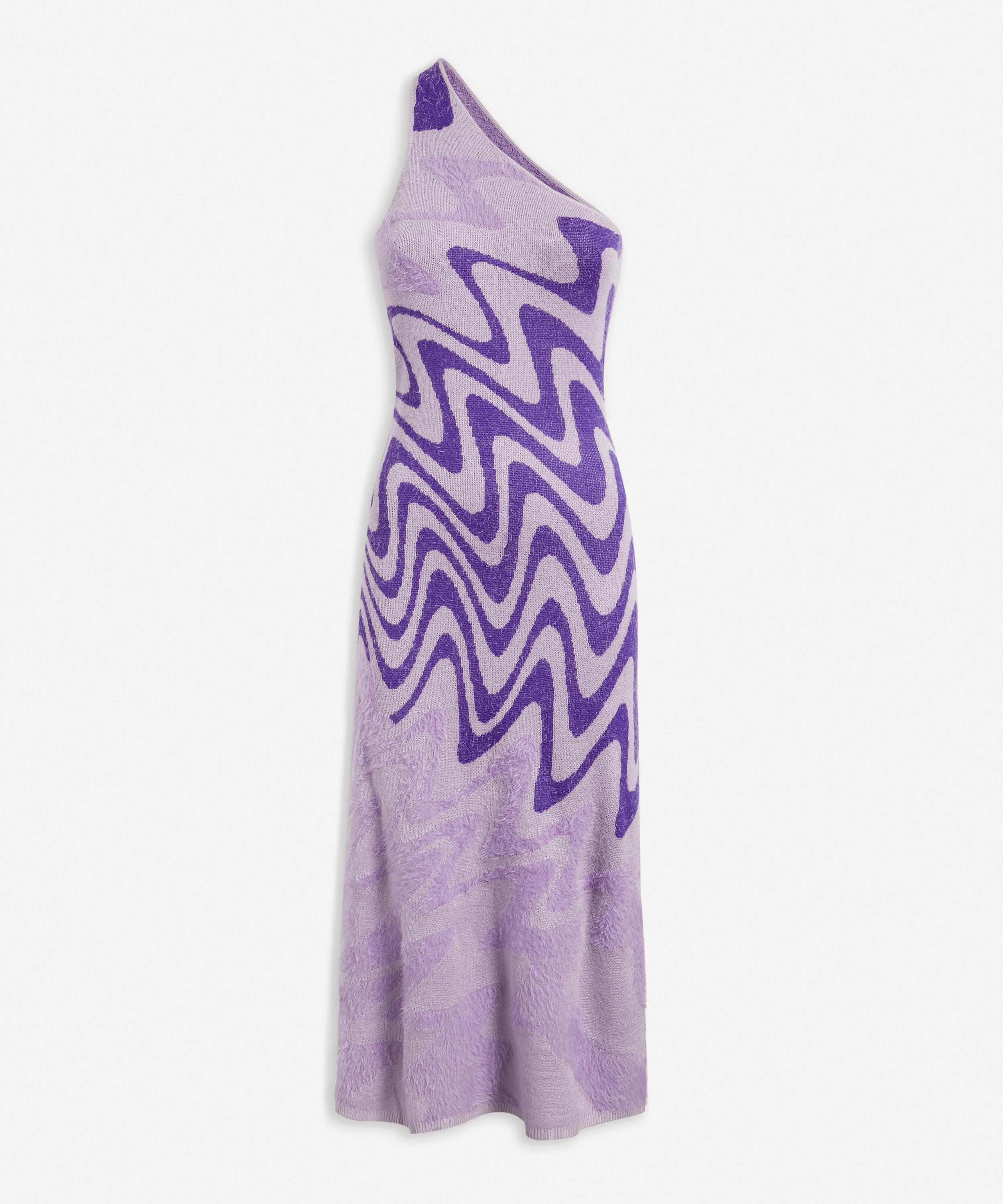 A super soft, figure-hugging knit dress crafted from a luxe vegan yarn, the Wannabe features a statement single-shoulder strap complete with a dramatic cut-out back, secured by a pearl-embellished spaghetti strap. Embossed with the brand’s classic wavy print in a medley of purple and lilac tones, it will embolden your evening edit when simply paired with strappy sandals.
