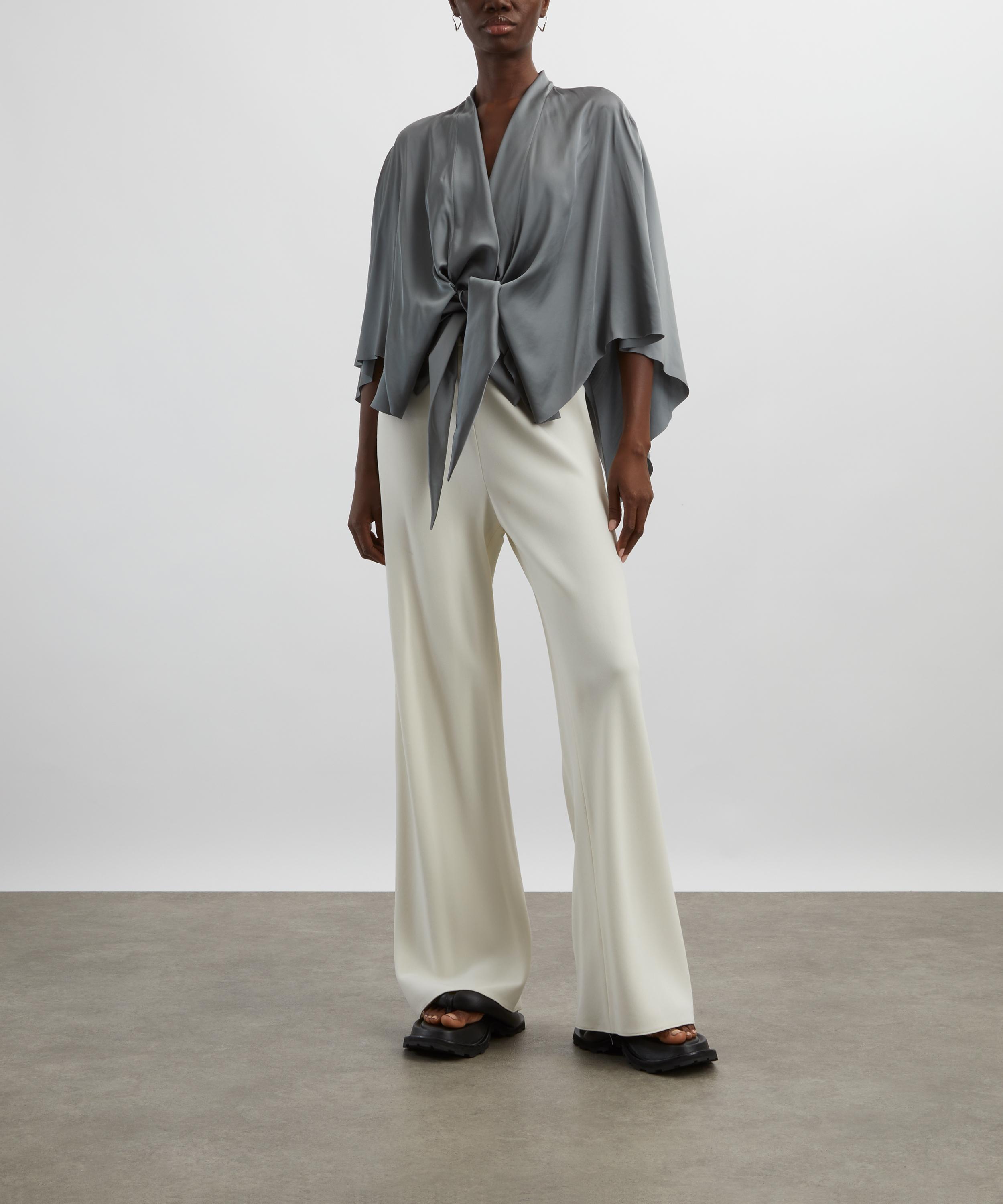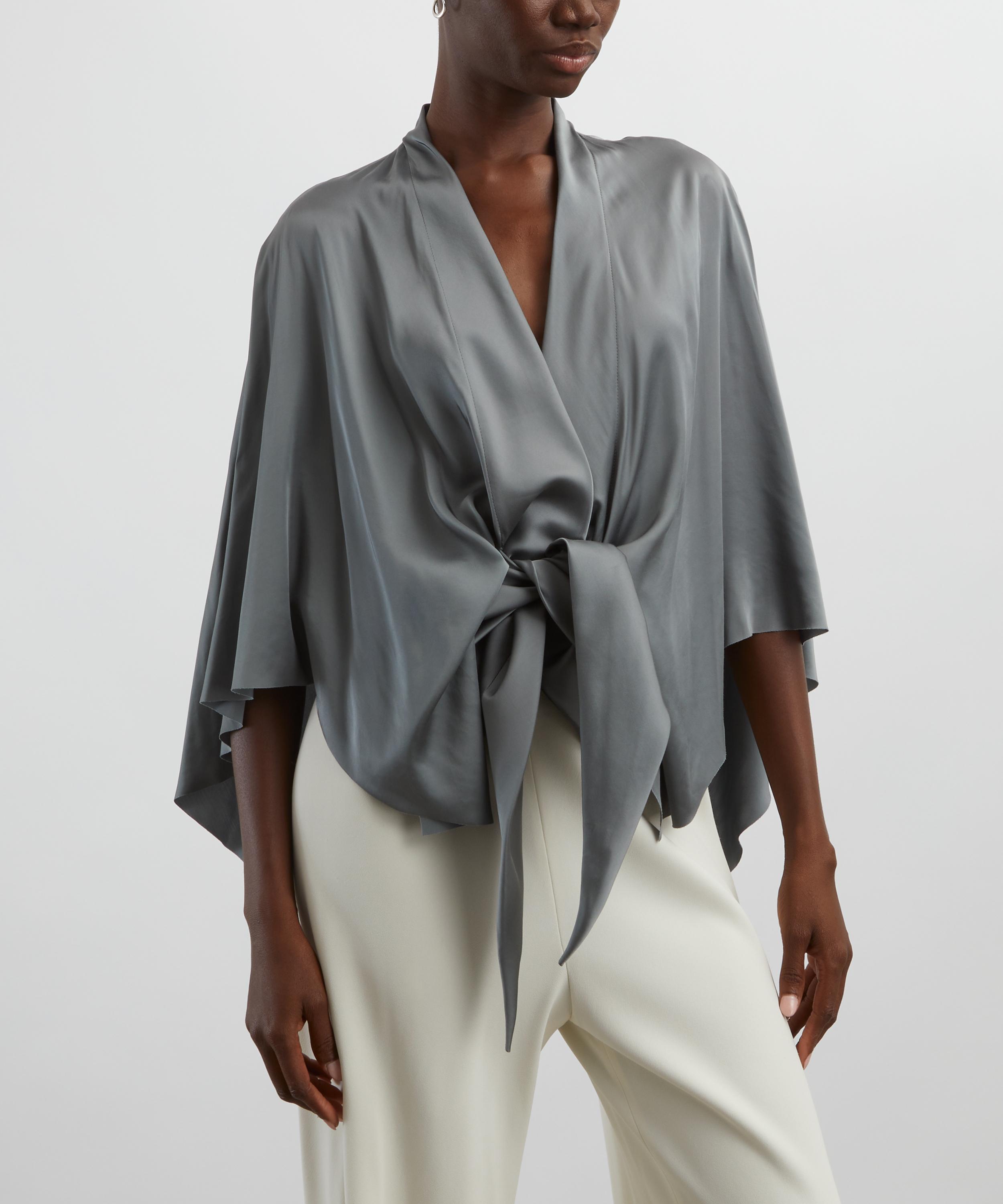 Crafted from lightweight, fluid charmeuse, the Half Moon Top features a softly draped silhouette with long kimono sleeves and a plunging V-neckline. Front ties are designed to twist and wrap around the body, creating an effortlessly elegant shape.
