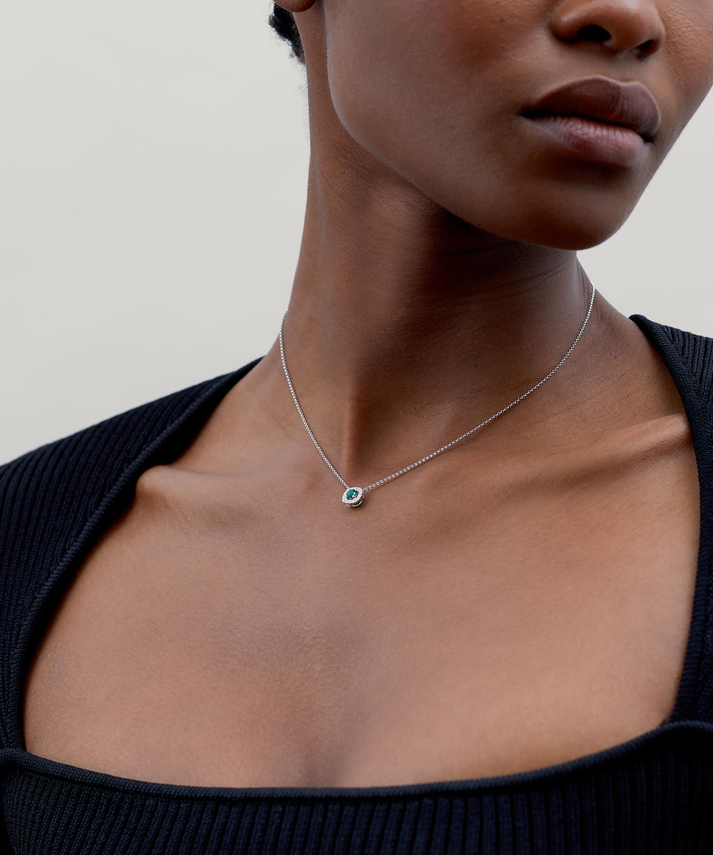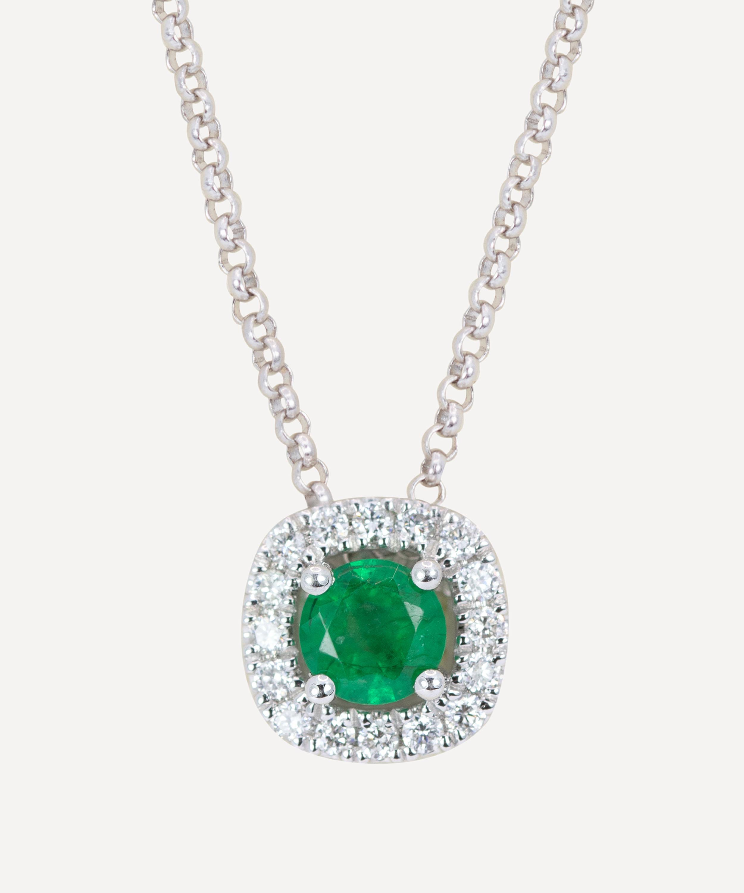 Suspended from an 18 carat white gold rolo chain, this cushion-shaped pendant features a round cut emerald surrounded by a halo of round, brilliant cut white diamonds in a cluster of claw settings. Offering a modern alternative to the brand's signature elaborate antiques, style it with pulled-back hair and a pair of coordinating diamond stud earrings for an unforgettable evening look.