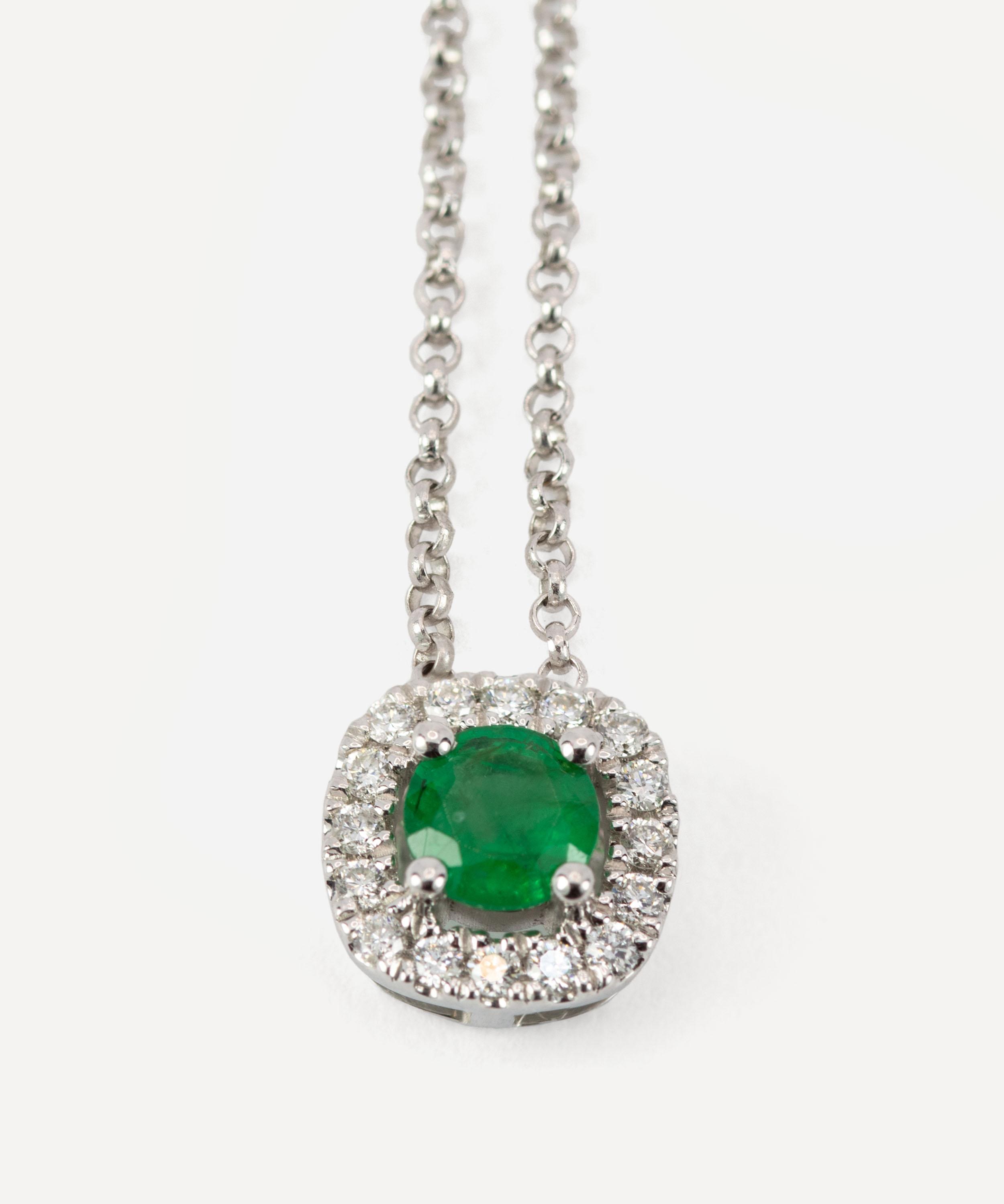 White Gold Emerald and Diamond Cluster Pendant Necklace
