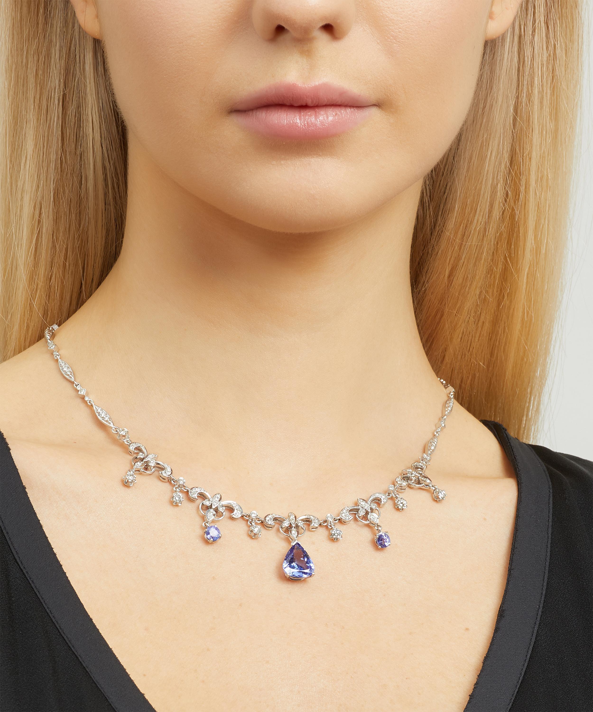This necklace is characterised by a slim, multi-link chain with five stylised fleur-de-lis motifs at the centre and a rope-effect hook fastening at the back. The entire design is encrusted with 1.65 carats of brilliant cut white diamonds, while three mixed-cut tanzanite stones and several diamond drop charms fall from the front for a dazzling fringed effect. An elegant example of timeless vintage jewellery, wear this piece alone against a bare décolletage, or style it with pulled-back hair and a pair of coordinating diamond earrings for a show-stopping evening look.
