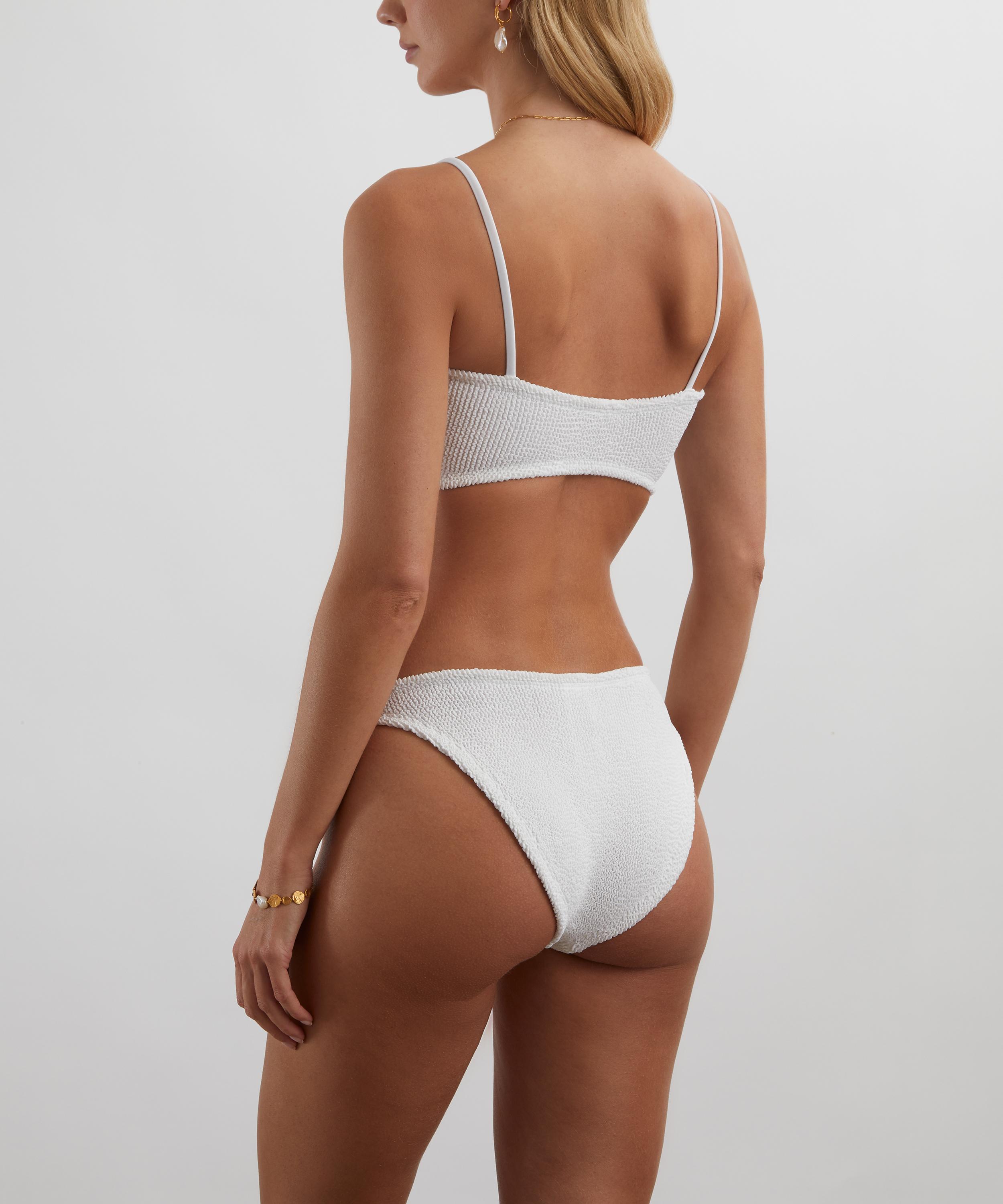 Crafted from the label’s signature crinkle material for a comfortable, flattering fit every time, this white two-piece bikini exudes ‘80s retro glam with its skinny straps, skimpy coverage, and exclusive pearly hoop fixtures.