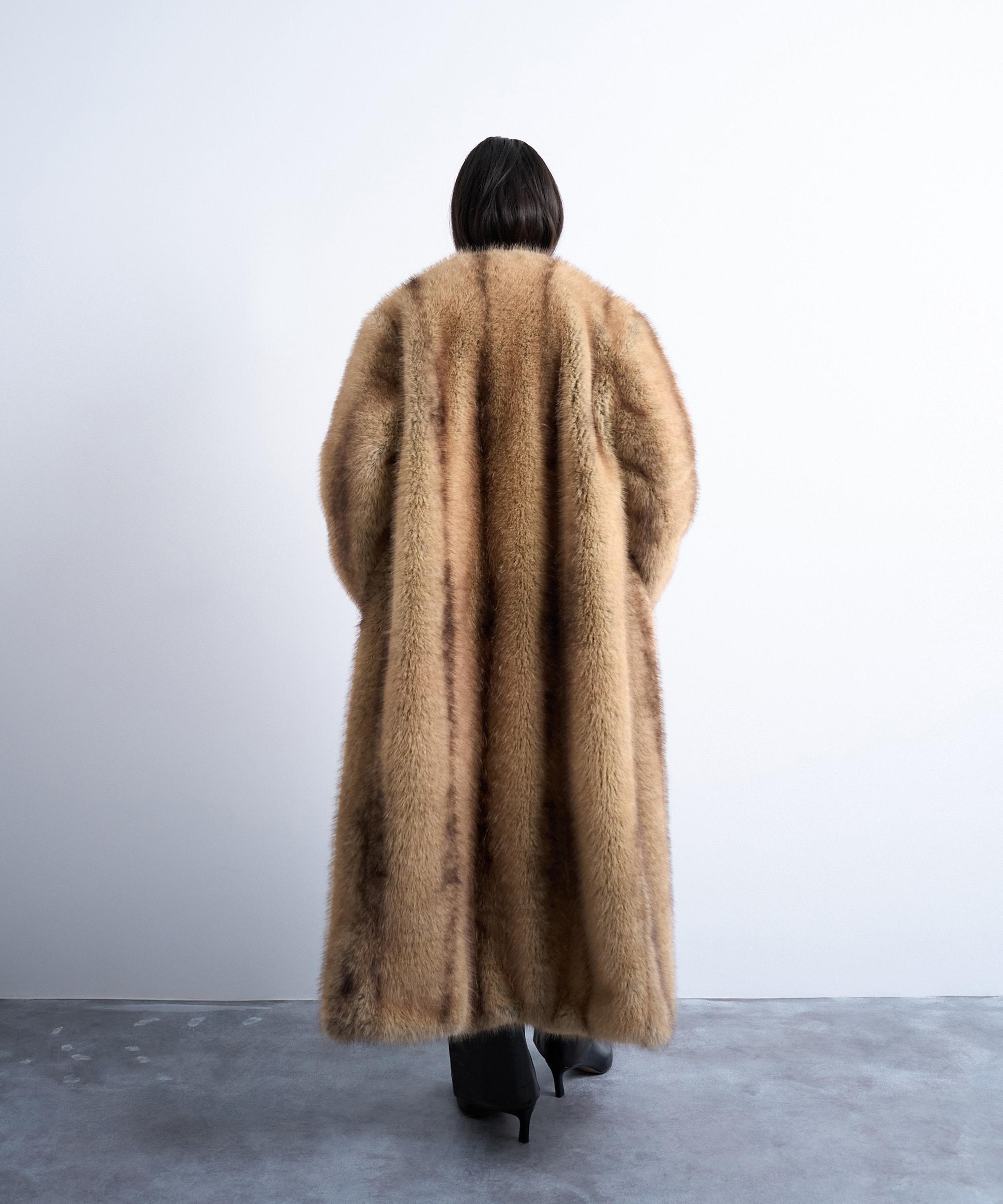 Crafted from plush faux fur with a mottled stripe pattern, this mid-length coat is designed for a relaxed fit with a collarless neckline, long sleeves, and side pockets - perfect for staying warm and stylish through the cooler months.