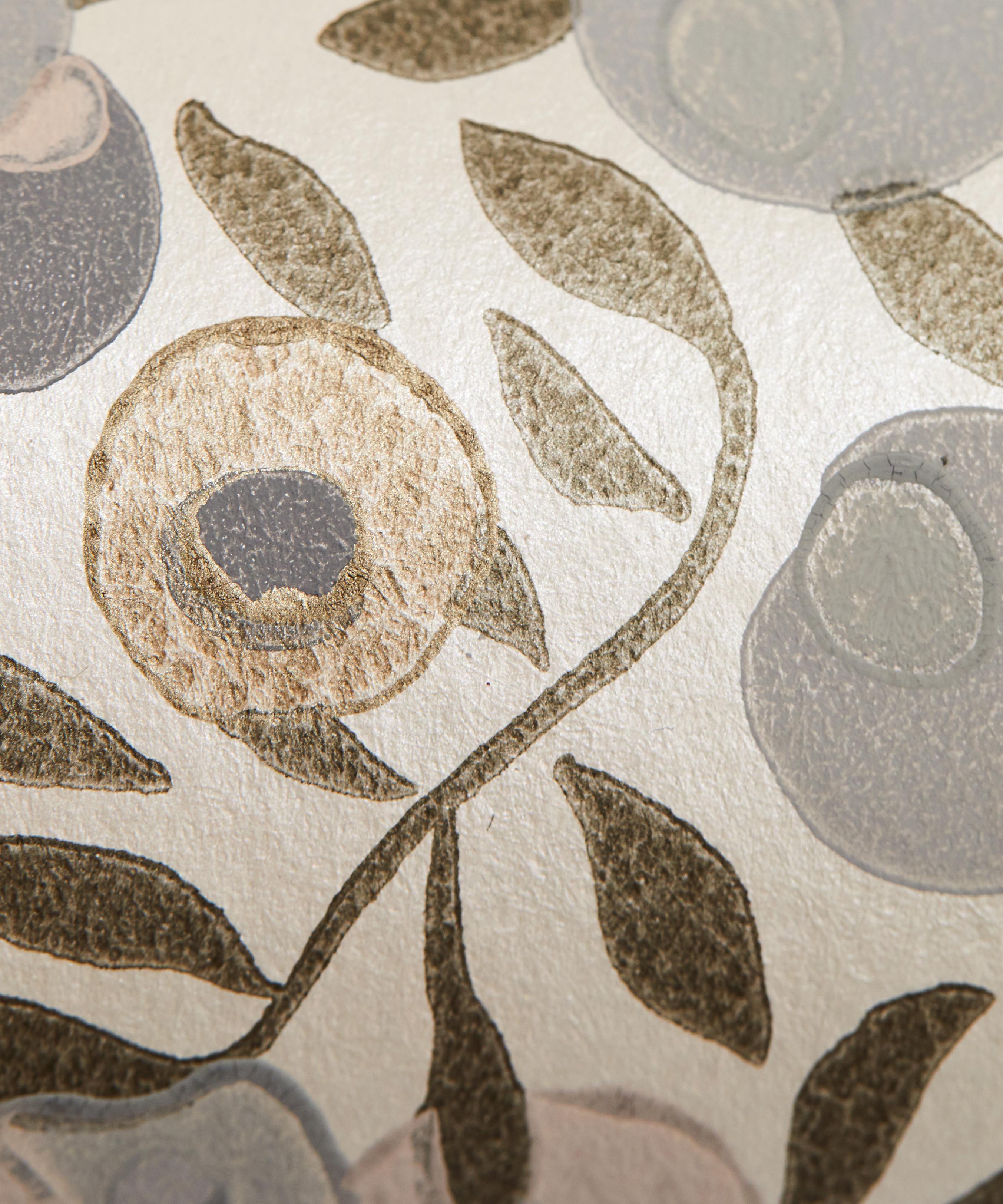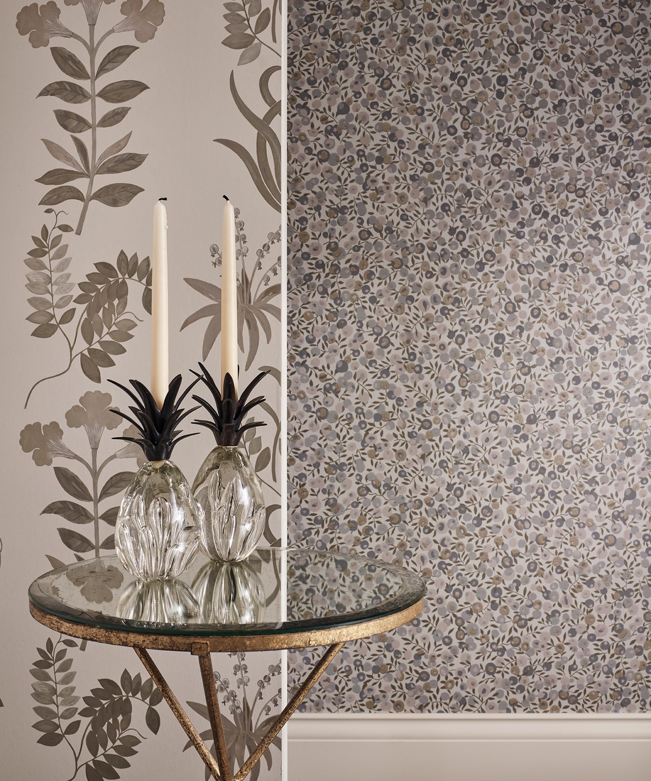 For Wiltshire Blossom, the most iconic 1930s leaf-and-berry Liberty print is repainted and re-engineered into a contemporary furnishing design. It is printed using a hybrid technique which allows both flat colour and raised reticulated pigment to sit side by side, providing a beautiful tactility and clarity of print mark, rendered in both matte and metallic pigment.