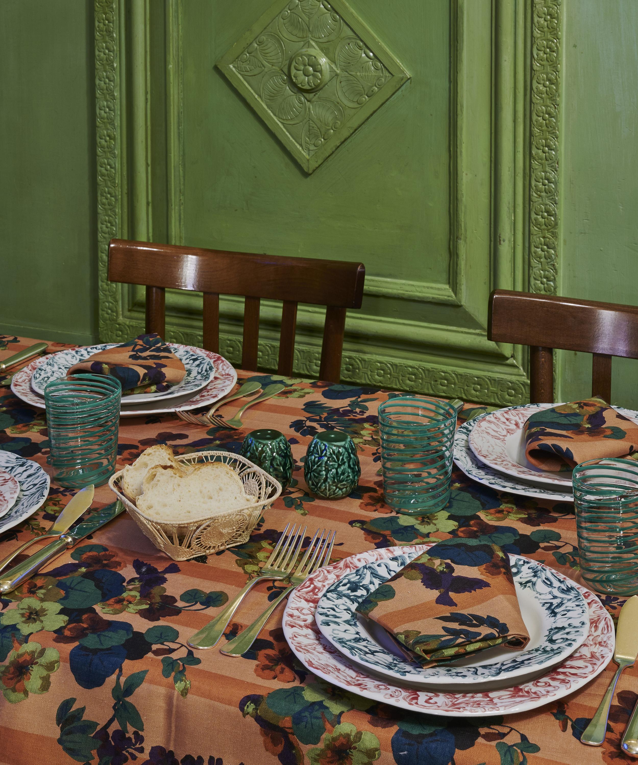 Inspired by the eccentricity and decorative flourishes of Italian design, this square tablecloth is printed with a whimsical wisteria pattern that originates from a collection of late 19th century wallpapers from Genoa - hometown of the celebrated Italian architect and set designer, Renzo Mongiardino. Printed in Italy on pure linen, pair the tablecloth with the matching napkins for a playful splash of print.