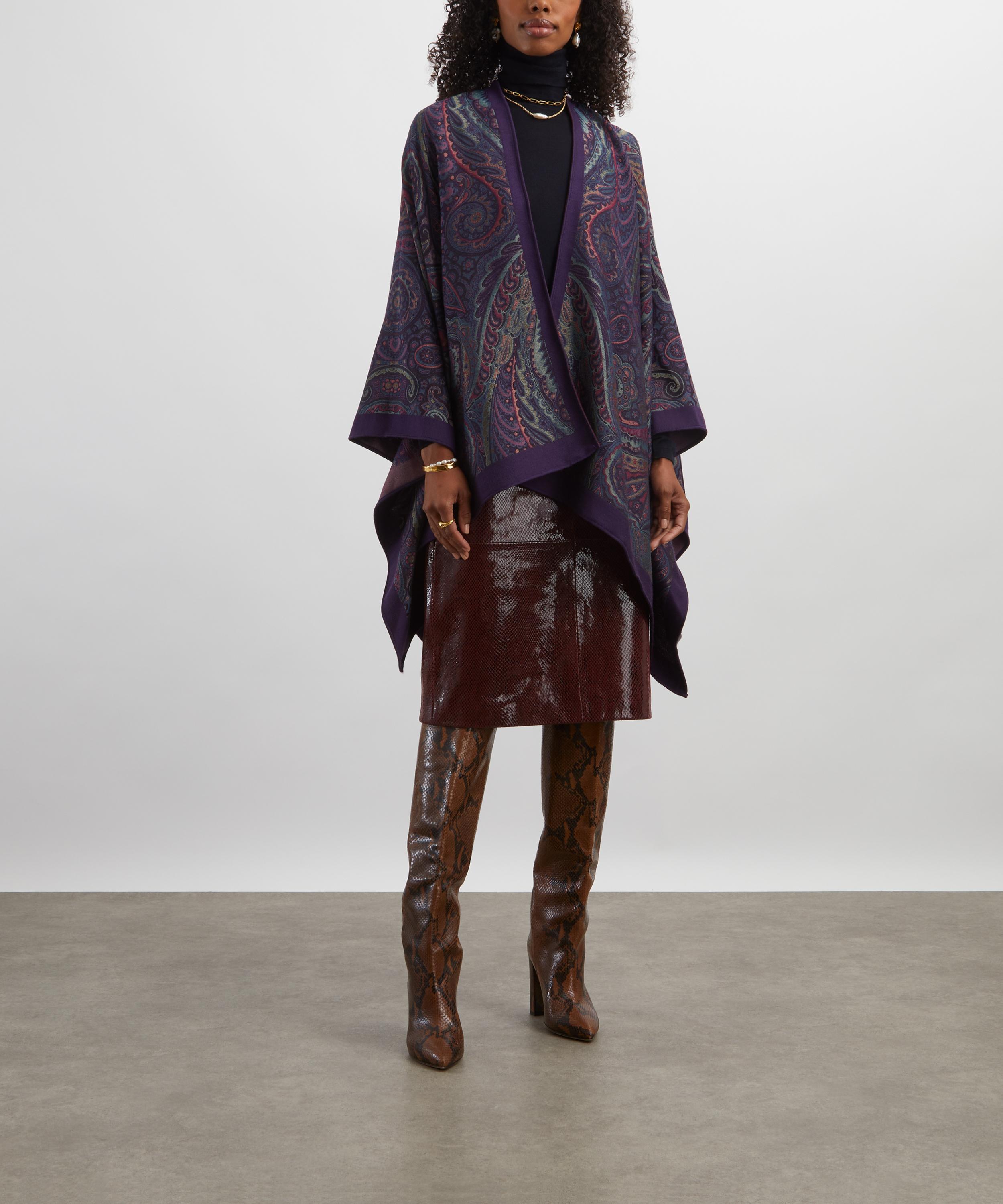 Expertly crafted in Italy from a wool-blend, this poncho is woven all-over with a purple paisley jacquard motif that brings opulence and flair. The relaxed drape and open front is framed by contrasting edging, adding definition to its fluid silhouette.