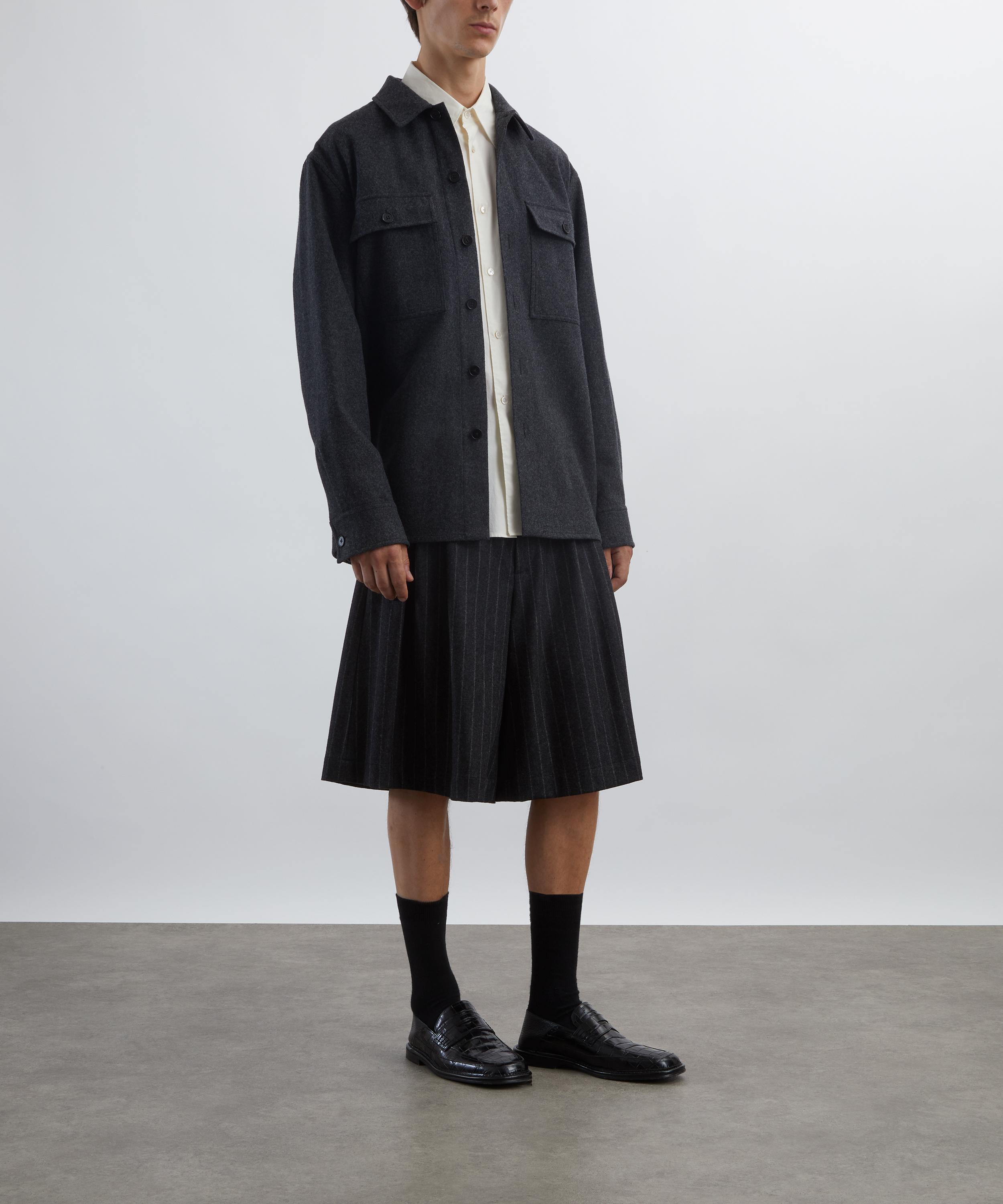 Crafted from pure virgin wool, this shirt jacket offers a laid-back, luxurious take on classic workwear styles. Cut for a relaxed fit, it’s detailed with a button-front closure and two chest flap pockets, lending a subtle utilitarian edge.