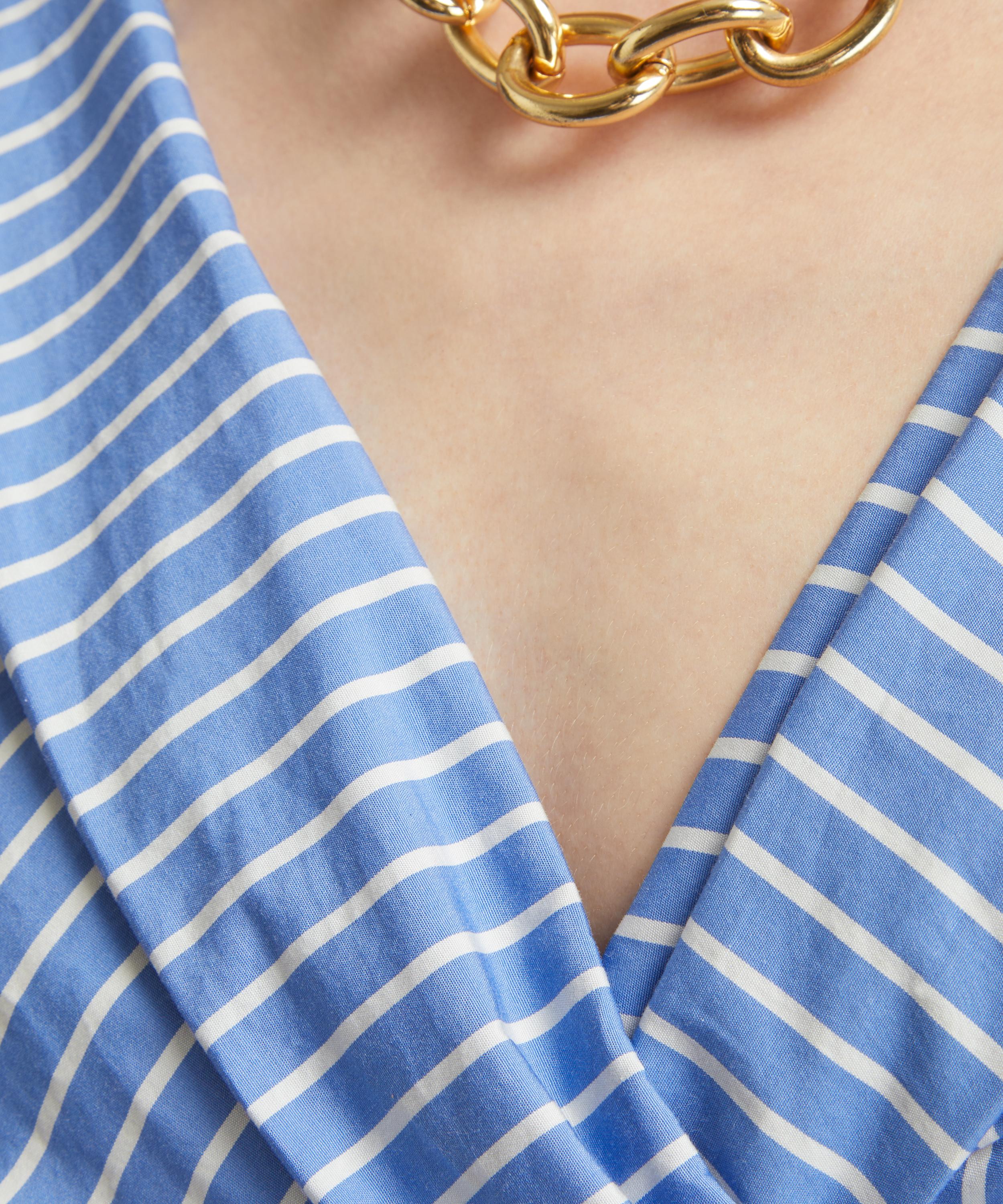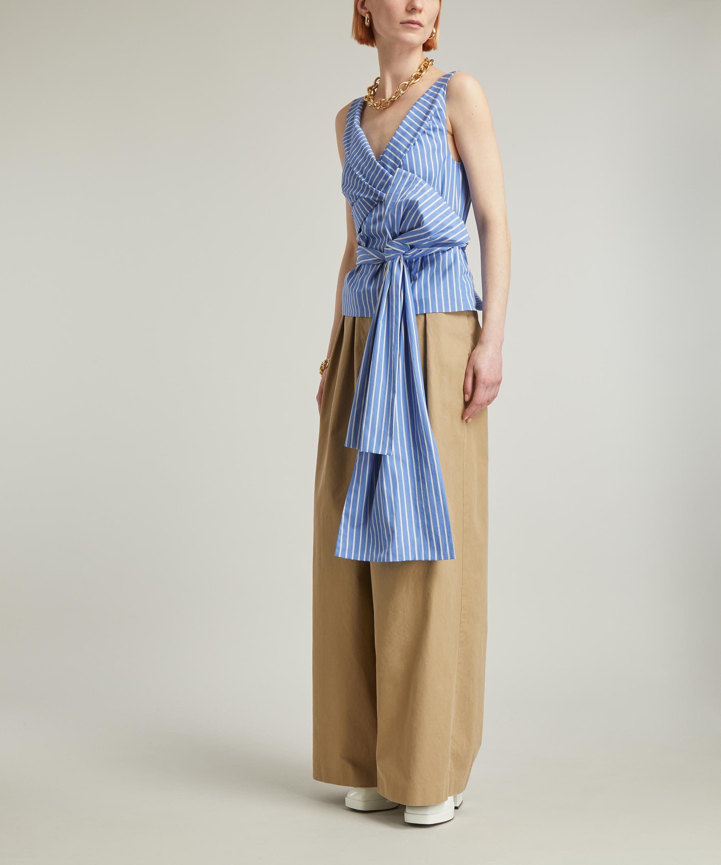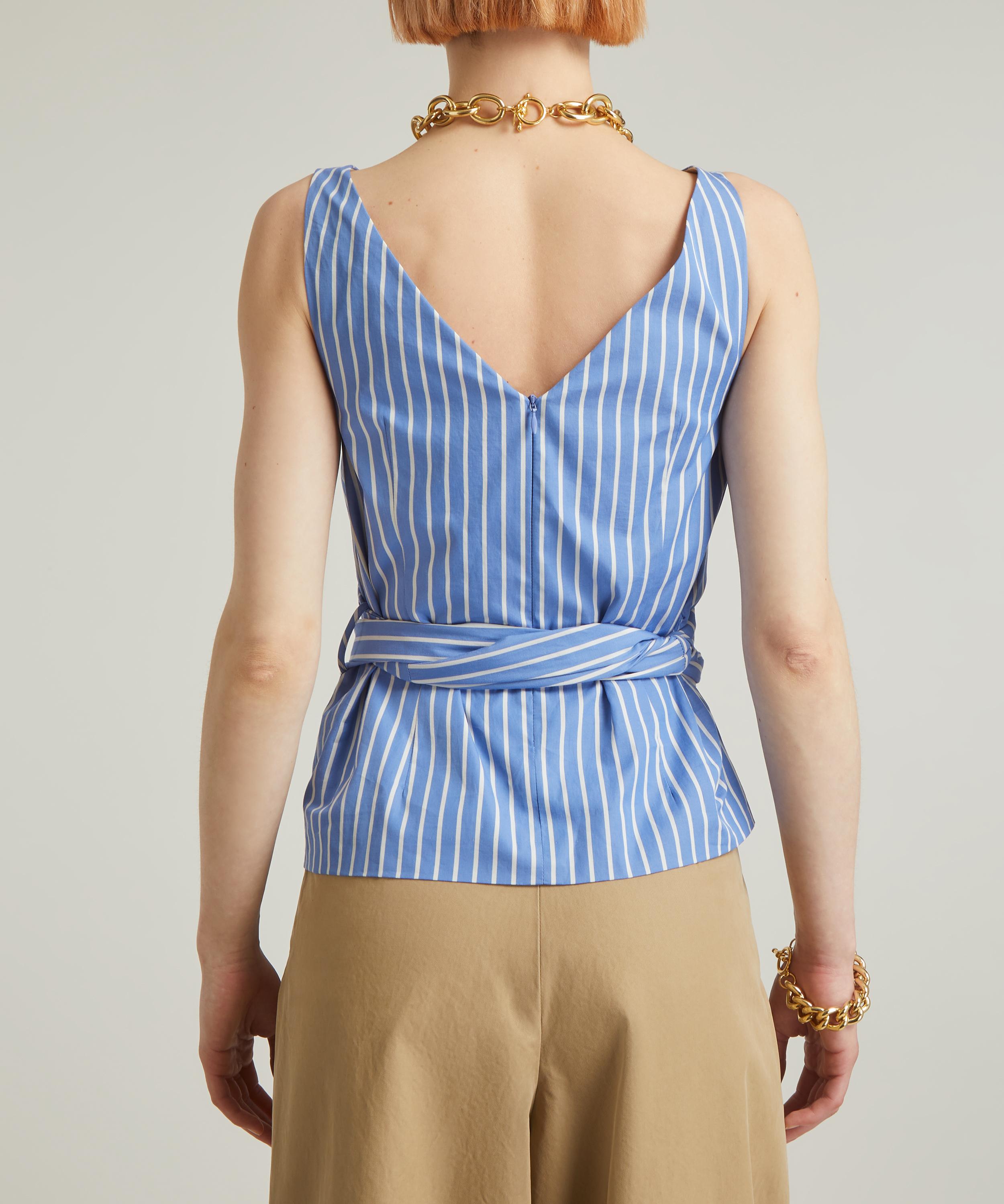 Crafted from cotton presenting a pale-blue pinstripe pattern, this sleeveless V-neck top is secured with adjustable ties that can be fashioned into a bow.