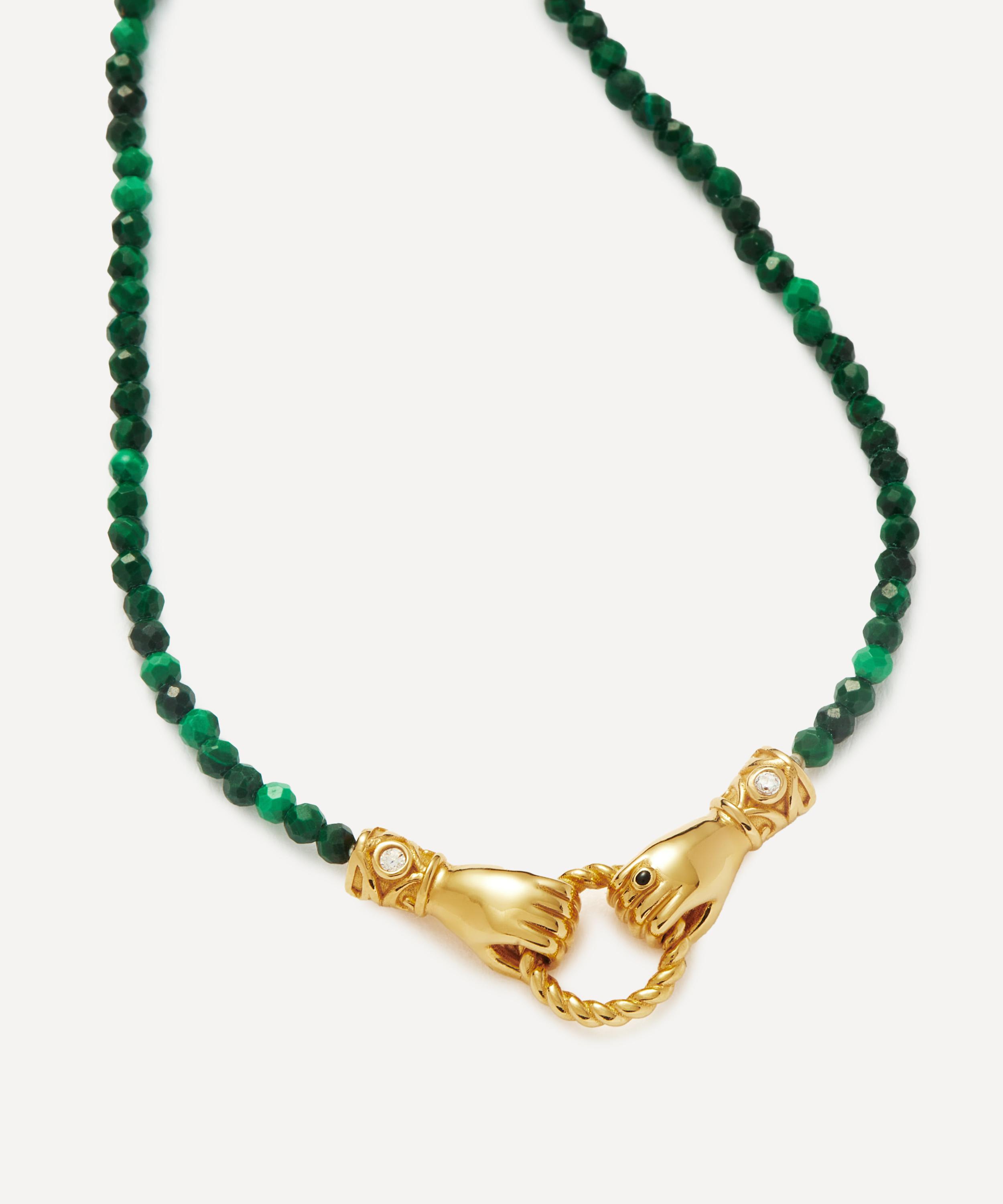 Curate your own bespoke stack with this gemstone bracelet from the Harris Reed x Missoma collection. Crafted from gold-plated brass, it’s made up of green malachite beads and two Georgian-style hands, inspired by the collections popular ‘In Good Hands’ design, holding a twisted ring. Each cuff has been embellished with a white cubic zirconia and one hand features a black enamel ring. Wear it solo, or team with an assortment of bracelets or matching pieces from the collection.